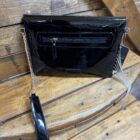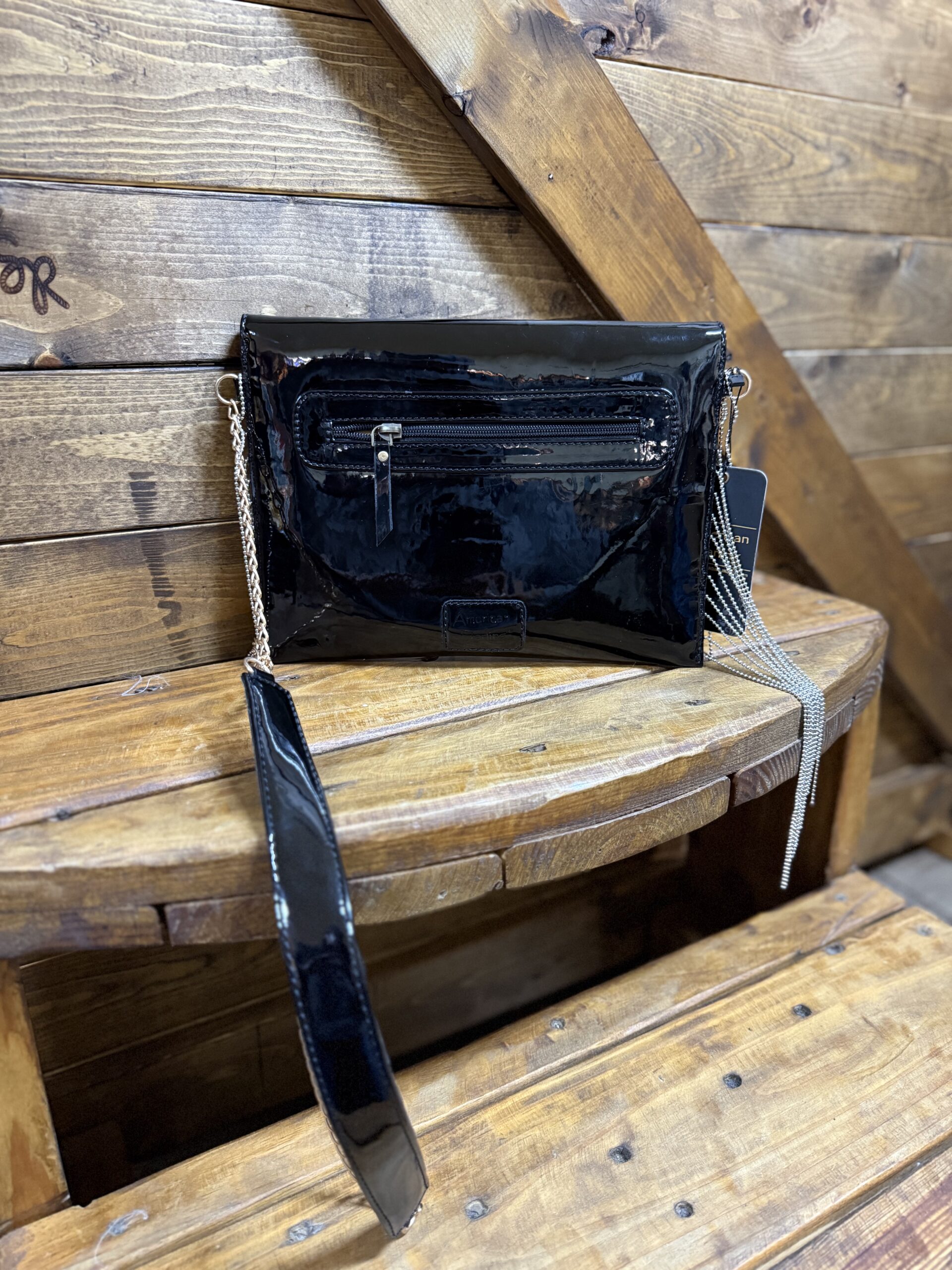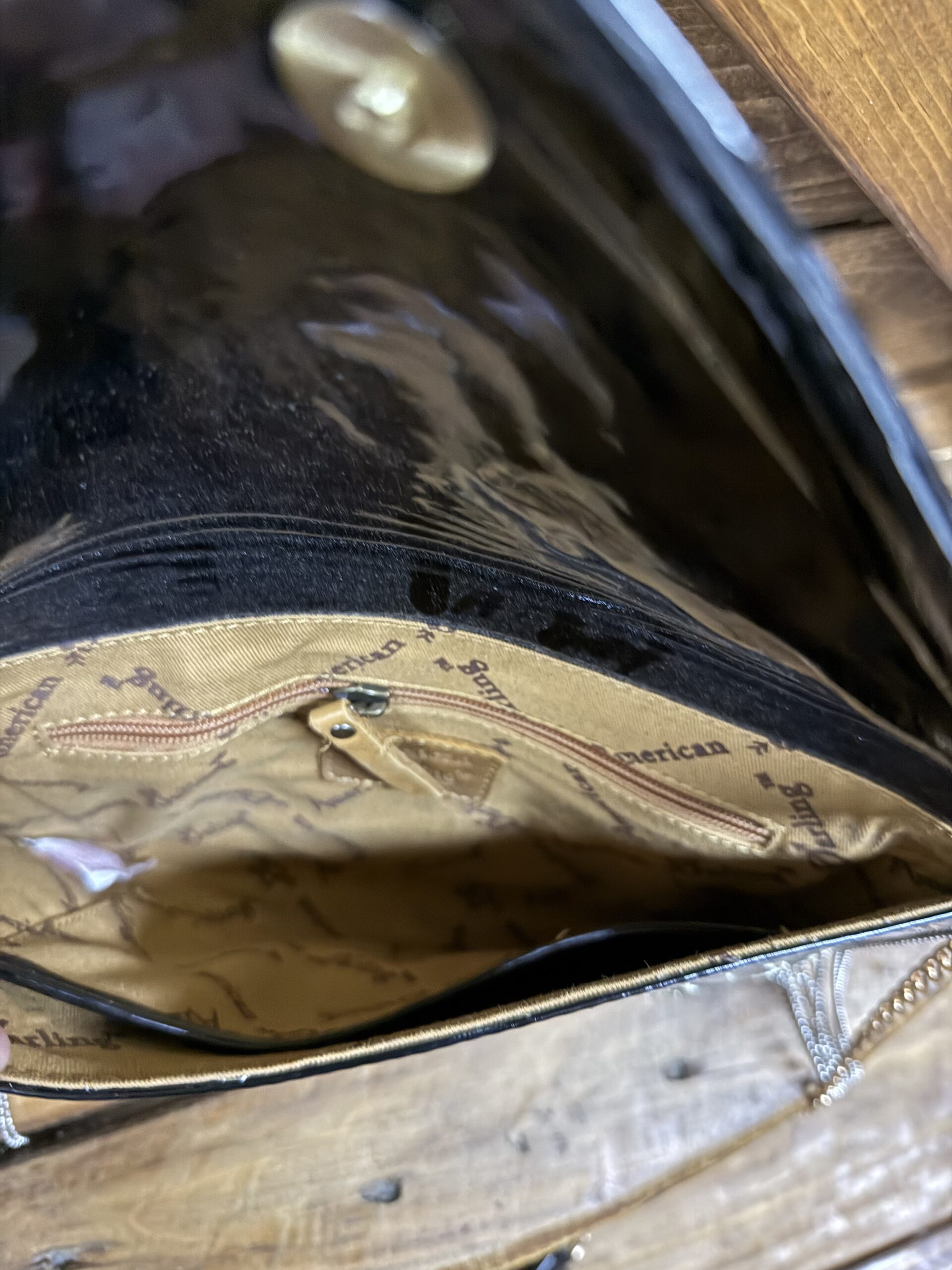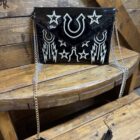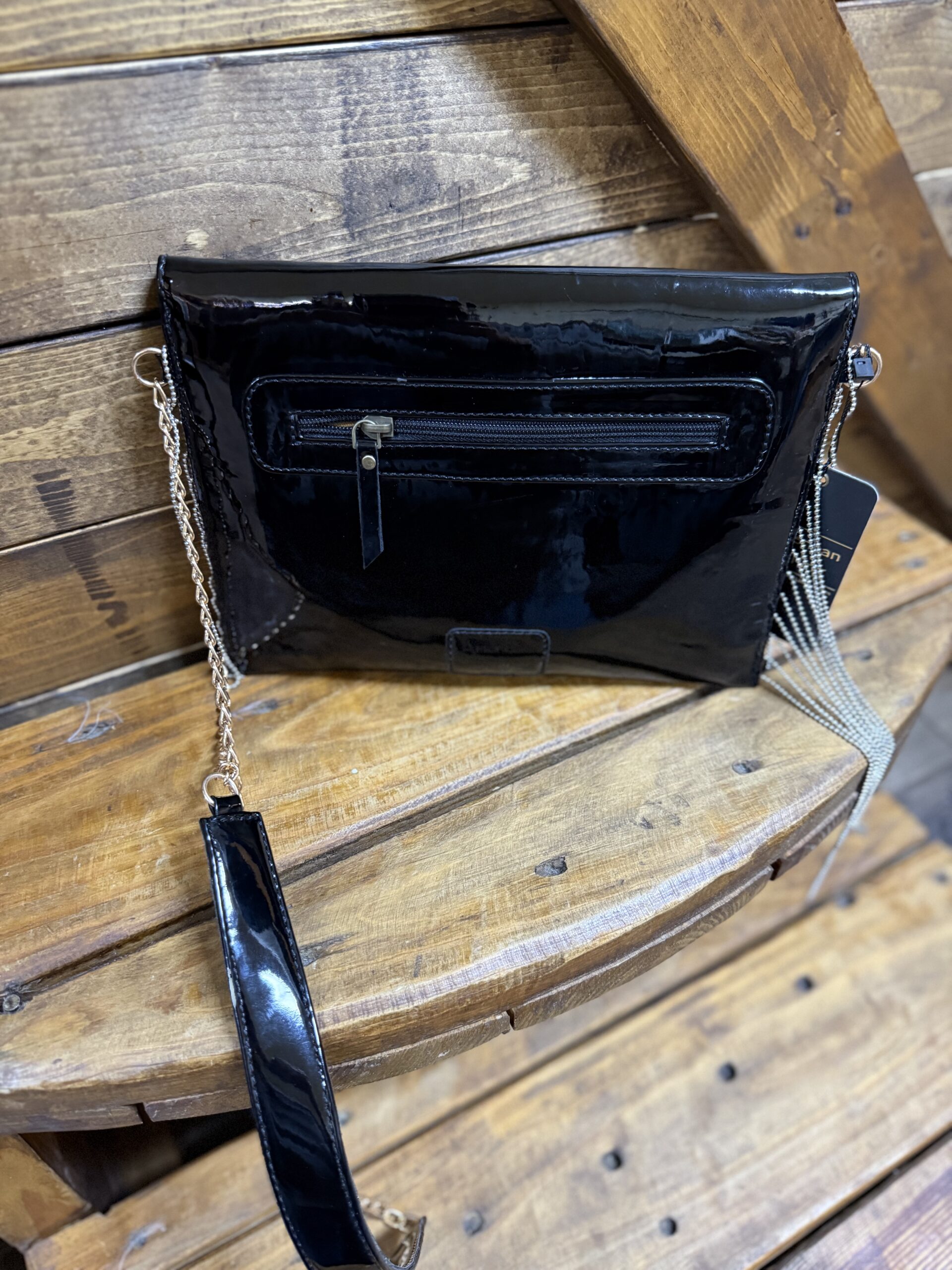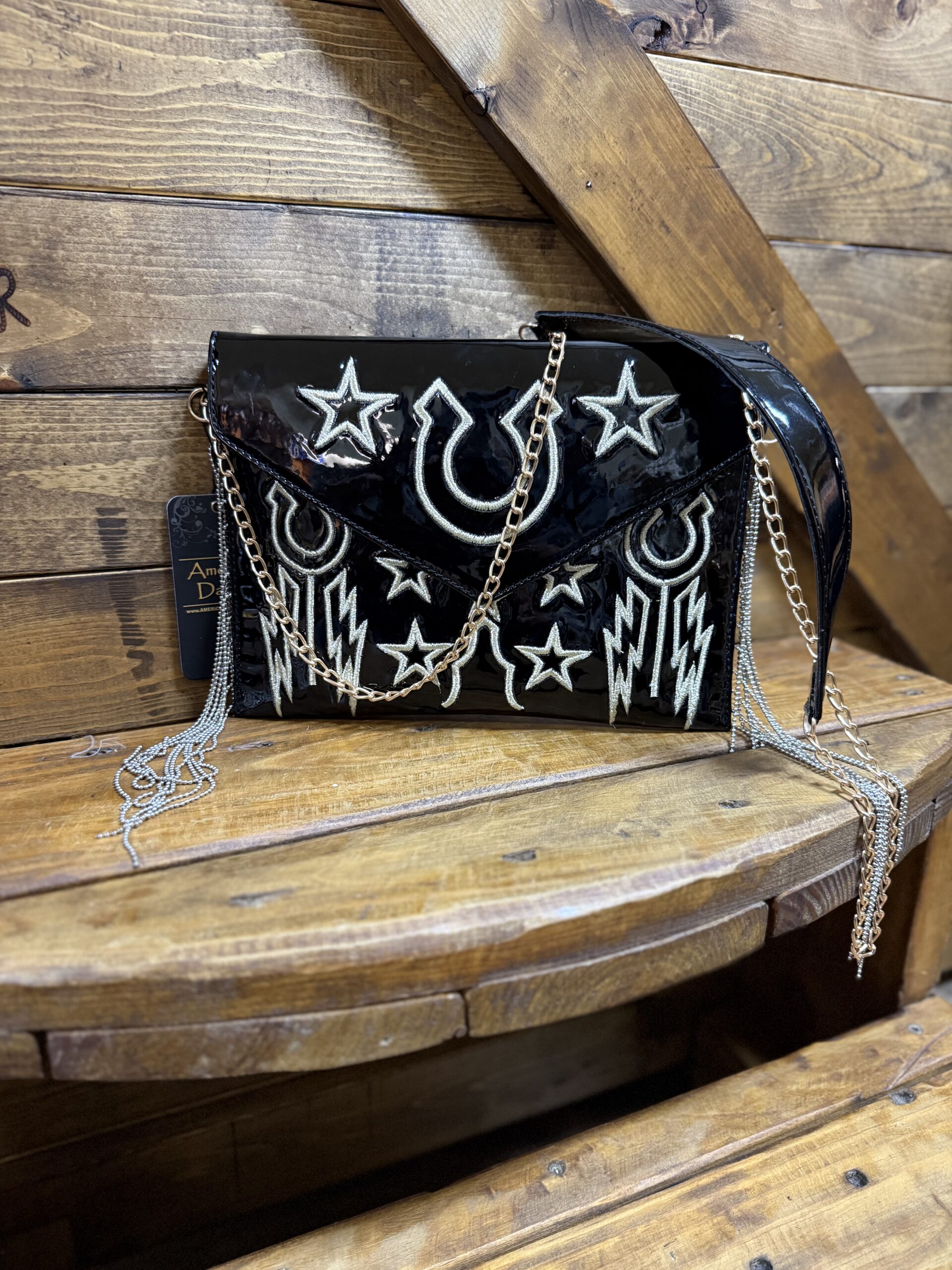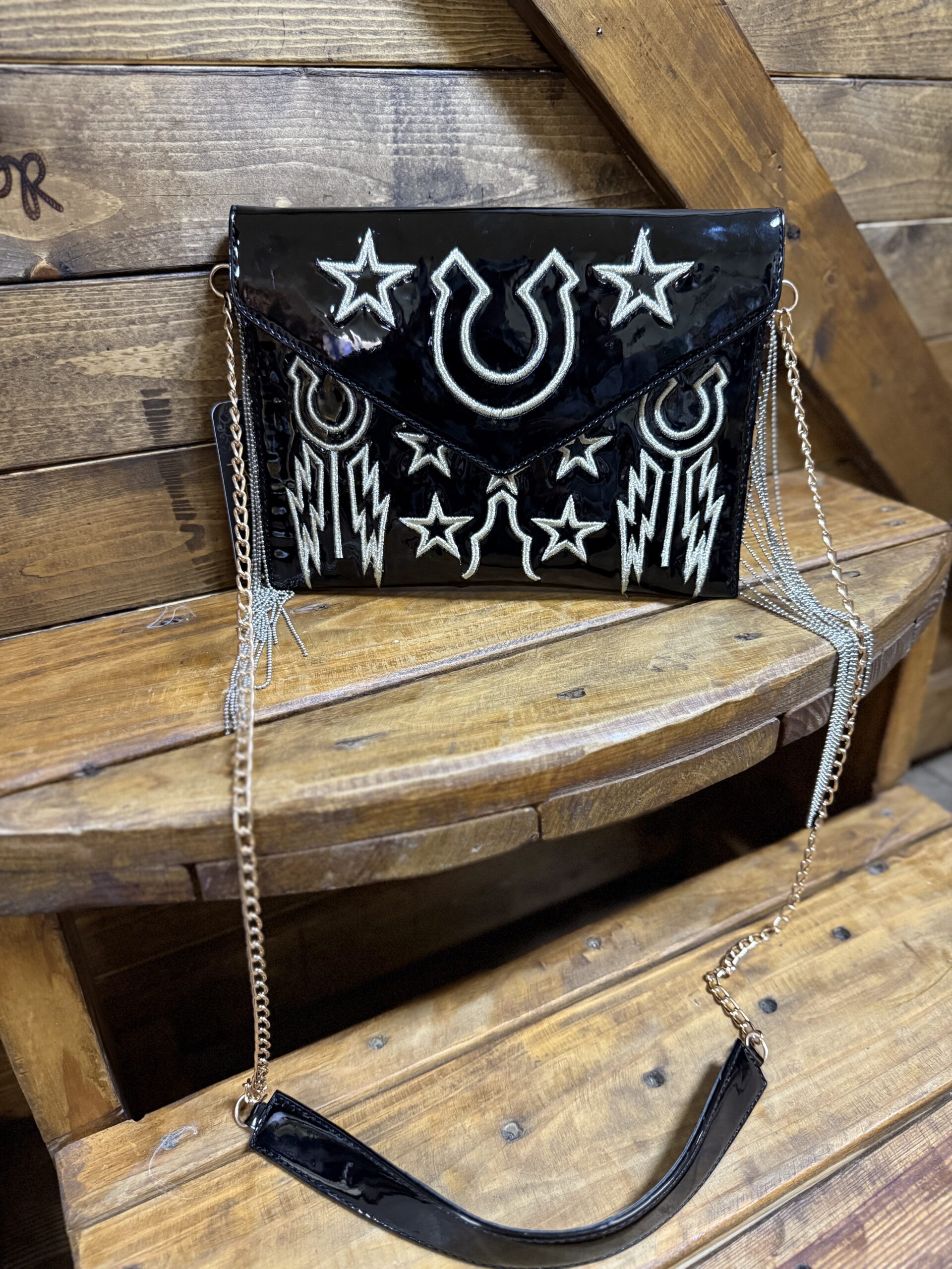 Helllllooooooo! So pretty and so fabulous! We are in love with this style and all of the small details! Beautiful black patten leather finish featured on a flat bodied purse. The metallic embroidery on the shiny black is stunning! The western symbols of horseshoes, stars, and lightning bolts have us patiently waiting on Vegas. The sides are dripping with pretty little chain fringe and the shoulder strap is a trendy golden chain with the shoulder piece in the matching black patten. It opens on a magnetic snap button under the flap into a single compartment with slip pockets on one side and a zipper pocket on the other. The back is detailed with a centered zipper pocket. What are you waiting on? Its waiting on you!