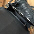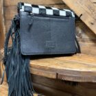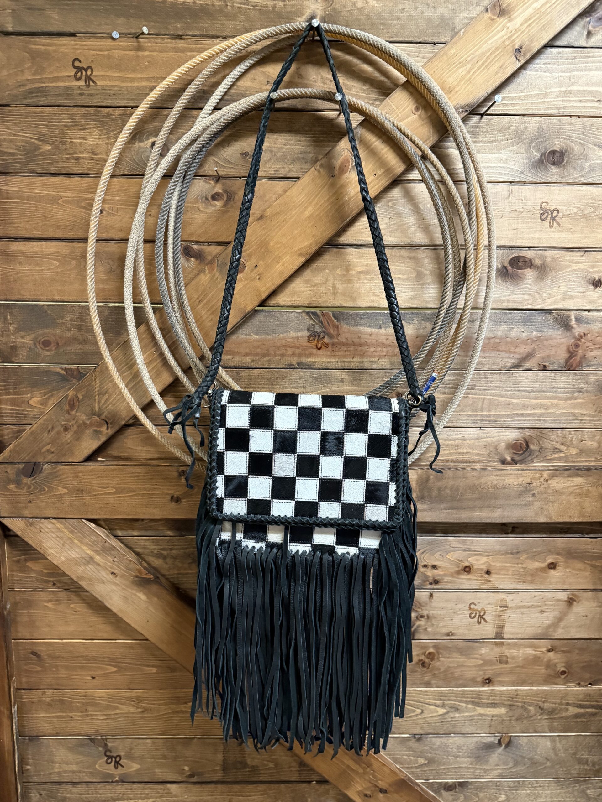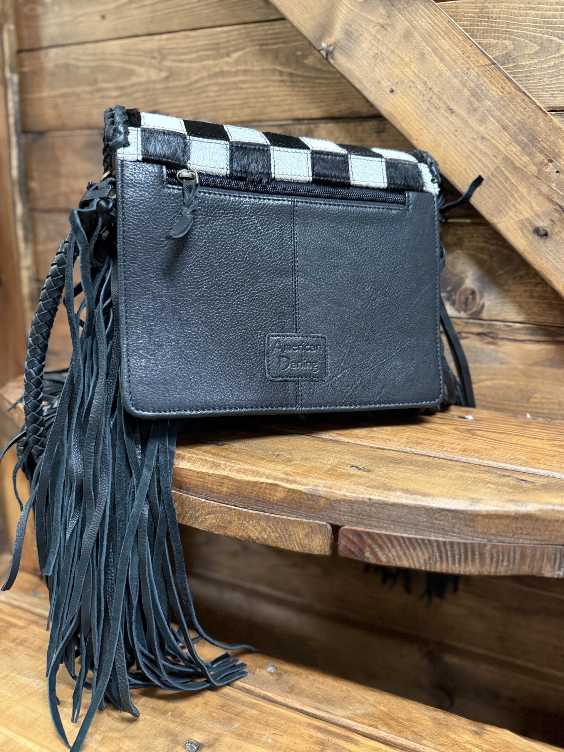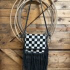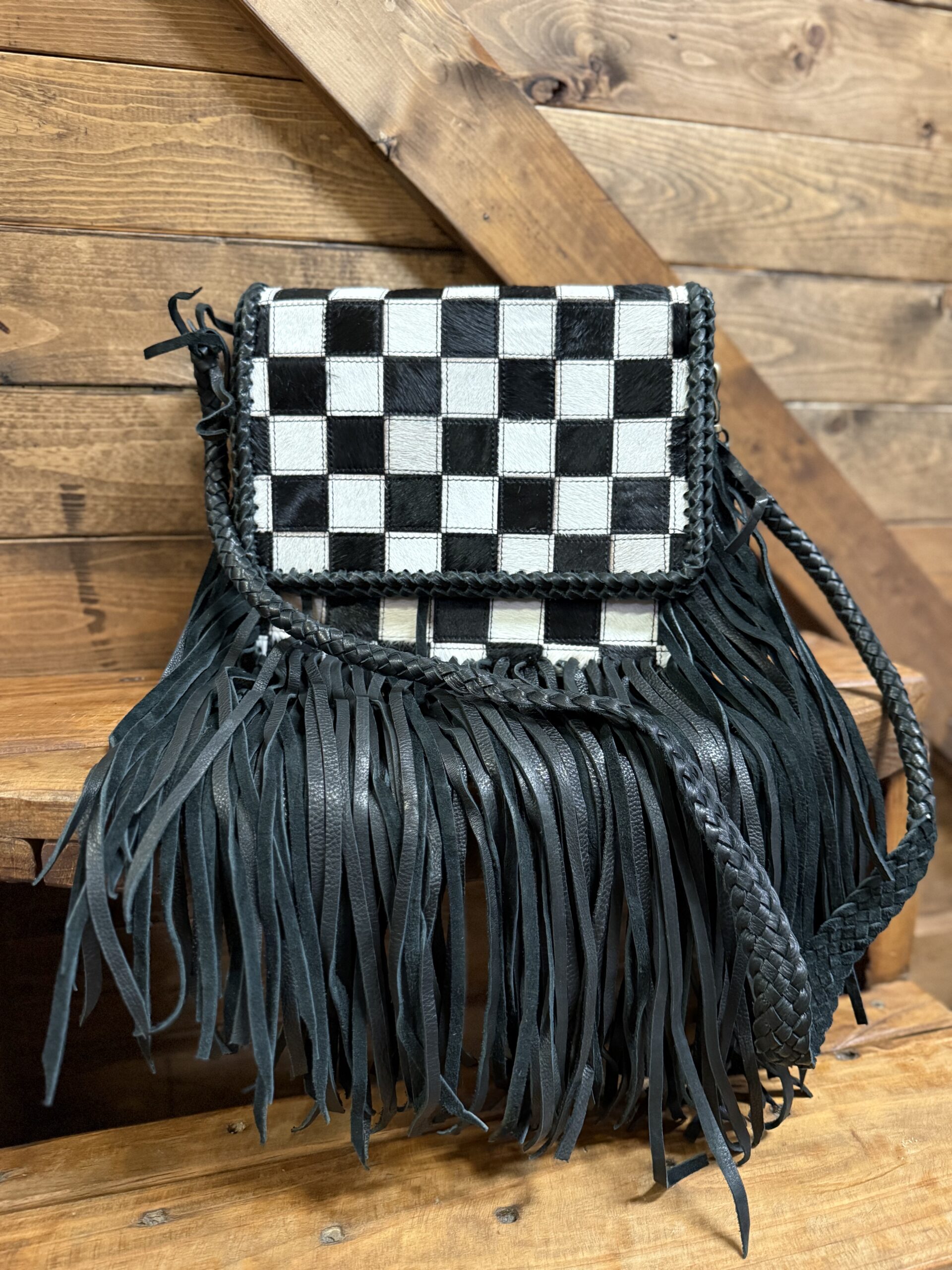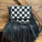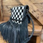 Checkered…..yes please! We are in love with the black/white checkered pattern. The deep rich black hair on hide combined with the imperfect white hair on hide is simply gorgeous! The pattern come down over the front flap and the underneath leaving the back slide black leather with a zipper pocket. The front flap closes on a magnetic snap in the center that is not visible from the outside. Braided leather edges come down around the front flap. The same braided leather makes up the shoulder strap with a flat braid where it lays on the shoulder. The strap is easily removed with the clasp hooks. The purse opens up into a large single compartment with a full length slit pocket on one side and a zipper pocket on the other. Luscious black leather fringe drapes down both sides and again across the bottom. The look you want is here! Just fill this beauty with all your goods and accept all the compliments that are to come your way! Its a showstopper!!!