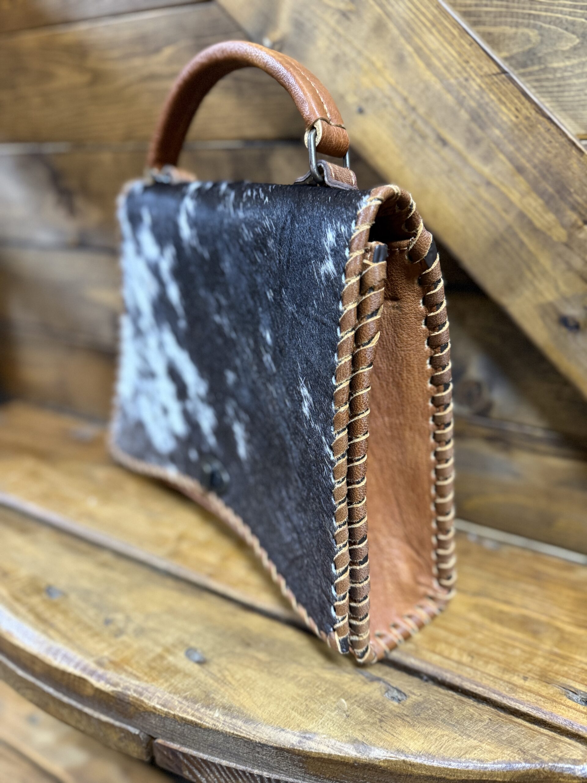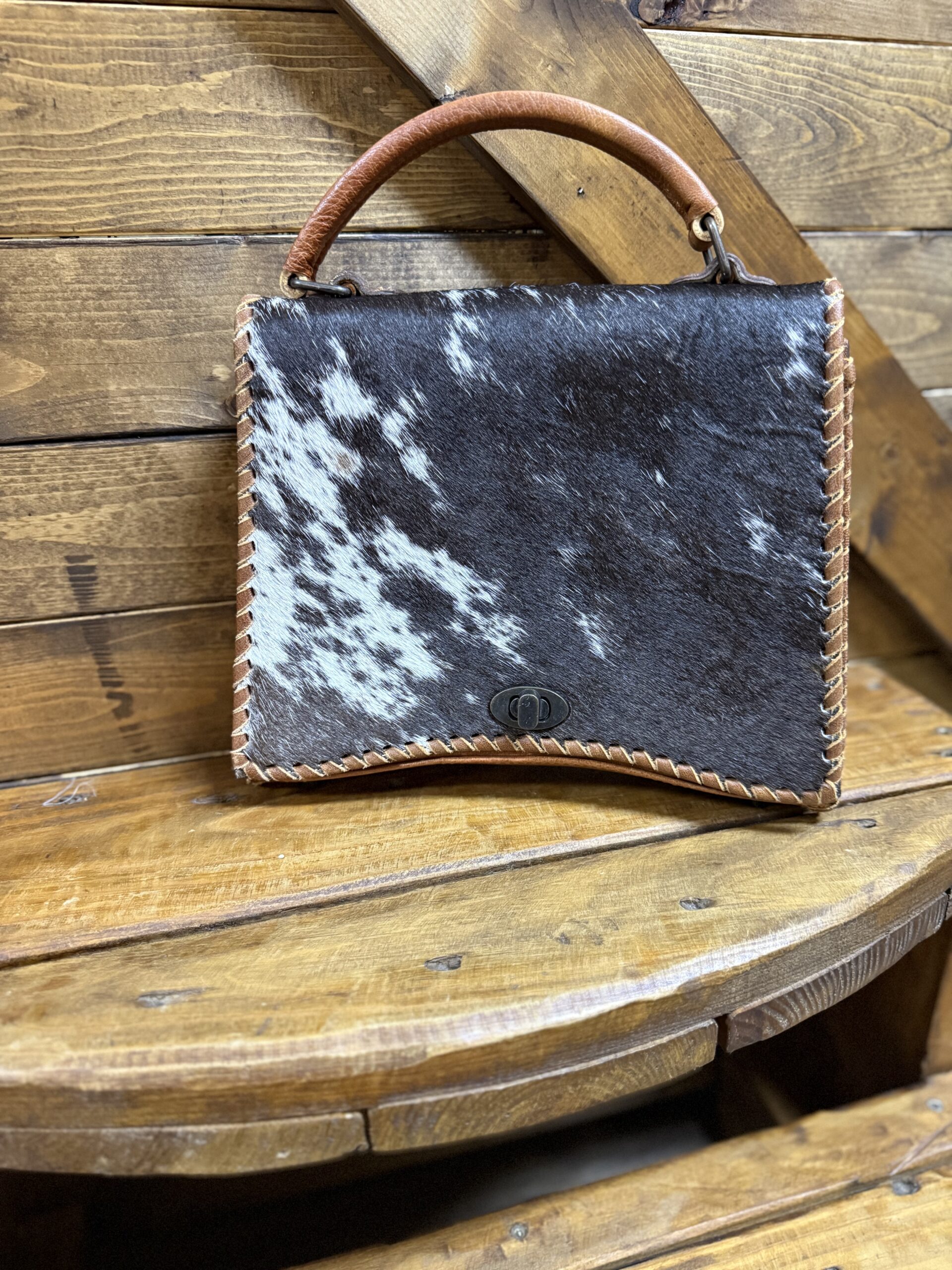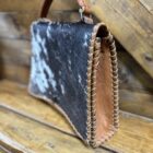 Beautifully designed with the classic western women in mind. Make a statement featuring classic western leathers of cowhide and a smooth grain finished leather. The front features a large piece of hair on hide detailed around the edges with a leather lacing. The back side is that of a smooth grained leather, as is the sides, and features a centered zipper pocket. A small matching leather handle is attached at the top of the purse allowing you to carry it on your arm or comfortably in your hand. A strap is easily attached at each of the ends with a hook clasp. The bag opens on a toggle button into a single compartment with a slip pocket on one side and a zipper pocket on the opposite side. Classy in style, beautiful in makeup!