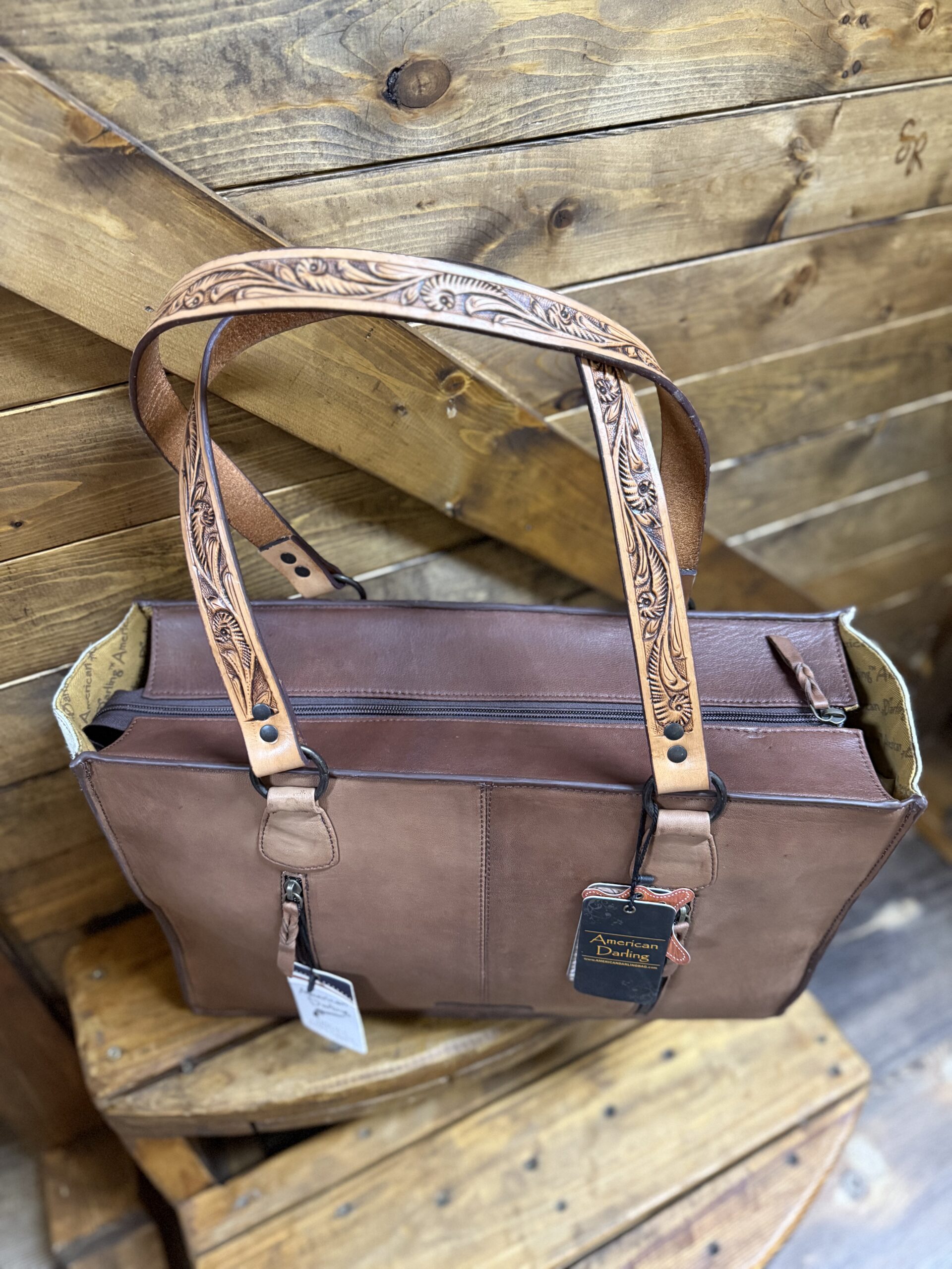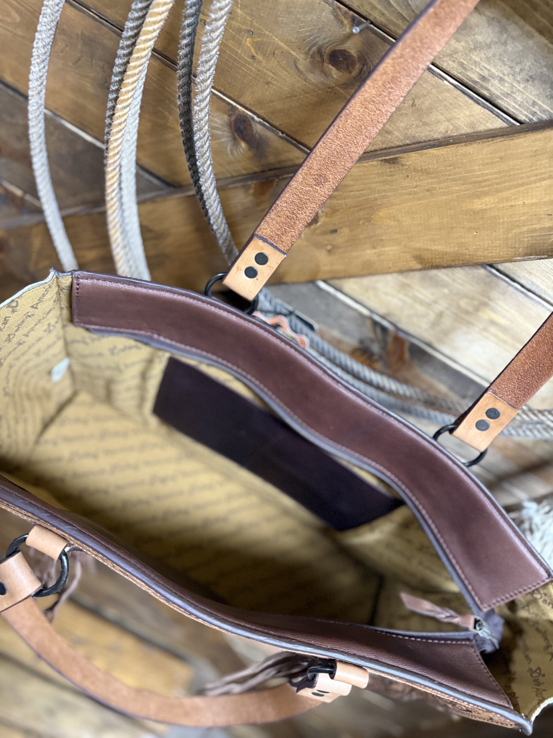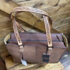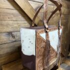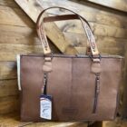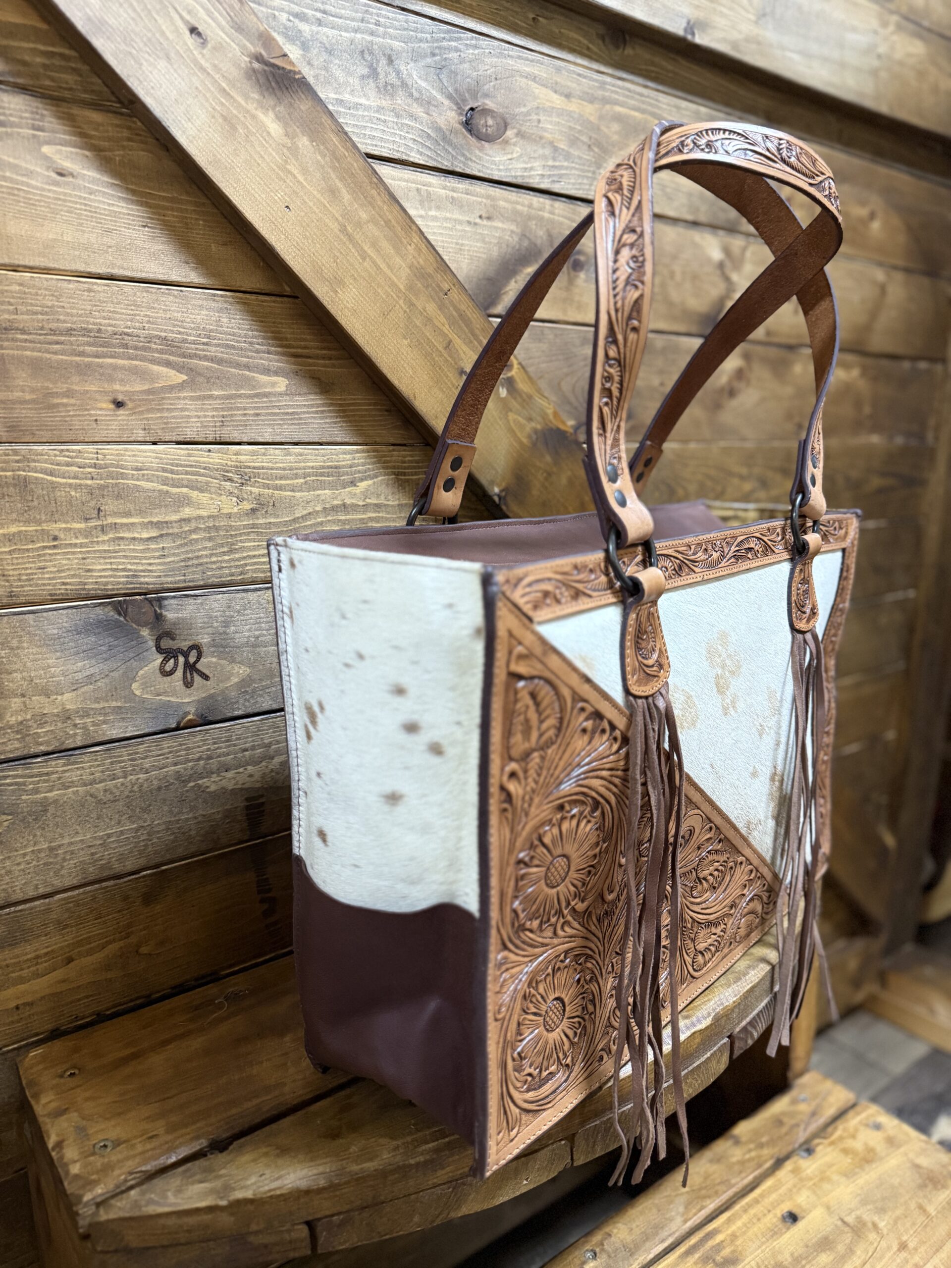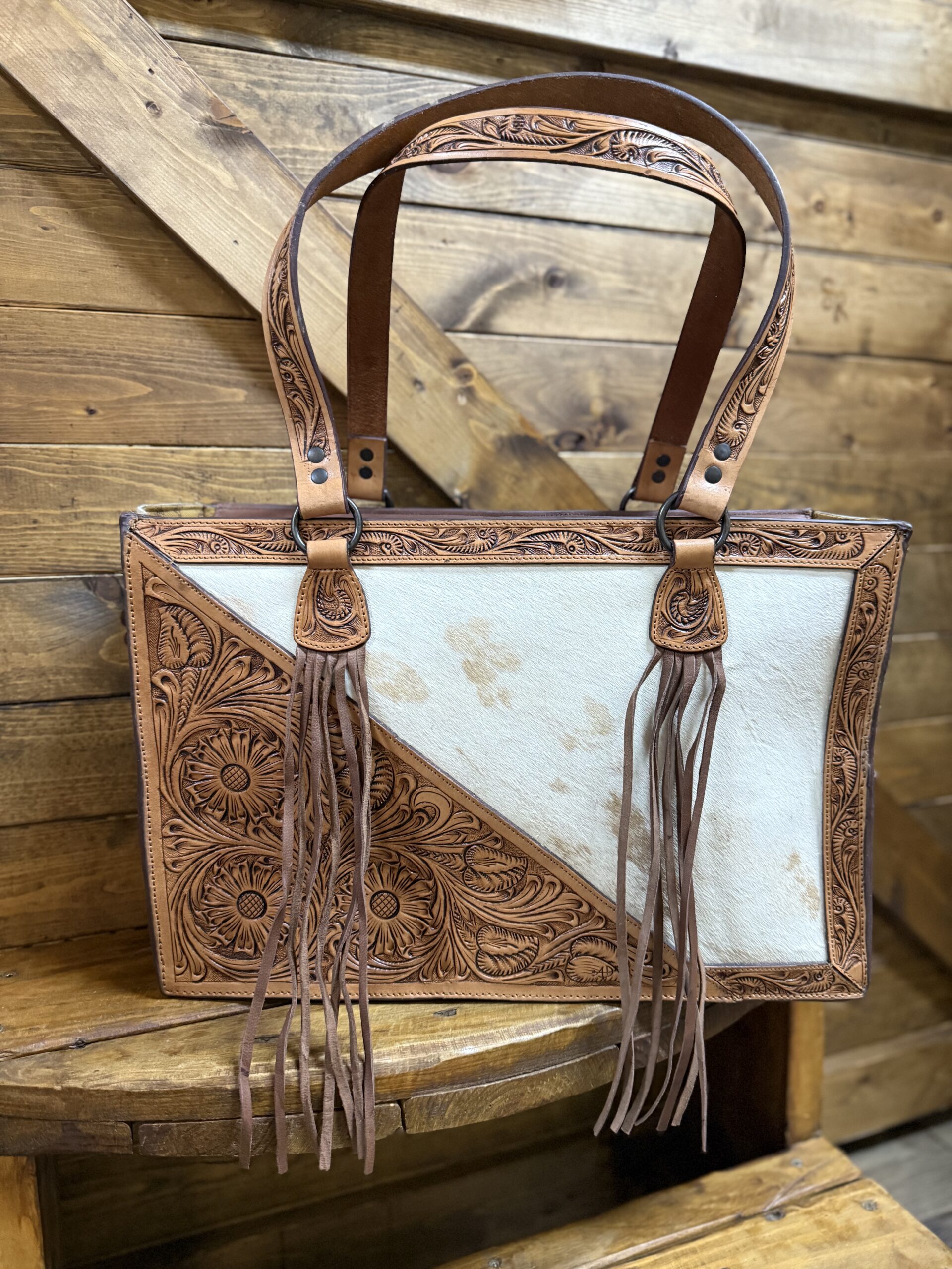 A tote that’s made for all of the things! Beautifully designed for a larger capacity, the durability meets the expectations. Combinations of hand tooled leather pieces and cowhide are featured on the front in equal parts. Each of the ends are crafted with a cowhide and a smooth leather that creates a small slip pocket on the side. The back side is designed with a smooth leather and features dual vertical zipper pockets up each side. Sturdy arm handles are designed to match the hand tooling on the front of the bag. The front attachments for the handles are highlighted with pretty 11.5″ fringe coming down just below the bottom of the base of the purse. The full length zipper closure is flanked by smooth leather opening into a large open compartment with pockets on both sides. Pack this piece to and from the office or on those trips out of town!