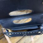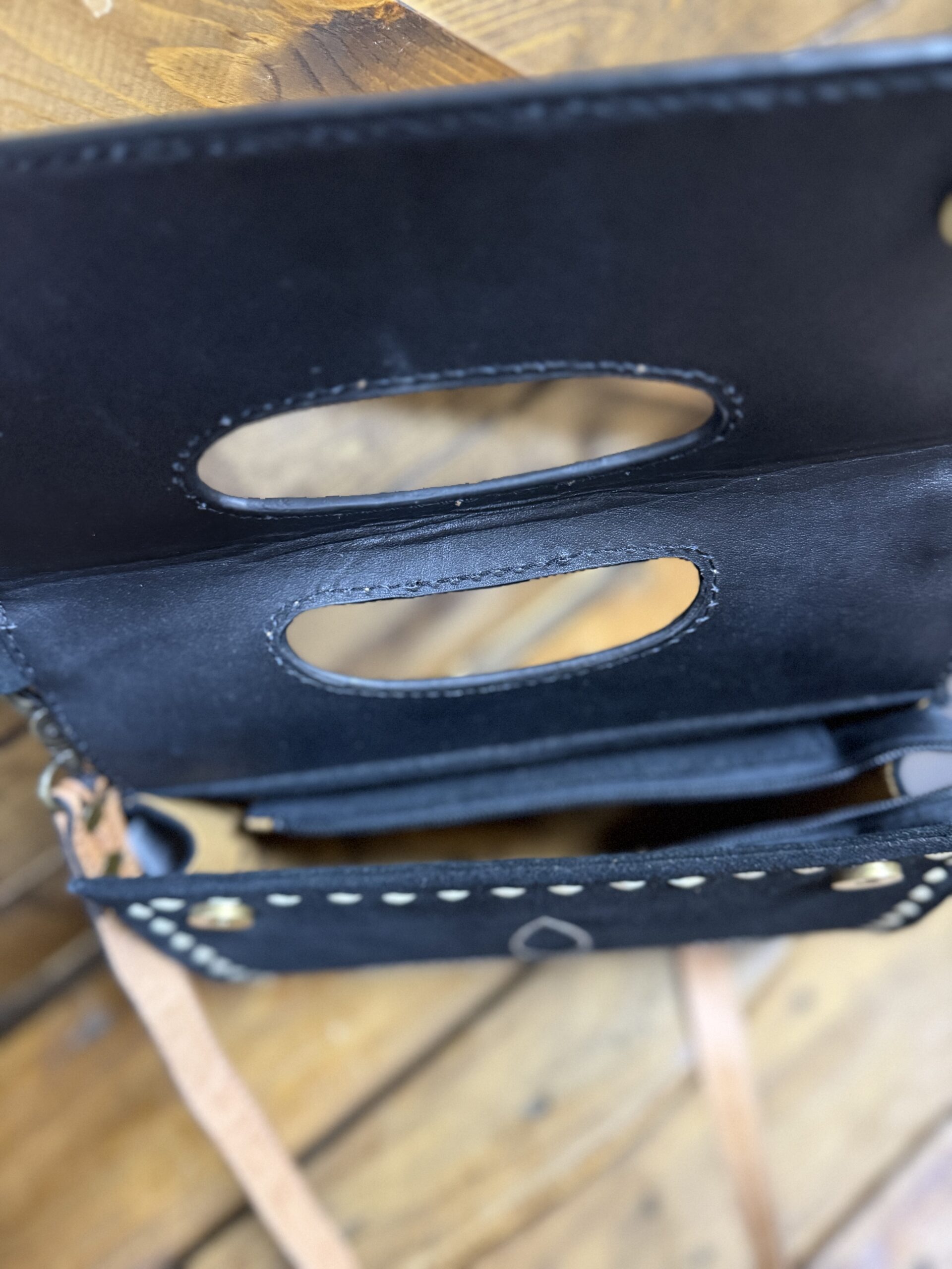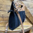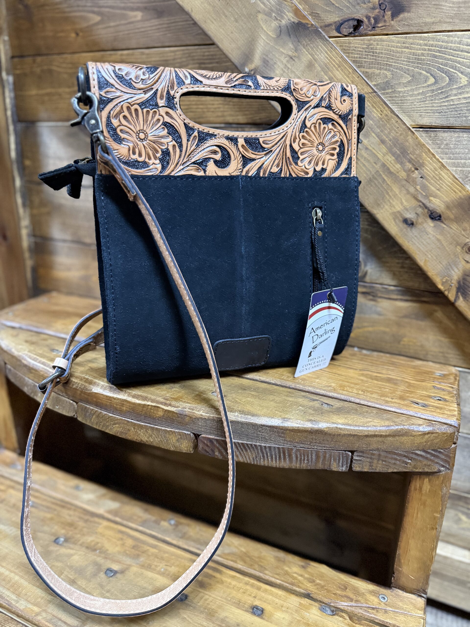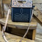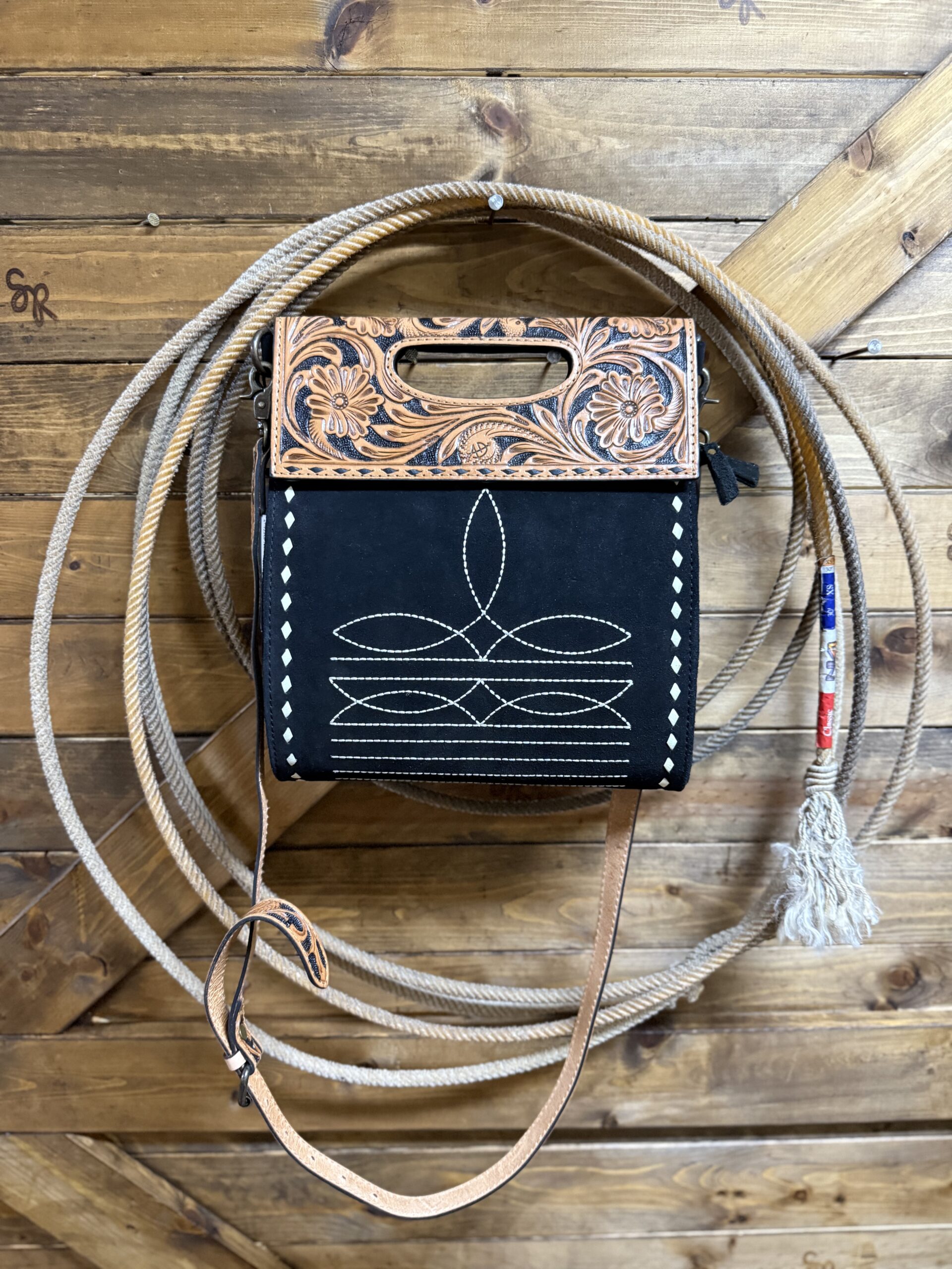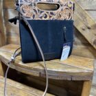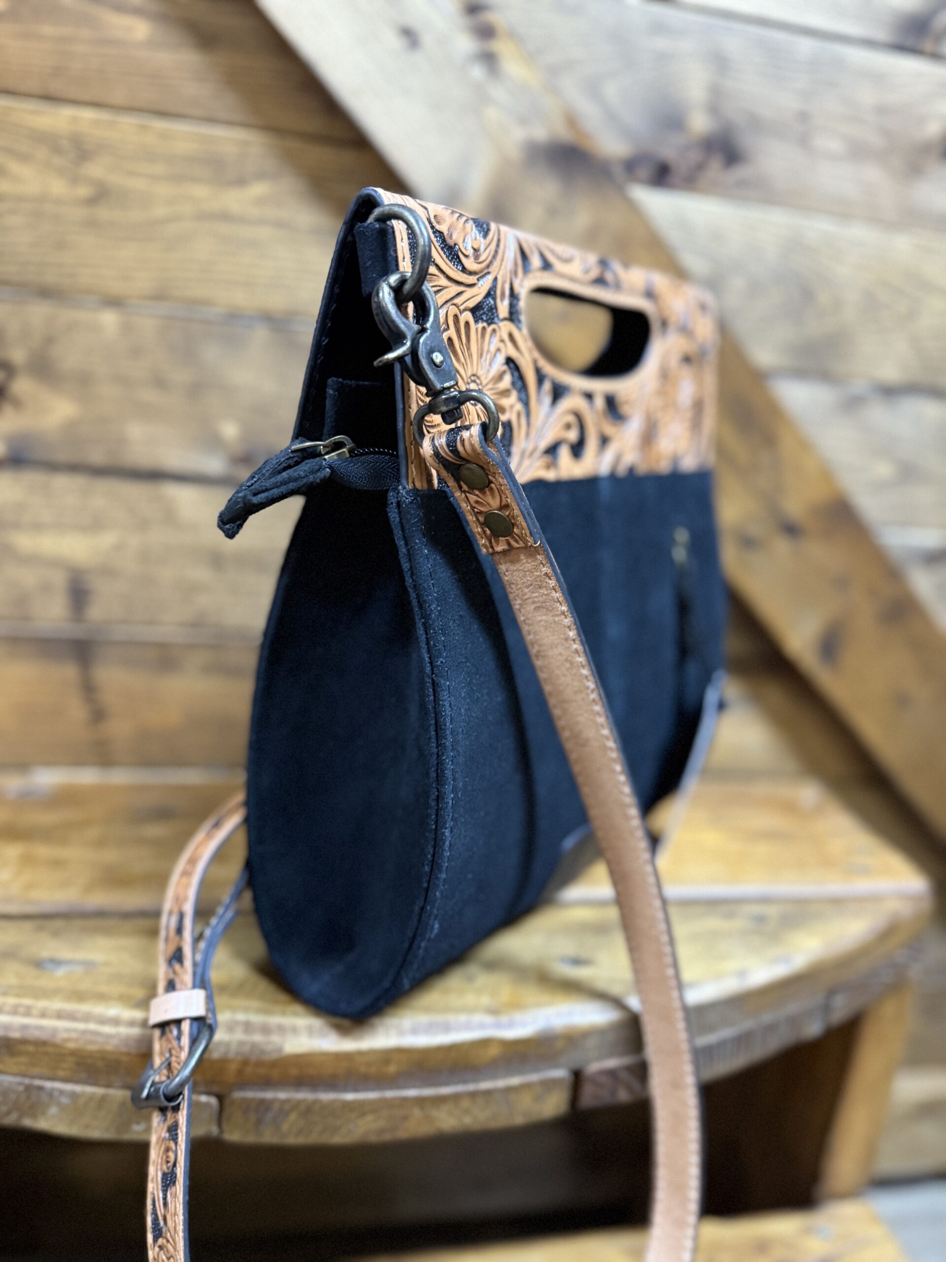 So unique in style! We love a good tooled leather and roughout combination. Pretty black roughout makes up the majority of the bag. It features a white threaded toe bug centered on the front with the outer edge trimmed in a white buck stitch. A pretty plain black backside has a vertical zipper pocket for additional storage space. The top, a beautiful hand tooled leather, folds over the front as a closure. It closes securely on a double magnetic button under each corner and a full length zipper under the flap. A dainty hand piece is cut out in the center allowing the bag to be carried as a clutch style if you should choose. The matching tooled shoulder strap is easily removed on clip hooks at each end or adjusted on a buckle located on the strap. The inside opens into a large compartment with slip pockets on the inside walls and a zipper pocket as well. A style that is for sure to grab the right kind of attention. Carry on…..the compliments await!