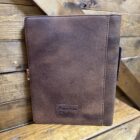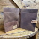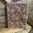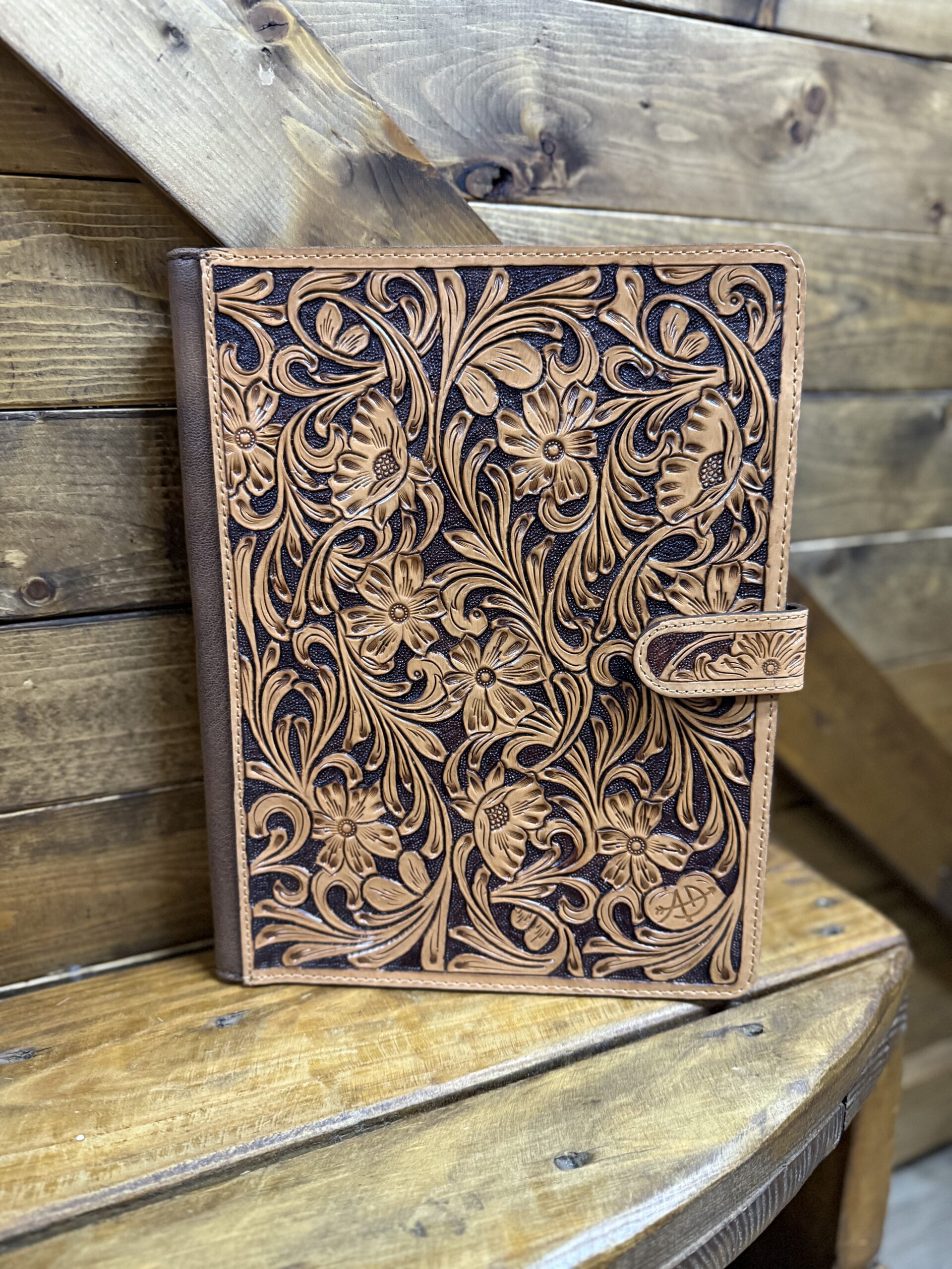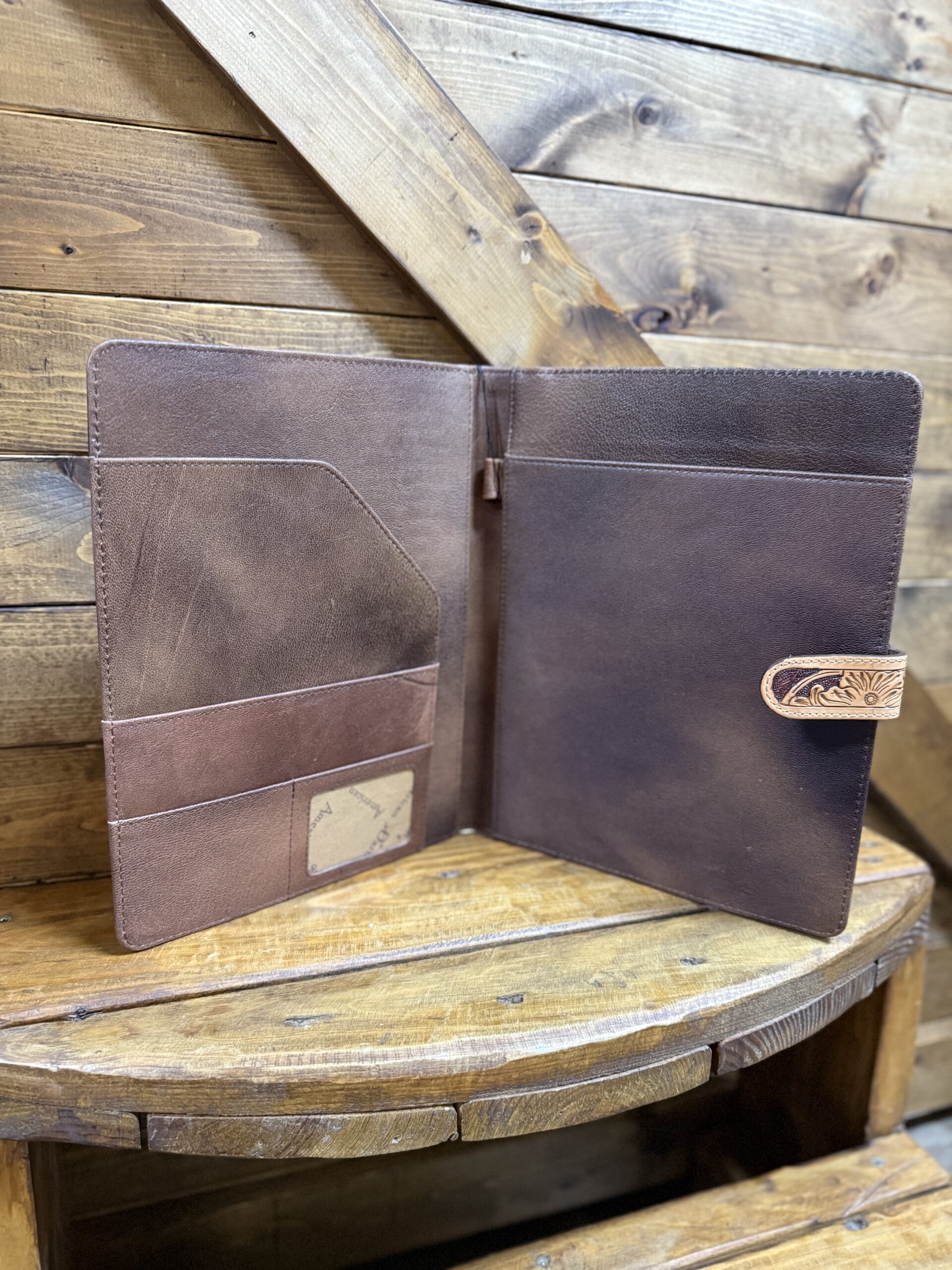 Your portfolio doesn’t have to be boring! Go ahead and update that with a beautiful leather portfolio faced with a hand tooled cover. The combination of natural and dark tanned leathers is sharp to look at. It opens on a small tooled strap on a magnetic button. Each side features slip pockets while the left showcases slip pockets in different sizes and a visible card slip pocket. Small hook for your pen sets in the center. The back keeps a clean sharp look with a smooth leather matching the inside. Great piece to add to the office.