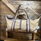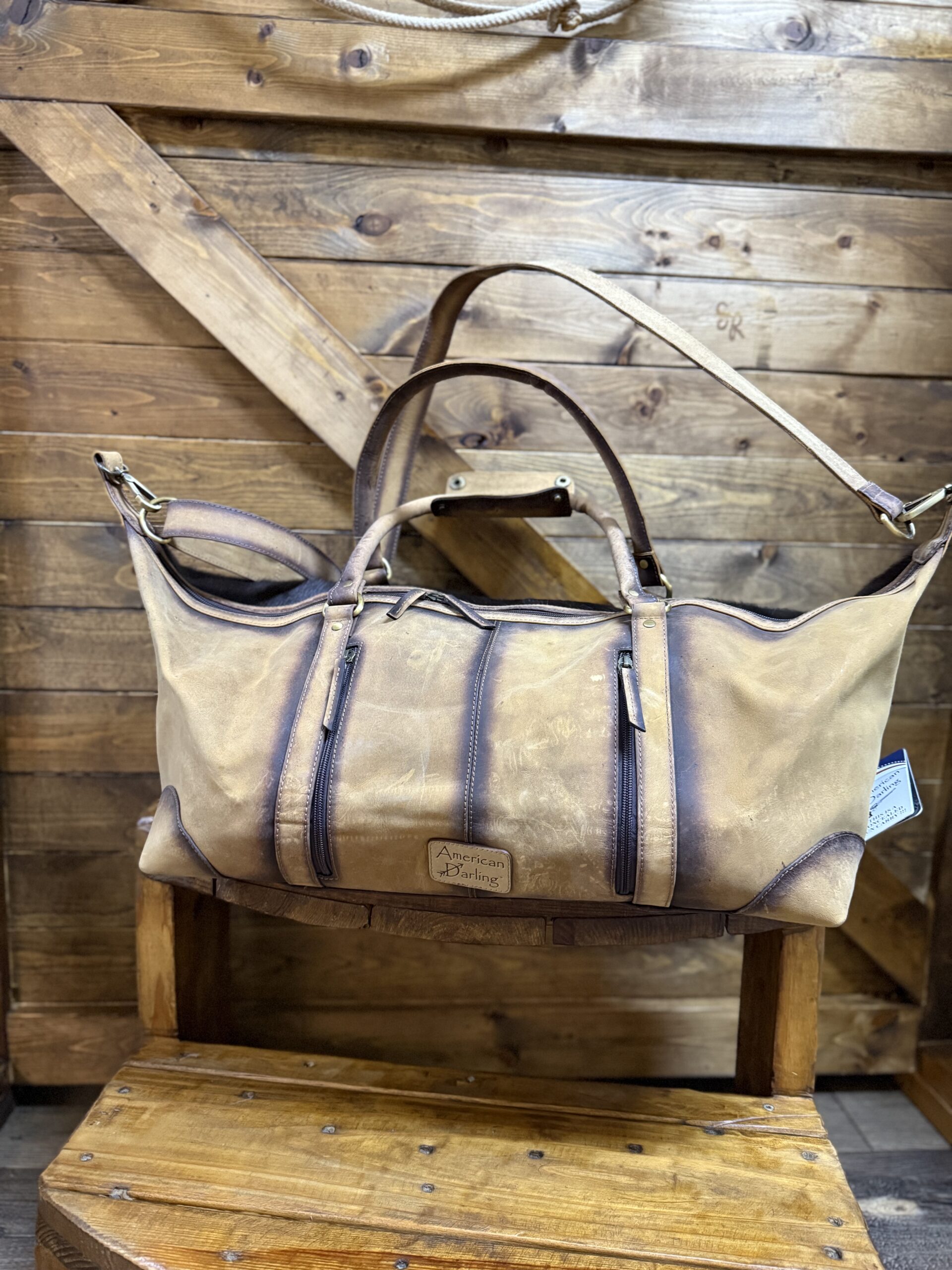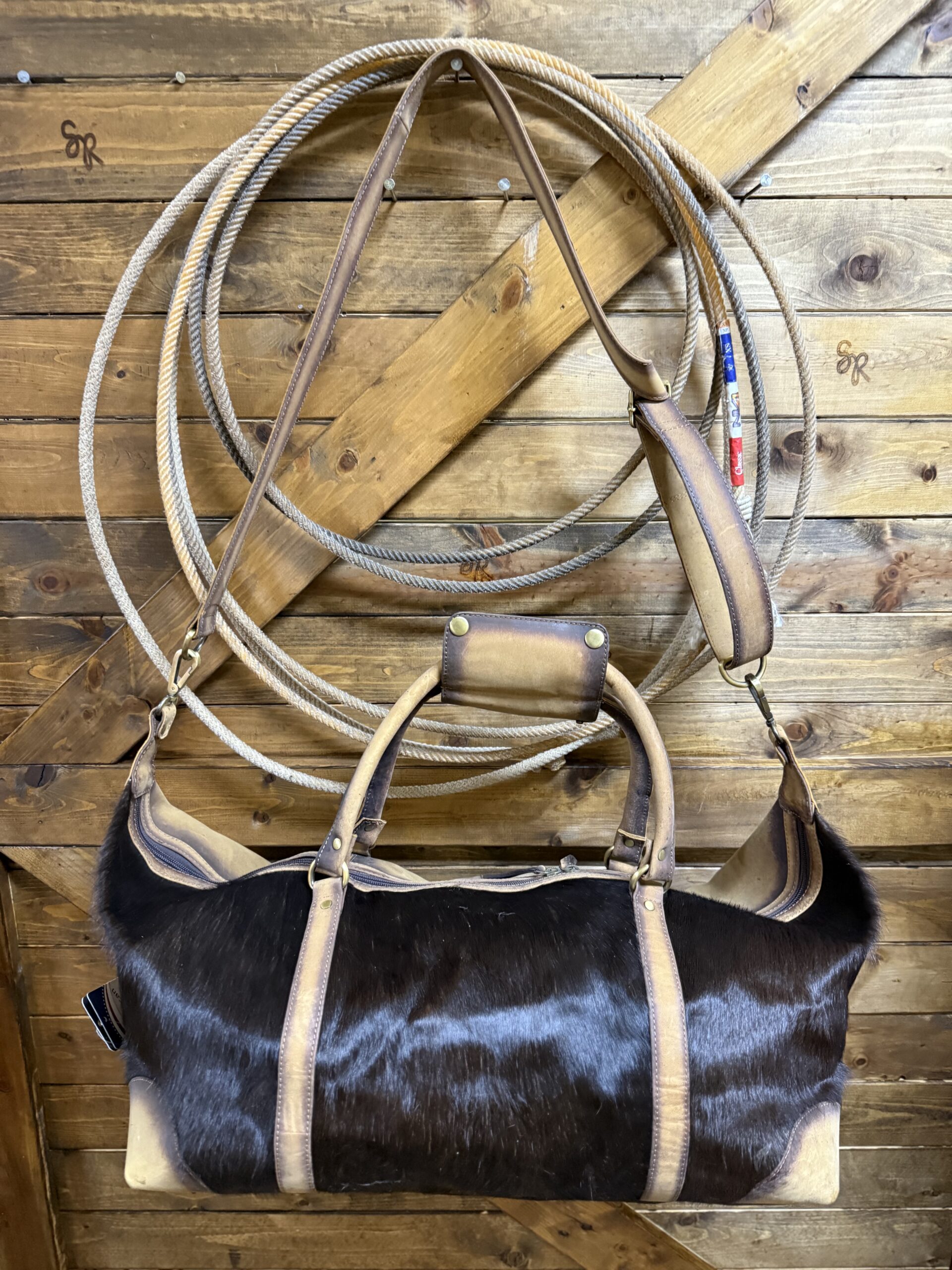 Leaving town in style! Super cool travel tote big enough for all of your light travel needs. The exterior is designed with a beautiful hair on hide featured on the front side and a tough washed leather on the backside. Heavy duty handles are reinforced withe leather strips down both sides of the bag. They come together at the top and wrap together with a wrap securing them shut on double snap buttons. The shoulder strap is of the same quality and durability. It’s easily removed by slip clips on each end. The golden colored hardware creates a very unique look blending nicely with the choice of leather and dark hide. Additional hardware is located at the bottom of each end for a diverse tote. A single large compartment is wide open for your packing strategy. Pack as much or as little as you would like and hit the road! Your luggage will be the talk of your trip. Safe travels!