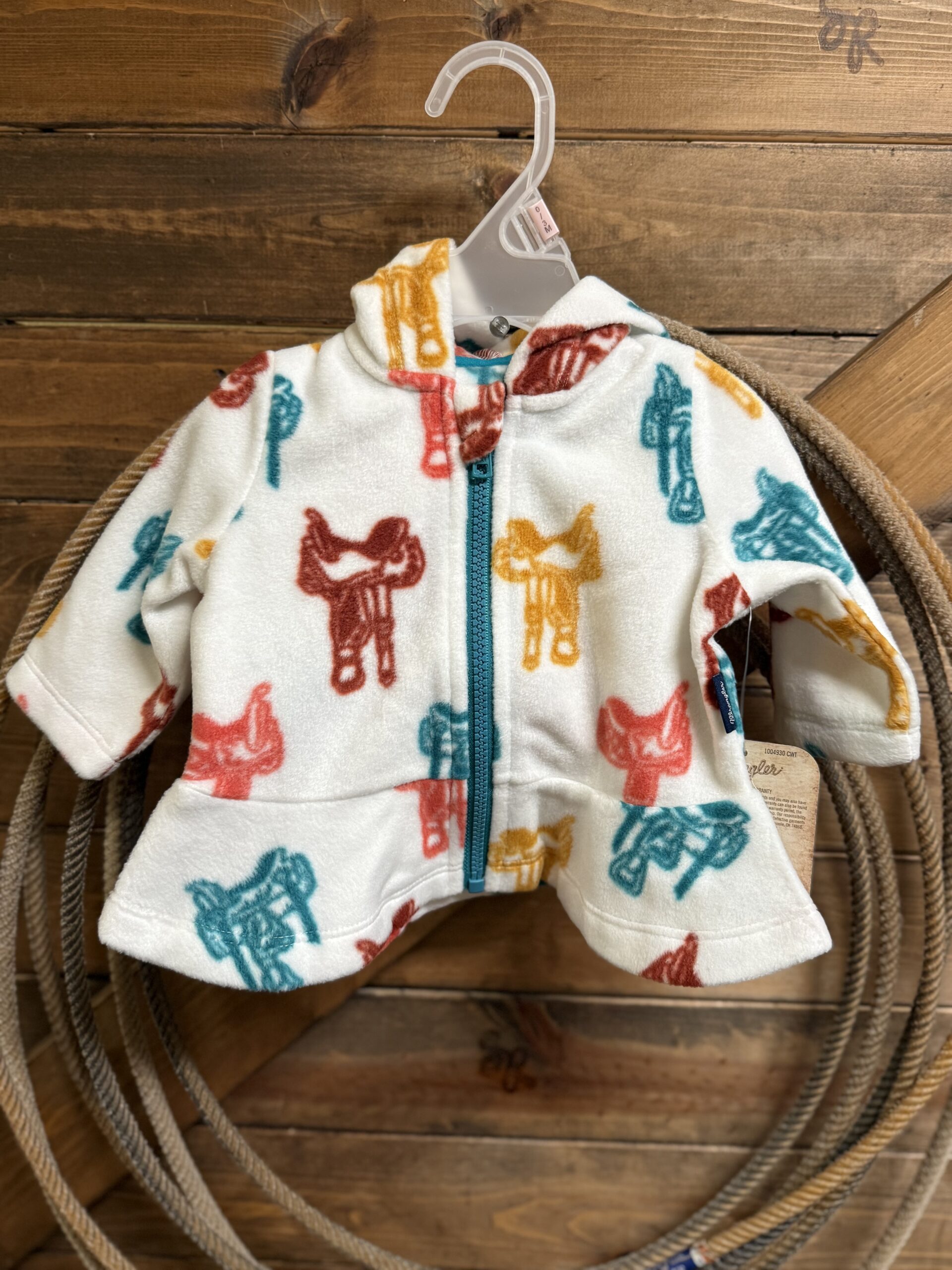 So cute and cozy! The softest white fleece with saddles printed in many different vibrant colors. It’s got a hood without any strings and the cutest ruffle across the bottom. Cozy, comfy, and sooo cute! Keep her snuggly in cooler weather.