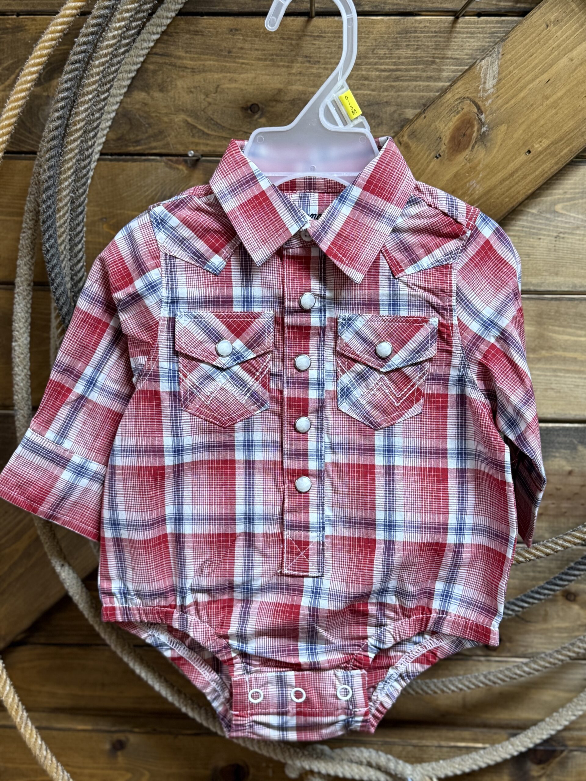 Be the first to review “Baby Wrangler L/S Pearl Snap Onesie-Red/Blue Plaid”