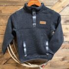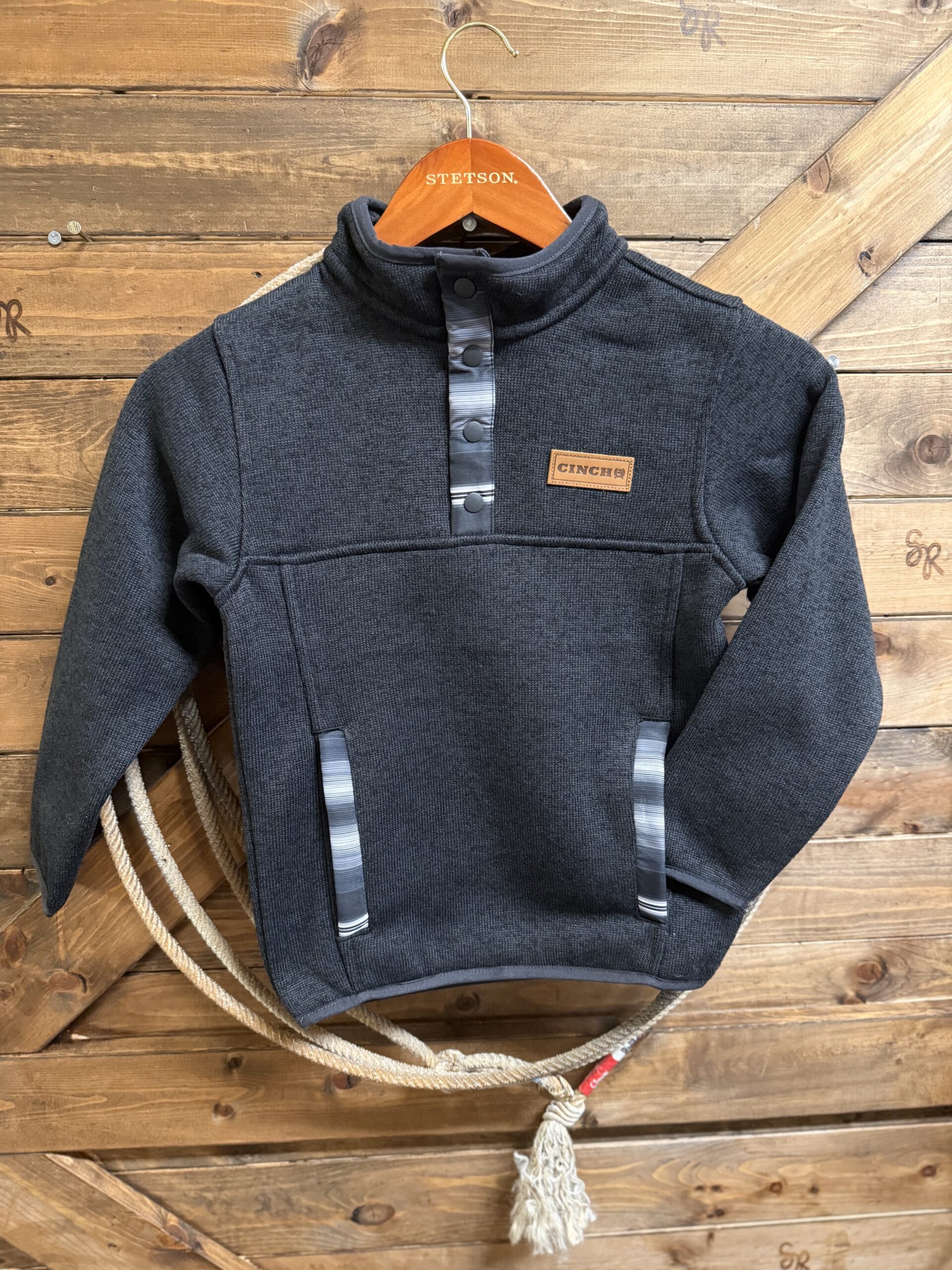 Kids love pullovers! They are easy to put on and you can adjust the neck opening to their desire! Cinch has put a 4 snaps coming off of the stand up collar on the 1/4 button pullover. The snaps and pocket opening are detailed with a charcoal and white multi stripe design. The Cinch logo is patched on the left side of the chest in a lighter brown leather. Individual pockets with slit openings are on the side for easy access. The sleeve ends as well as the bottom hem are a bound hem for a more comfortable fit. Heavy enough for those cooler days when a jacket isn’t necessary and light enough to wear all day. Great for cooler days in the classroom or even family pics in cooler weather.