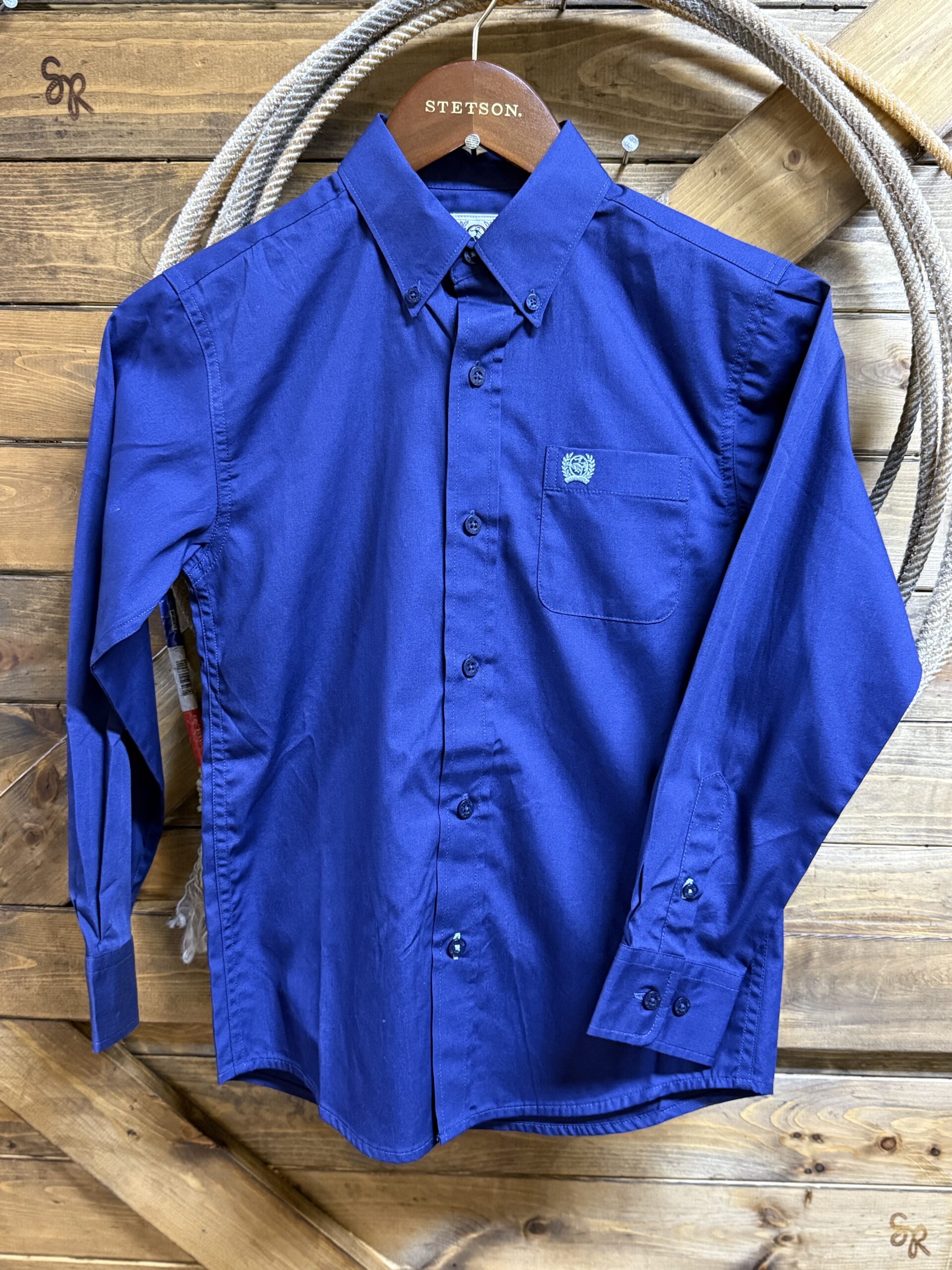 Solids are always a good choice. Great deep royal blue classic button down from Cinch for boys. Color matched buttons line the front, pin down the collar, and adjust the sleeve on a two button set. An open front pocket sets on the left hand side of the chest sporting the Cinch logo embroidered in a light blue thread. Perfect to pair for any occasion or under a sport coat for a more formal look. Great color!