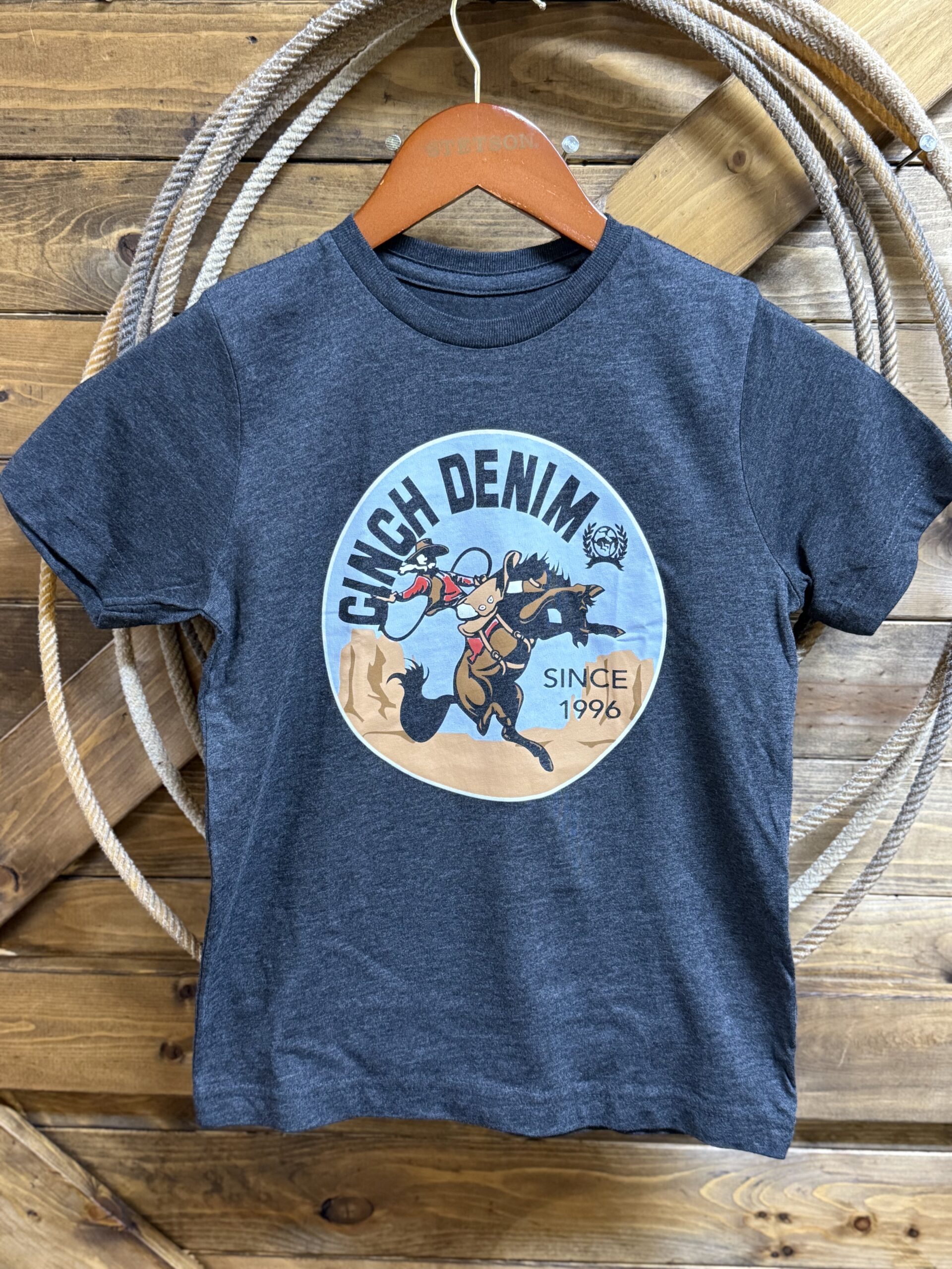 Tees are a must have year round! Little boys live in short sleeves regardless of the weather;) Good basic tee in a charcoal grey. The front features a Cinch Denim graphic in a lighter blue with a mix of tans, red, and black. It’s easy to put under a coat or hoodie or over a long sleeve thermal if they insist on short sleeves in colder weather. Perfect for all those errands with Mom and Dad or a weekend at his friends place. The classroom is a good place too!