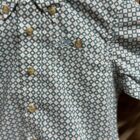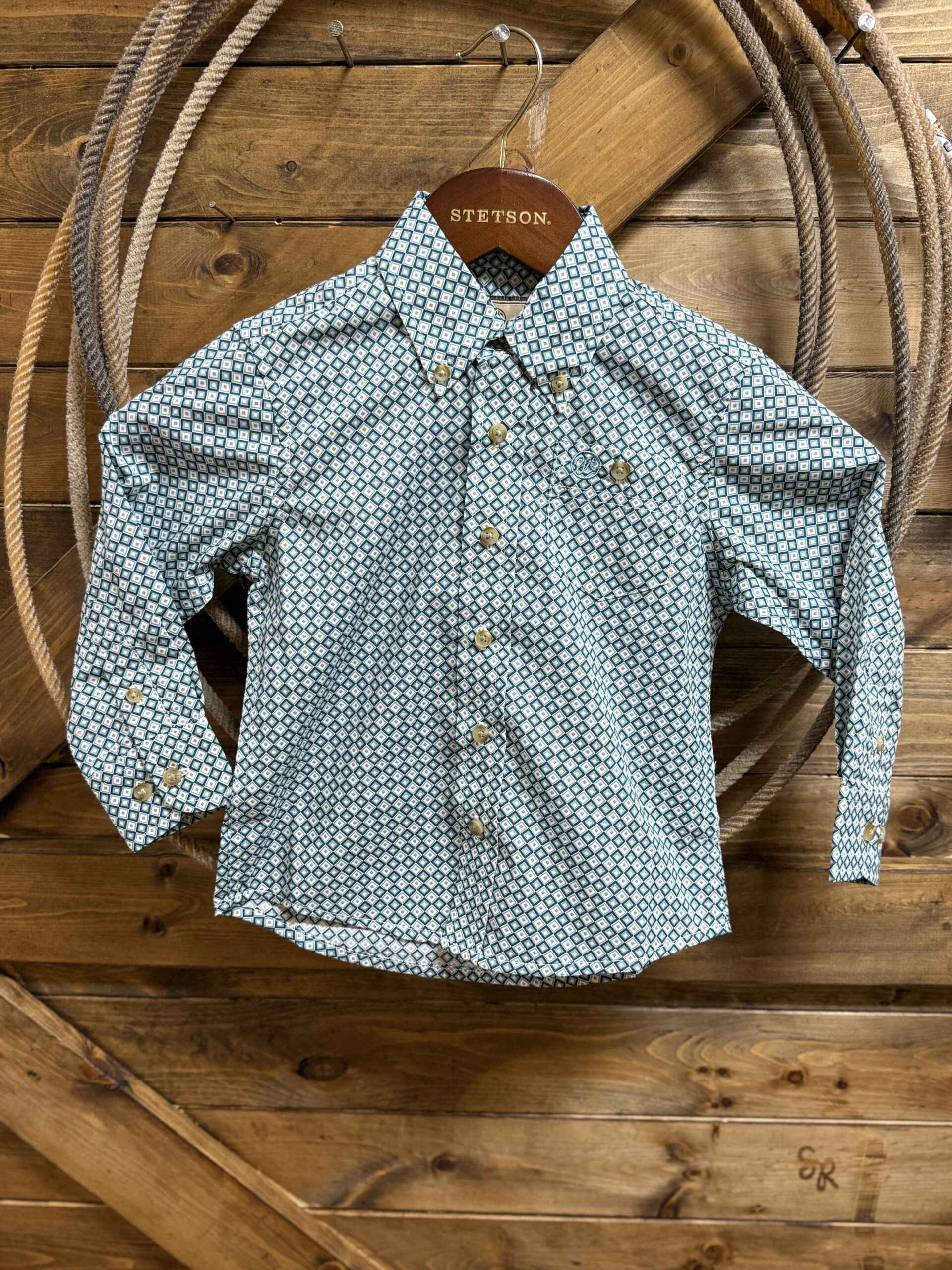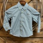 Classics are still classic even for the little cowboys in our lives. Two tone turquoise in an overall diamond print features an alternating white/turquoise diamond. Those little diamonds are centered with a small tan dot creating a great mix of colors in a refined print. Basic marbled buttons line the front, pin down the collar, and adjust the sleeve ends on a 2 button set. The left side of the chest features the open front pocket with a centered button as the closure. The Wrangler logo is displayed in a light turquoise threaded embroidery. Good look for daily wear, the classroom, family pictures, or even the show ring. A look and fit that are both timeless and effortlessly styled.