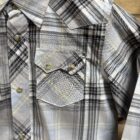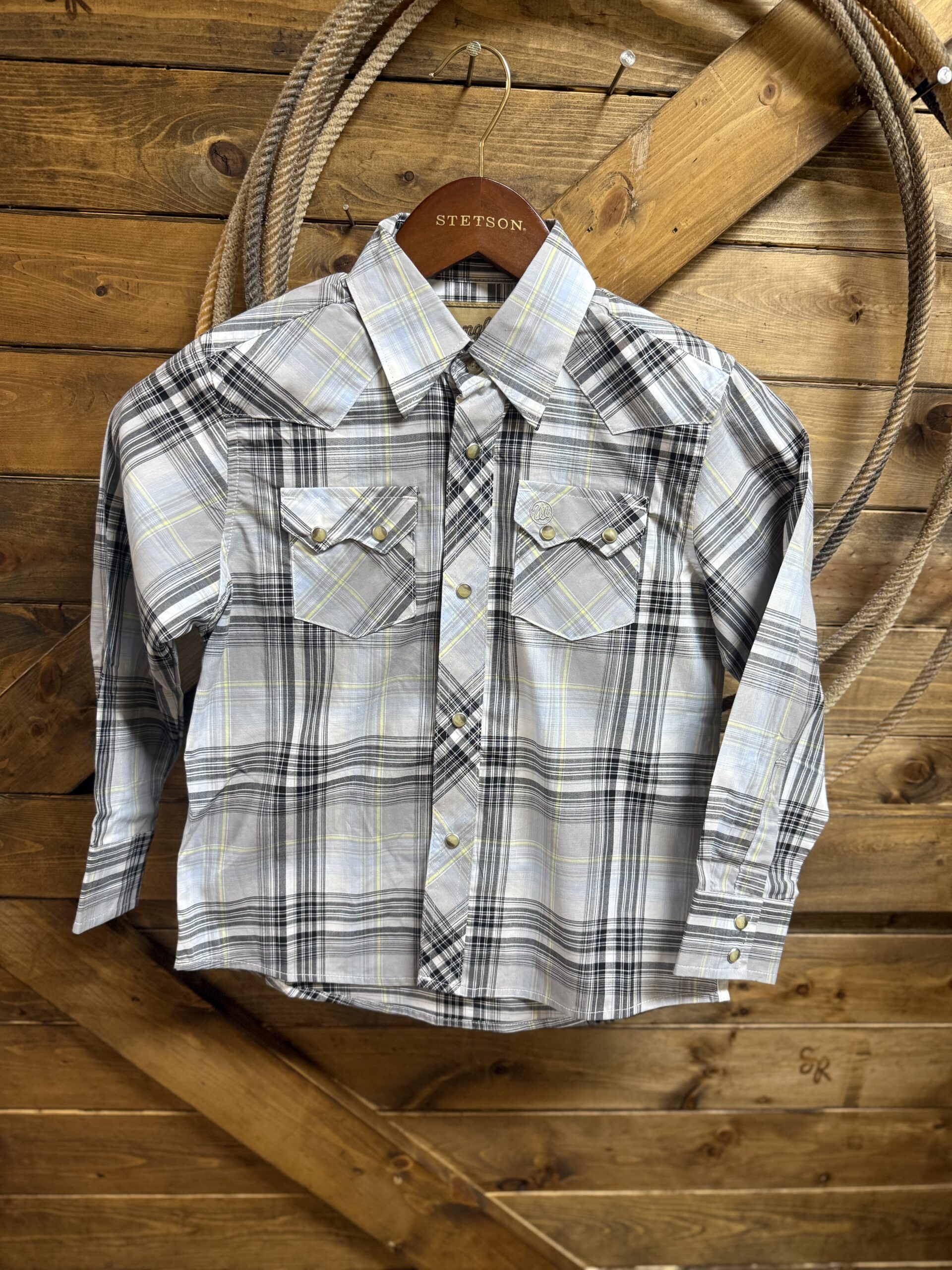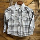 Retro looks are in even for the little guys! A good black and grey plaid with hints of yellow and light blue scattered throughout. Classic marbled pearl snaps are found lining the front and at the sleeve ends. The front pockets, that set on each side of the chest, close on a double pearl snap closure. The feature the W cut pocket flaps. A nice light weight long sleeve that serves the purpose of day to day wear in the classroom or barn or goes nice for those special occasions!
