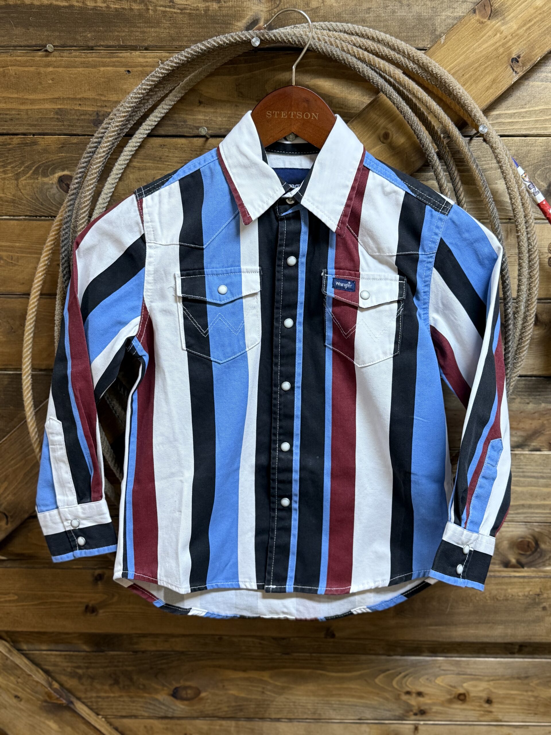 Vintage…….comes in styles for little boys as well! A good brushpopper is making a comeback and in smaller sizes. The same great heavier material as the originals way back when, it’s a for sure bet on a tough made shirt. Classic white pearl snaps line the front and set at the sleeve ends. The front features double front pockets on the each side of the chest with a single white pearl snap closing the flap. Across each of the pockets is the traditional W stitching in a white thread. The colors scream vintage in a combination of black, light denim blue, and a maroon stripe broken with a white stripe every now and then. Bring him up in style, vintage style.