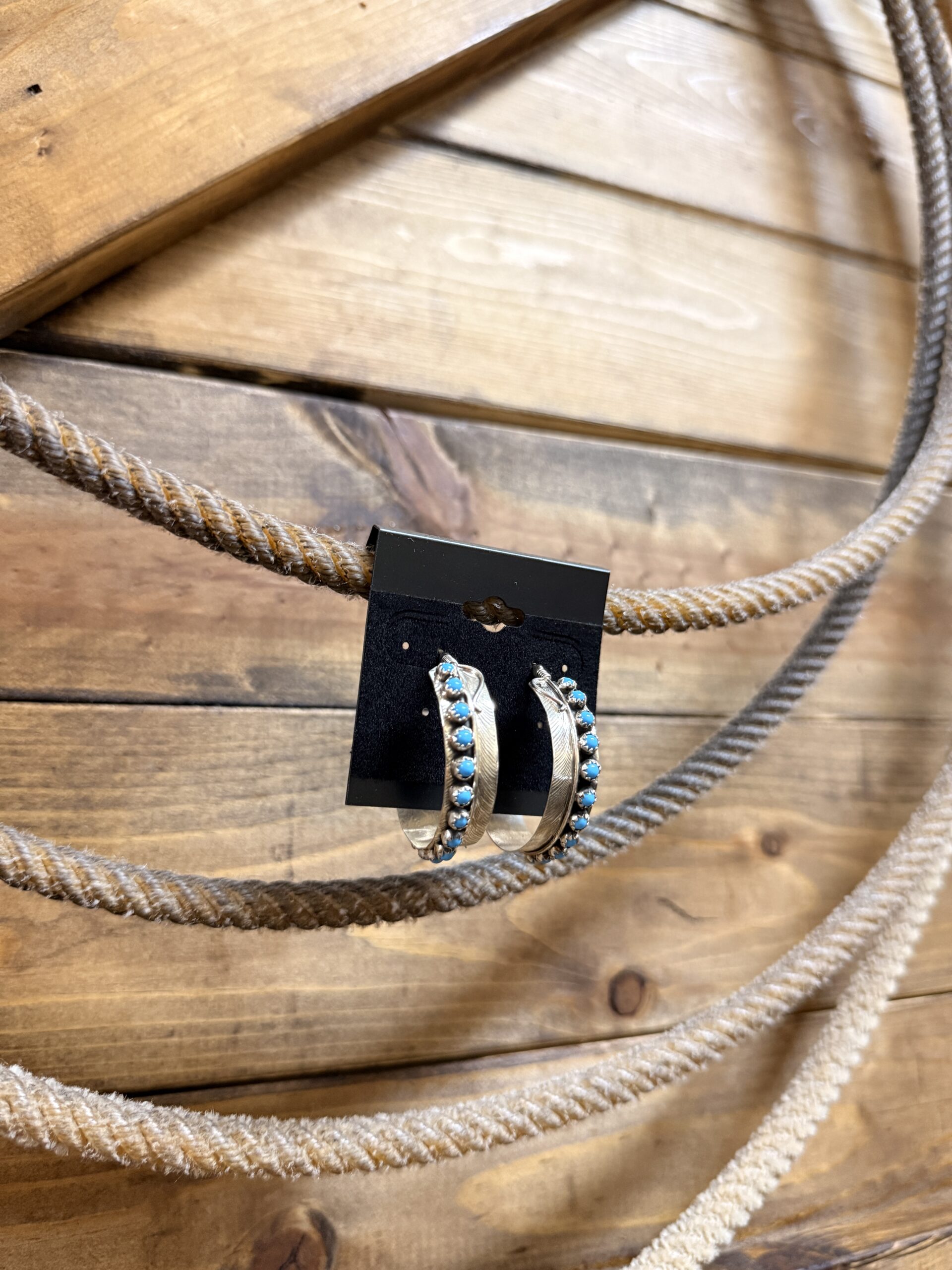 Authentic Native American made sterling silver feather hoops with 12 turquoise snake eye stones