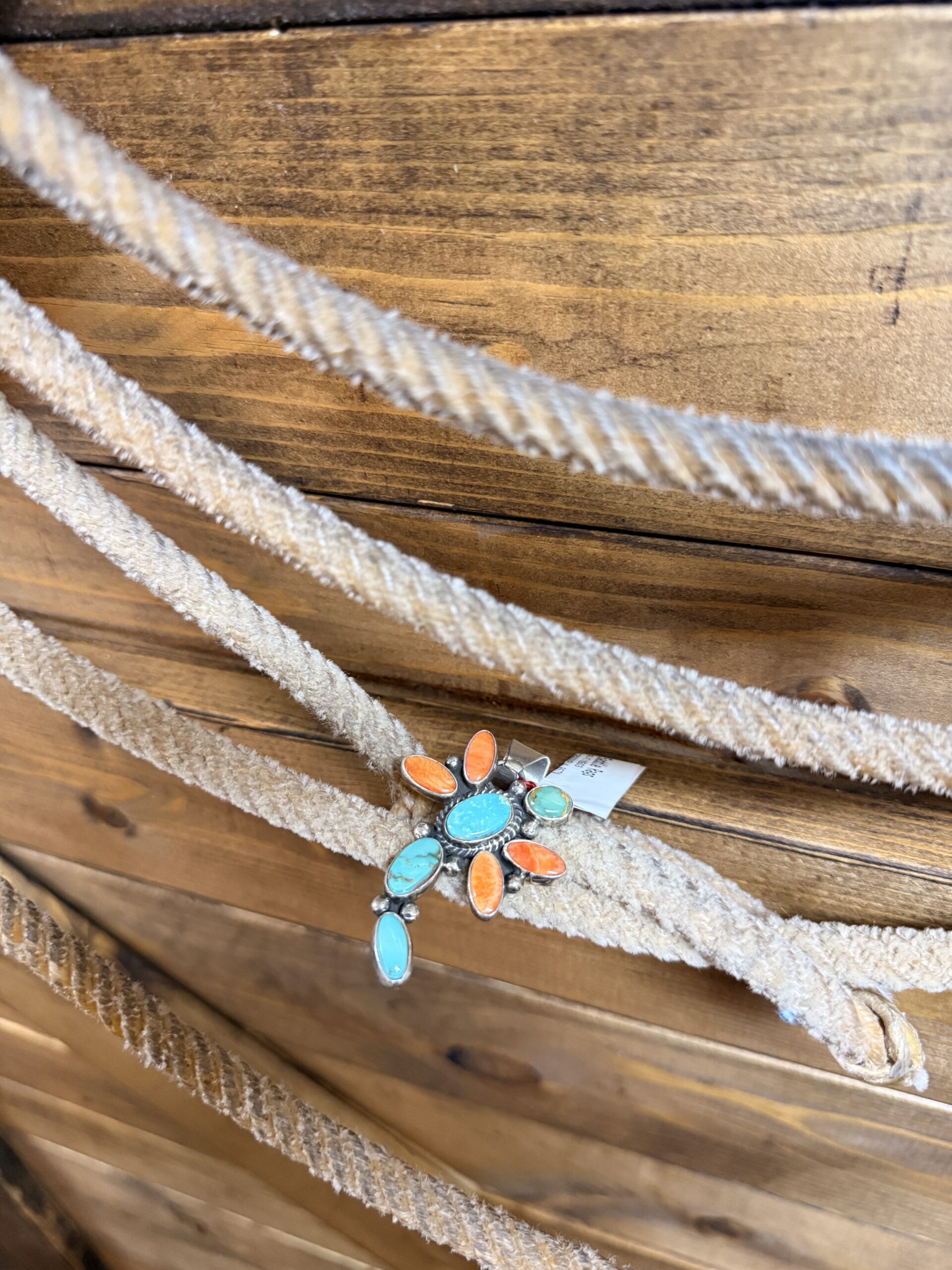 Authentic Native American made sterling silver set turquoise & orange spiny oyster large dragonfly pendant