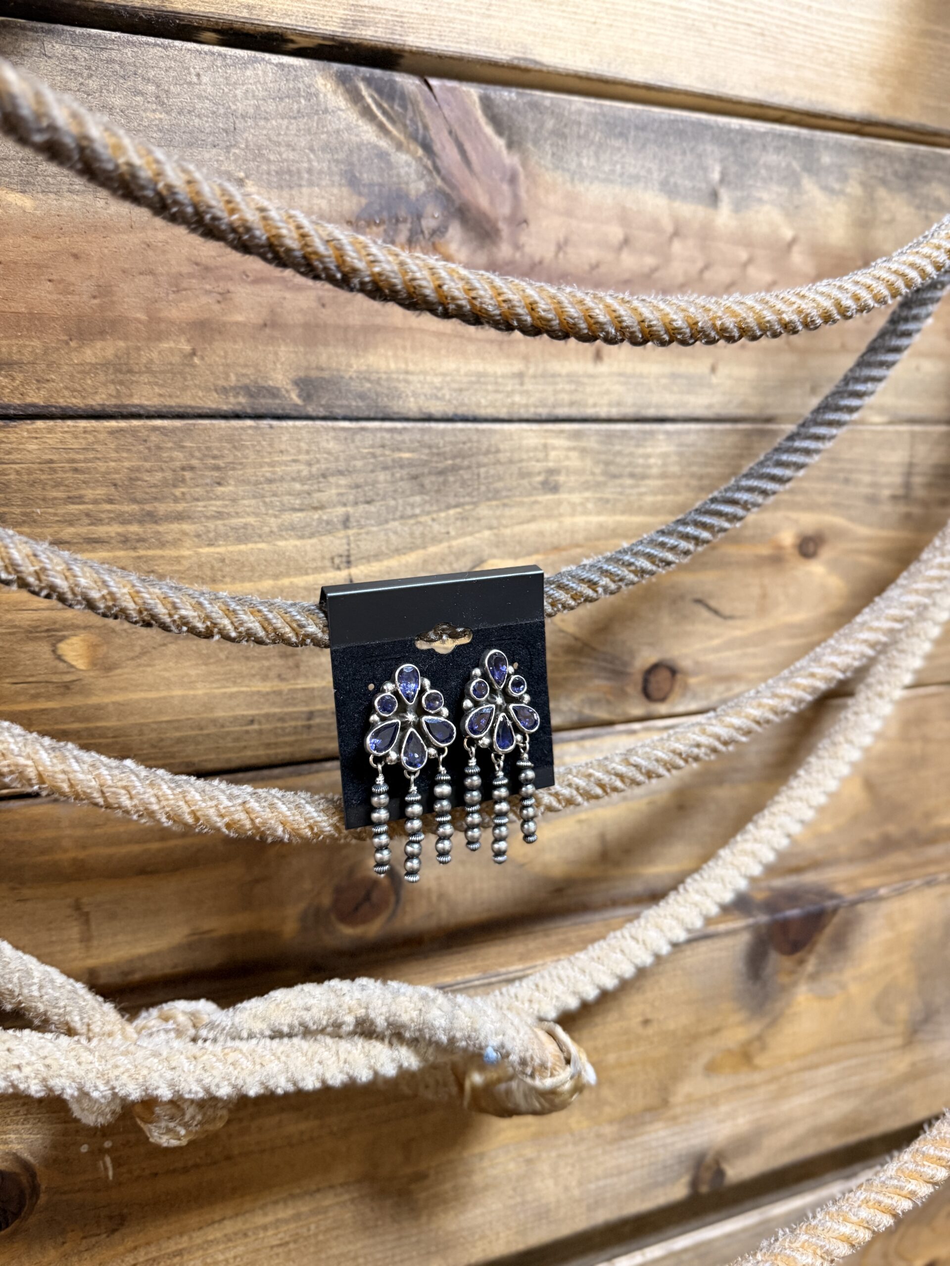 Authentic Native American made sterling silver set Iolite abstract cluster post earrings with 3MM alternating Navajo pearl and fluted saucer dangles.