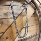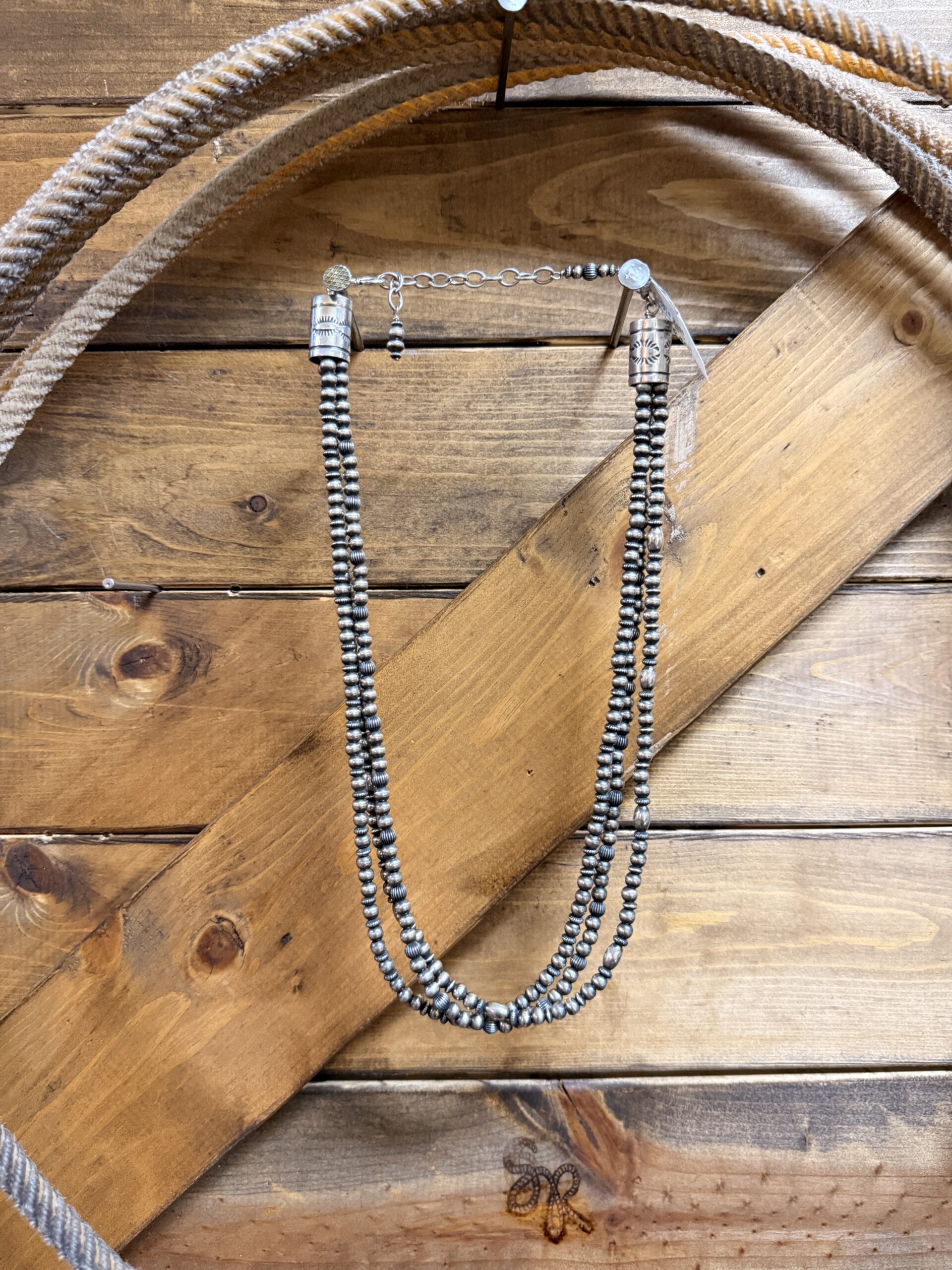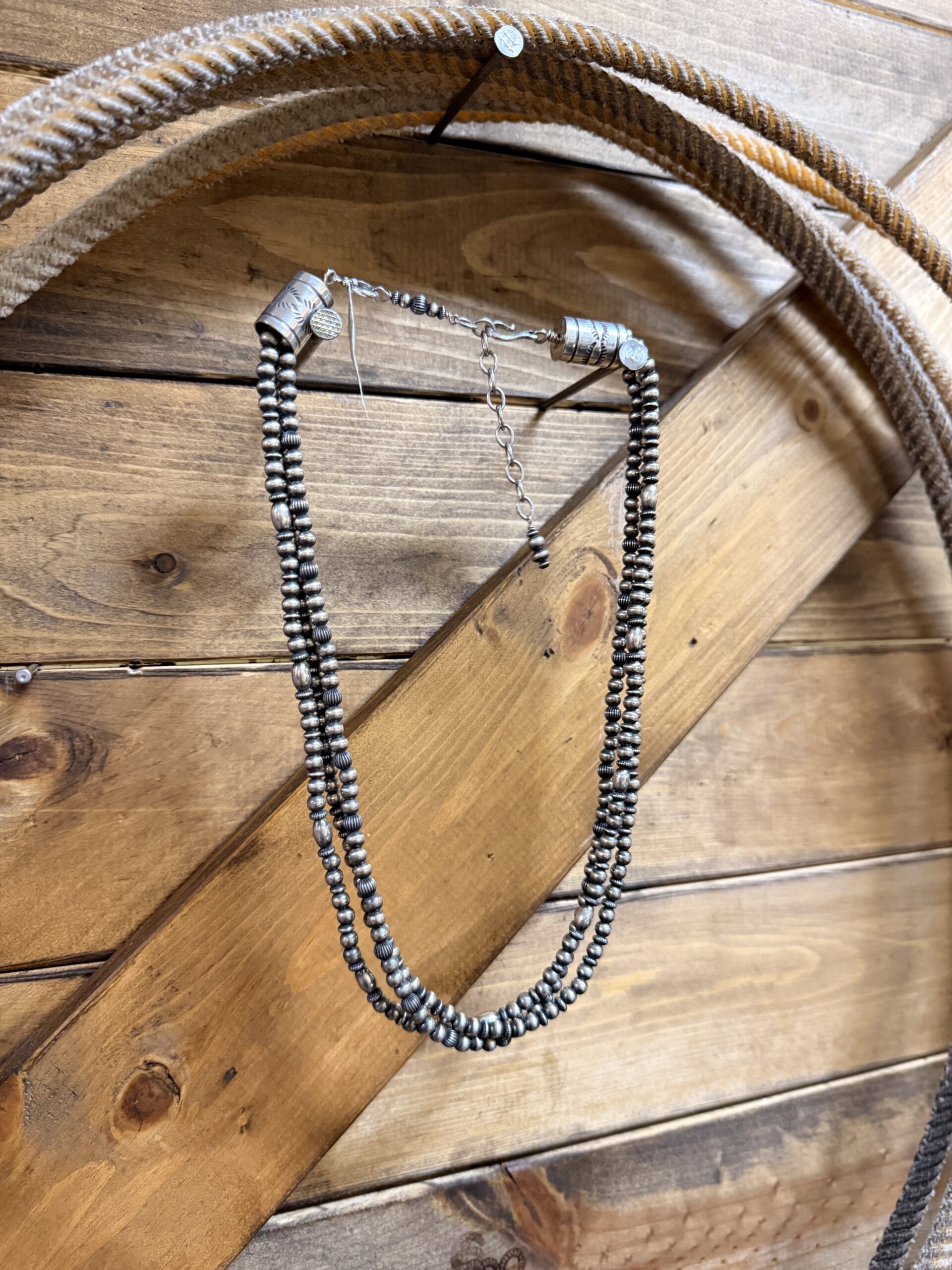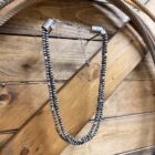 Authentic 4MM Navajo Pearl necklace featuring round beads, saucers, fluted beads, melon seed beads, and fluted saucers.