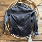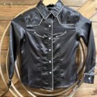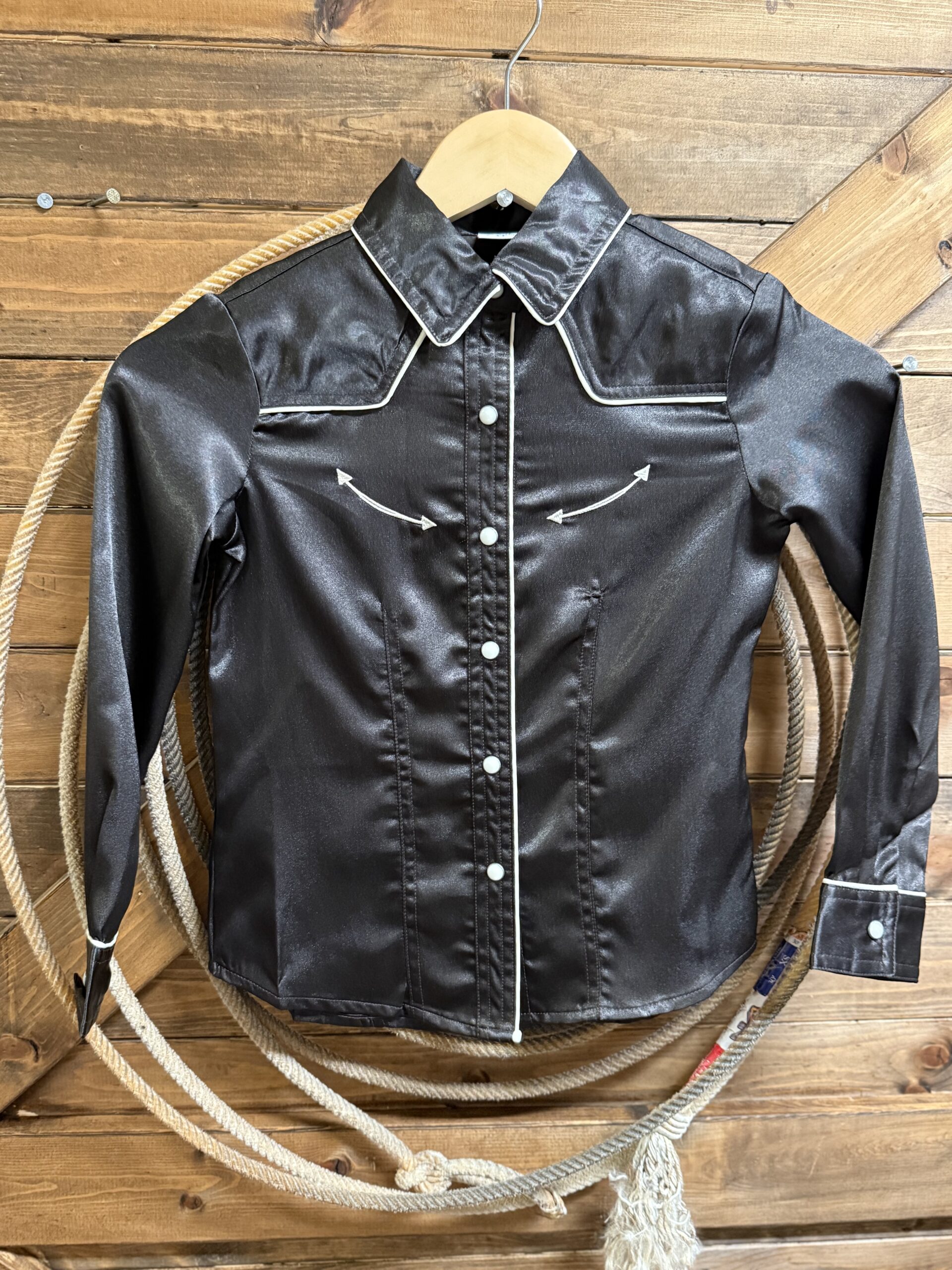 Satin for the little ladies! Pretty chocolate satin blouse featuring long sleeves and the prettiest pearl white pearl snaps. The pearl snaps run down the front and close the cuff on a single snap. The sleeve ends are outlined in the same pretty white piping that is featured across the front of the shoulders, around the collar, and lining the buttons. Cute western darts lay on each side of the chest. Classy and sassy, this style suits those fancy little ladies!
