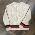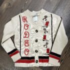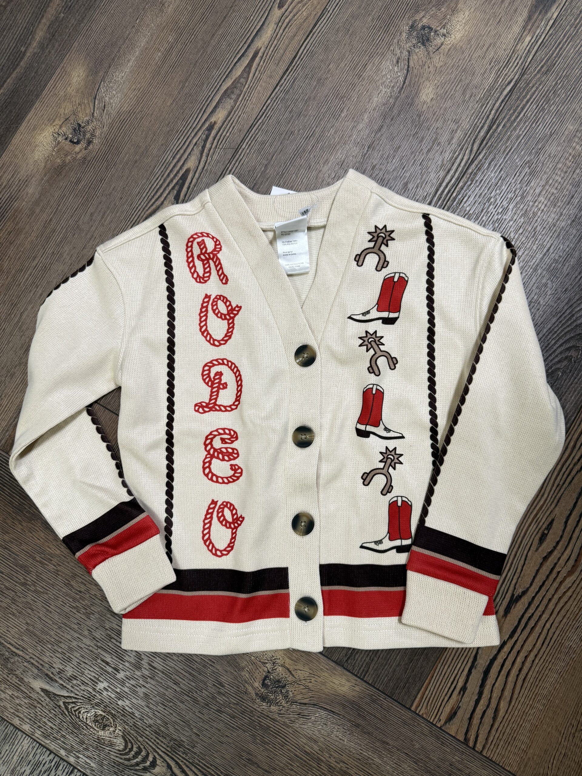 Grab the cardigan and head to the rodeo! It’s so cute and so fashion forward. Cream knit style cardigan with designs and lettering in red and brown. A cute wide 2 row trim of red and brown goes completely around the bottom of the cardigan and again at the end of both sleeves. 4 big round tortoise colored buttons close the front from mid chest down. The neck is a cute v neck style.  A pretty little braided rope pattern starts at the top of the shoulder and runs down each arm stopping at the double band. We think it may just be picture day perfect!