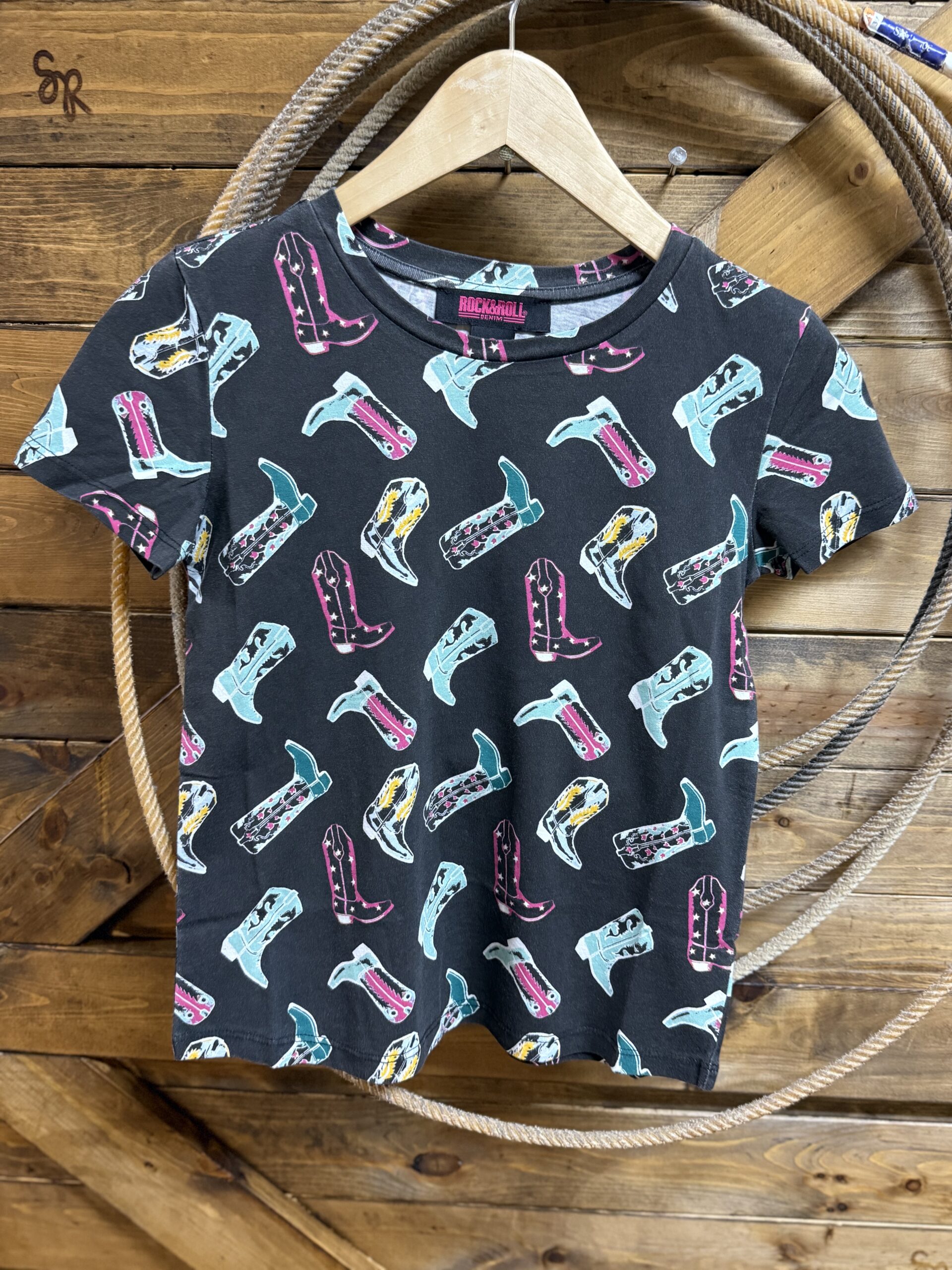 Styled for summer and all of the fun things! Pretty black short sleeve tee with a variety of western boots printed on both the front and back. Colors that scream a good time are bold and bright alike. Grab this for all of the get togethers or concerts that you have on the calendar with your little lady this summer!