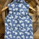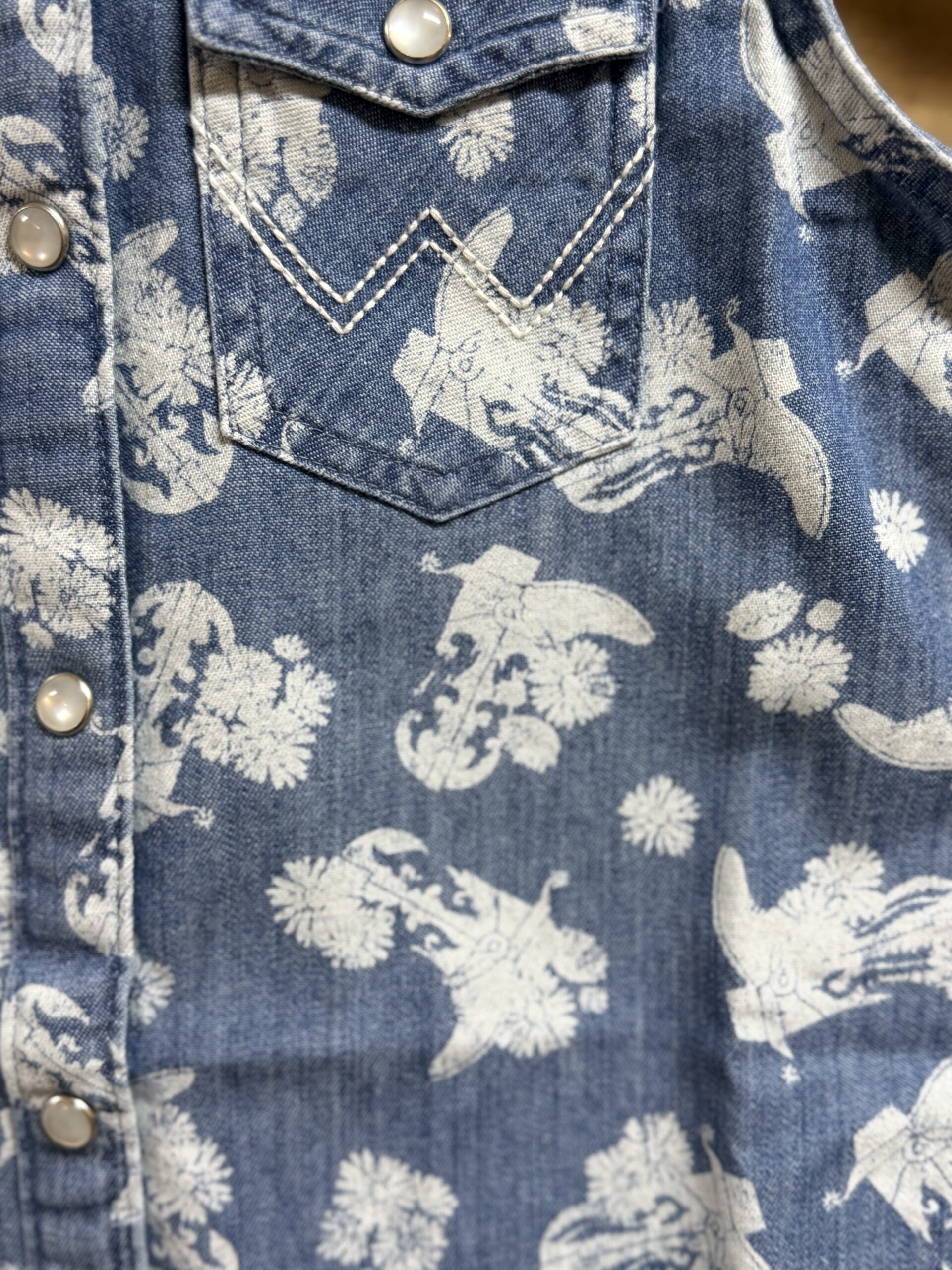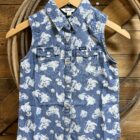 Tops for summer that quickly become a closet favorite! A denim sleeveless top that is printed in the cutest western print. Pretty pearl snaps line the front and close each of the front pockets. A pretty western yoke seam comes down across the front of the shoulders and carries across the back between the shoulders. A look made for warmer weather!