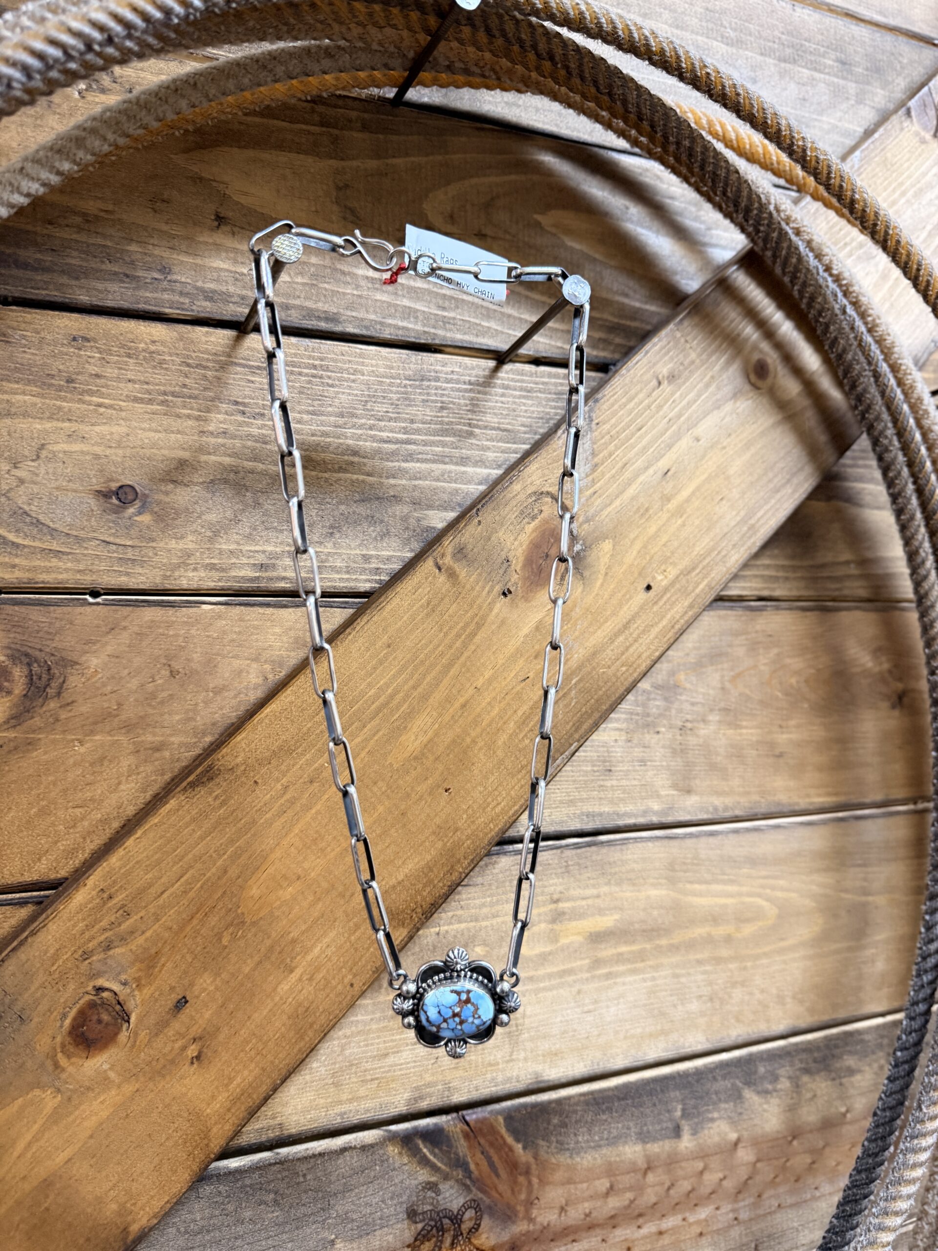Authentic Native American made Golden Hills turquoise and sterling silver necklace on heavy chain.