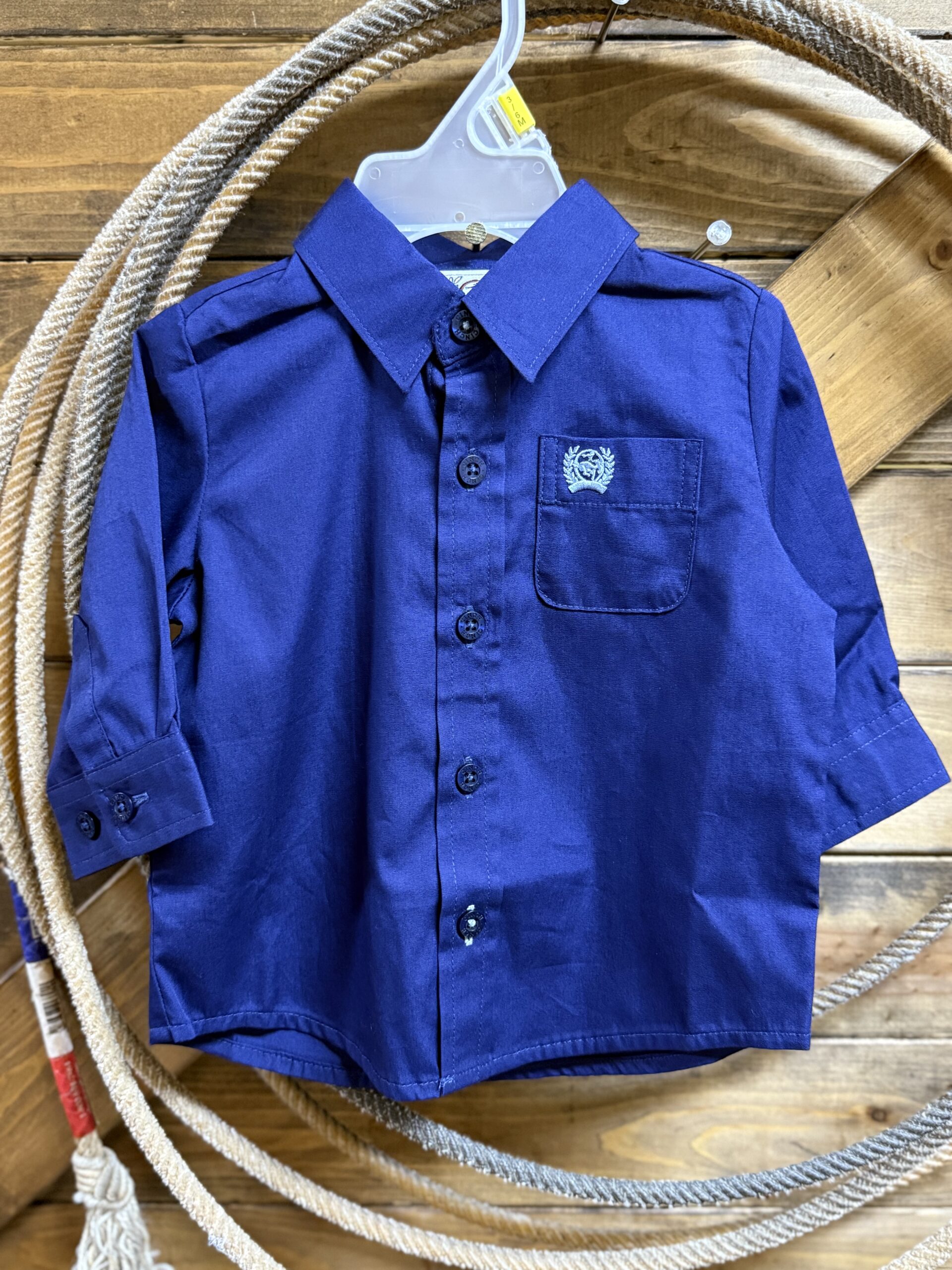 Even the littlest of little cowboys need a classic button down. Pretty deep royal blue in color, the front is lined with color matched buttons the same as the sleeve ends. The cutest little open pocket is situated on the left side of the chest with the Cinch logo embroidered in a light blue thread. The perfect first western shirt for that little guy.
