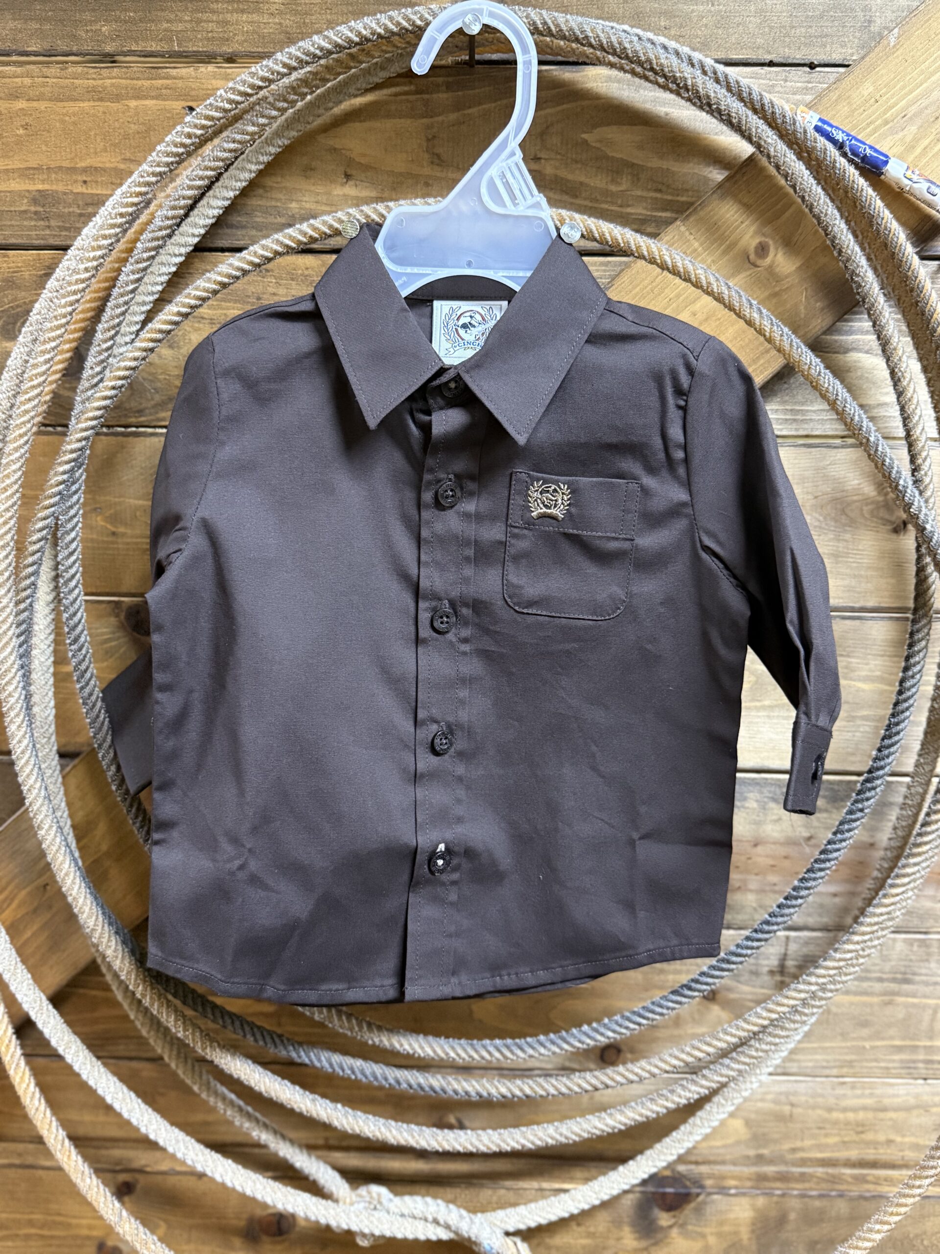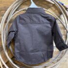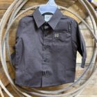 Infant sizes don’t have to be hard to find in a nice button down. This matches dad and big brother in color and style alike. A classic long sleeve button down for infant boys. Pretty solid brown shirt that is designed with stretch to allow extra room in all the places those little guys need it most. Color match buttons line the front and are found again at the sleeve ends on a 2 button adjustable set. As always, the front displays a cute open pocket with the Cinch logo embroidered. These are perfect for matching the other guys or a special occasion that needs the cutest little button down.