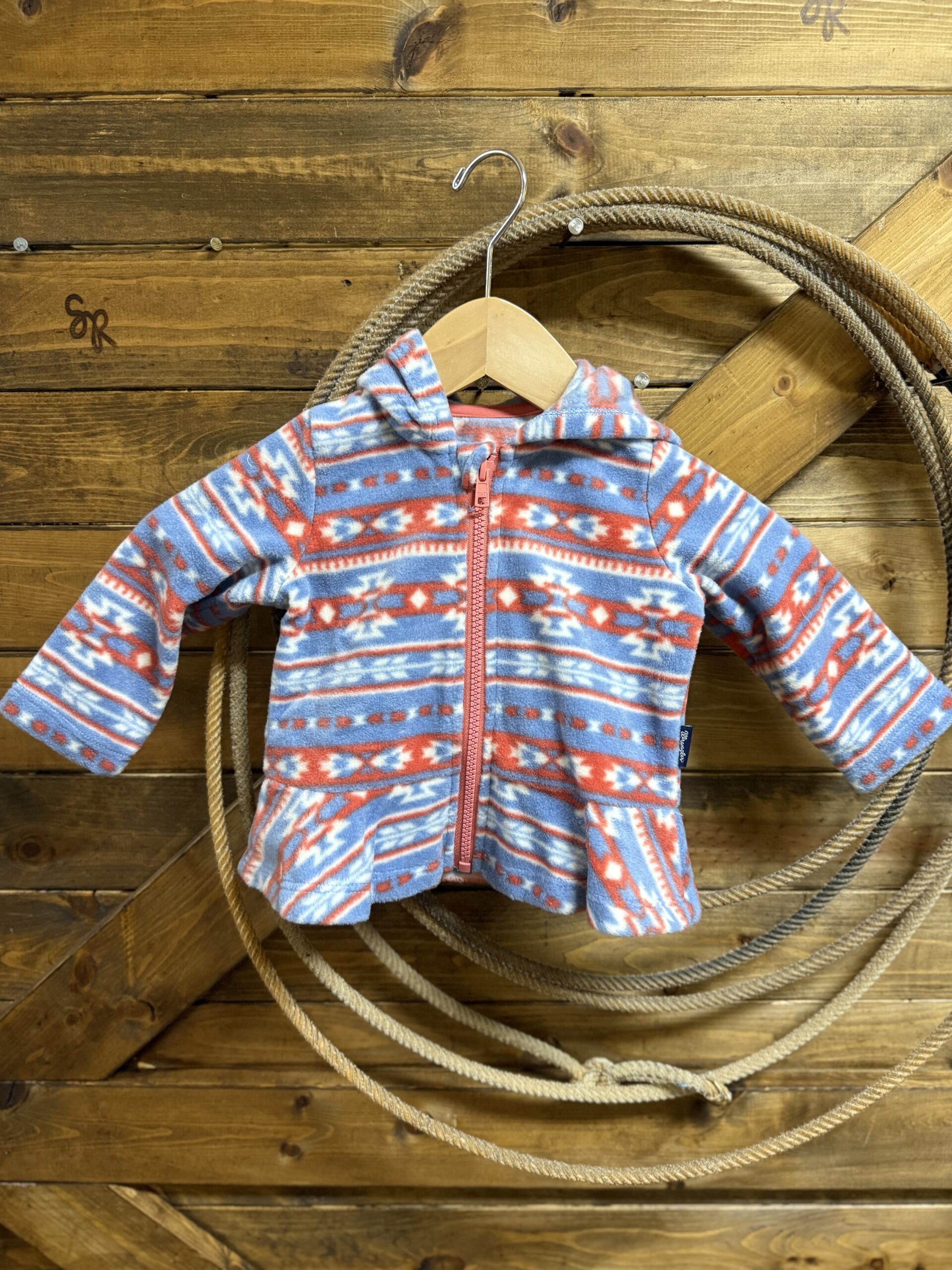 It’s the cutest sherpa jacket we ever did see!! Pretty color mix of pink and blue in an aztec print pattern. The pattern covers the entire jacket on both the front and back side. The front has a full length zipper in the same pretty pink that’s in the pattern. It has a hood that just pops up without any tie strings to hassle with. The cutest little ruffle trims the bottom about 2.5 inches from the bottom. It’s just adorable!!