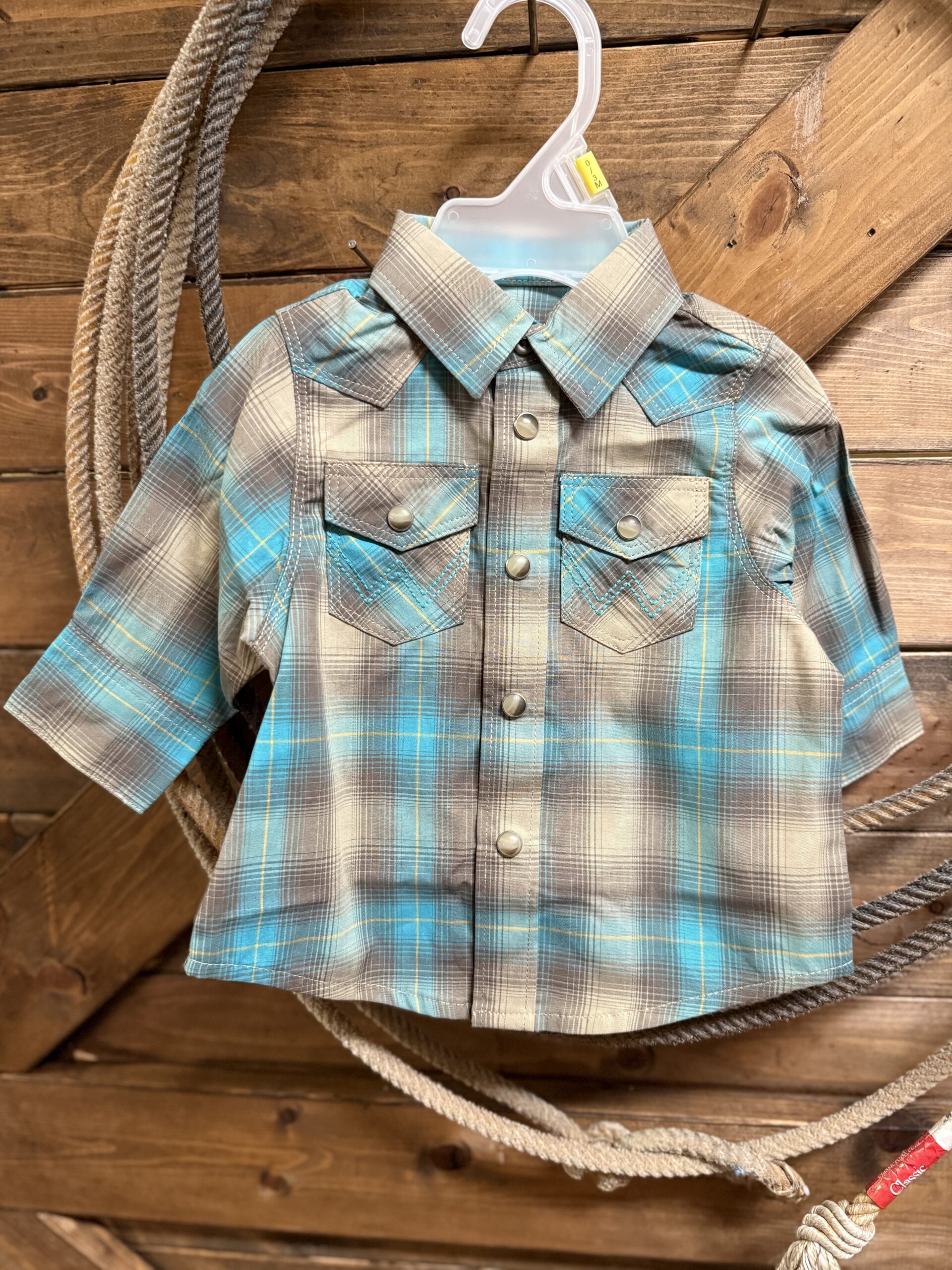 Little ones need cool western clothes too! Tan and turquoise scream western in color pattern. It’s a classic long sleeve with traditional pearl snaps down the front. Featured on the front are two pockets with a single pearl snap closure. It’s just simply cute for him or for her!