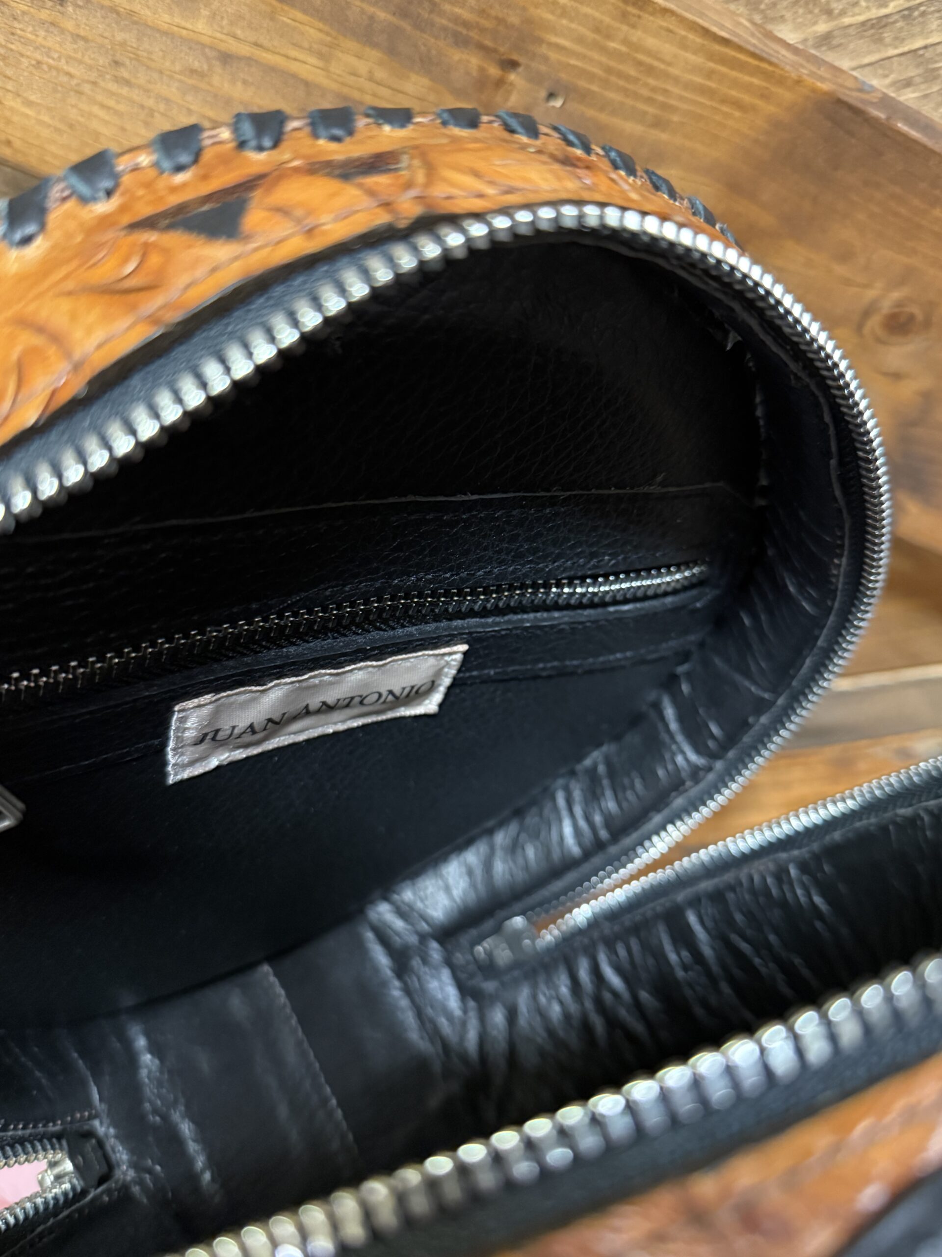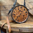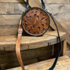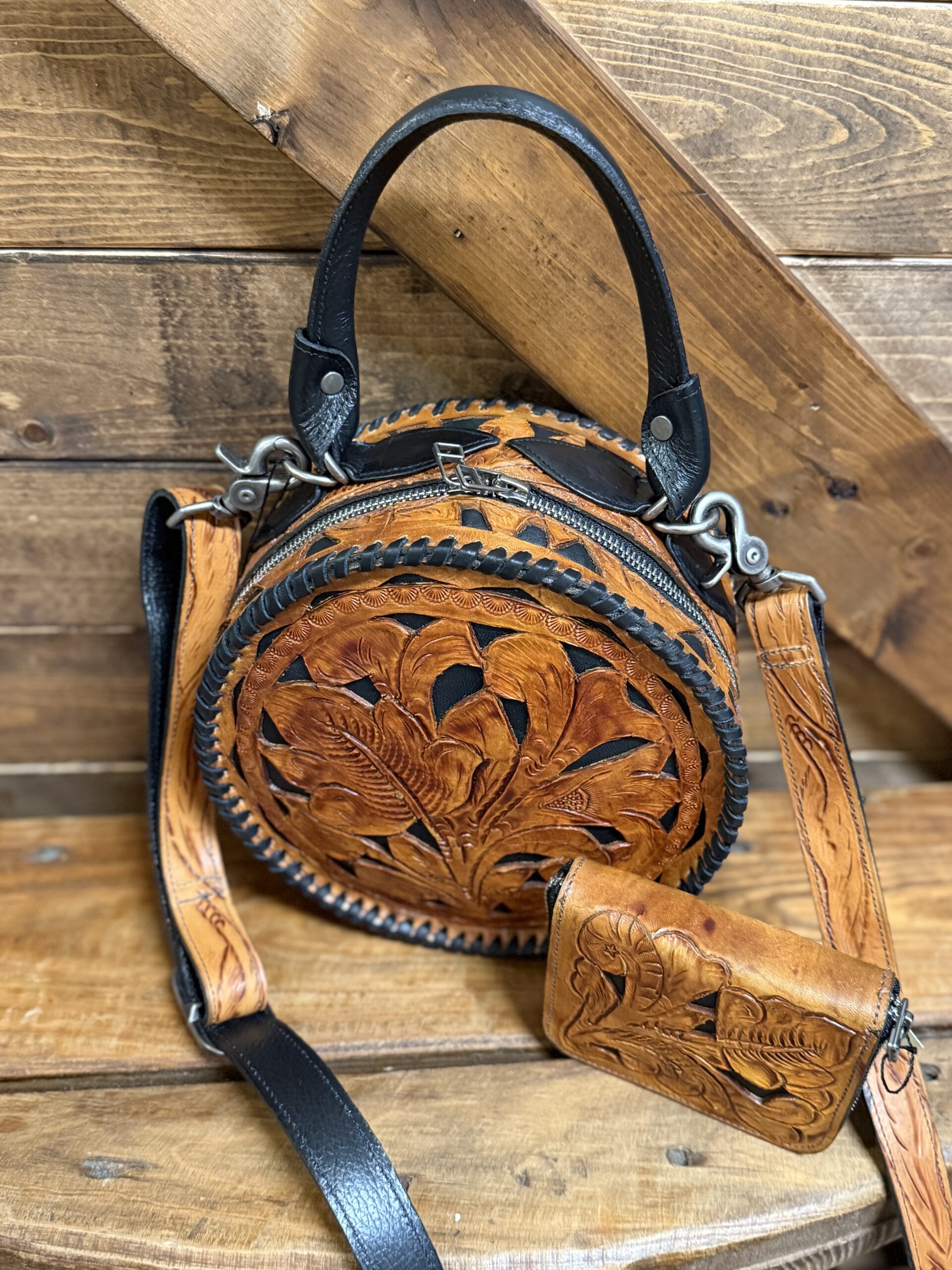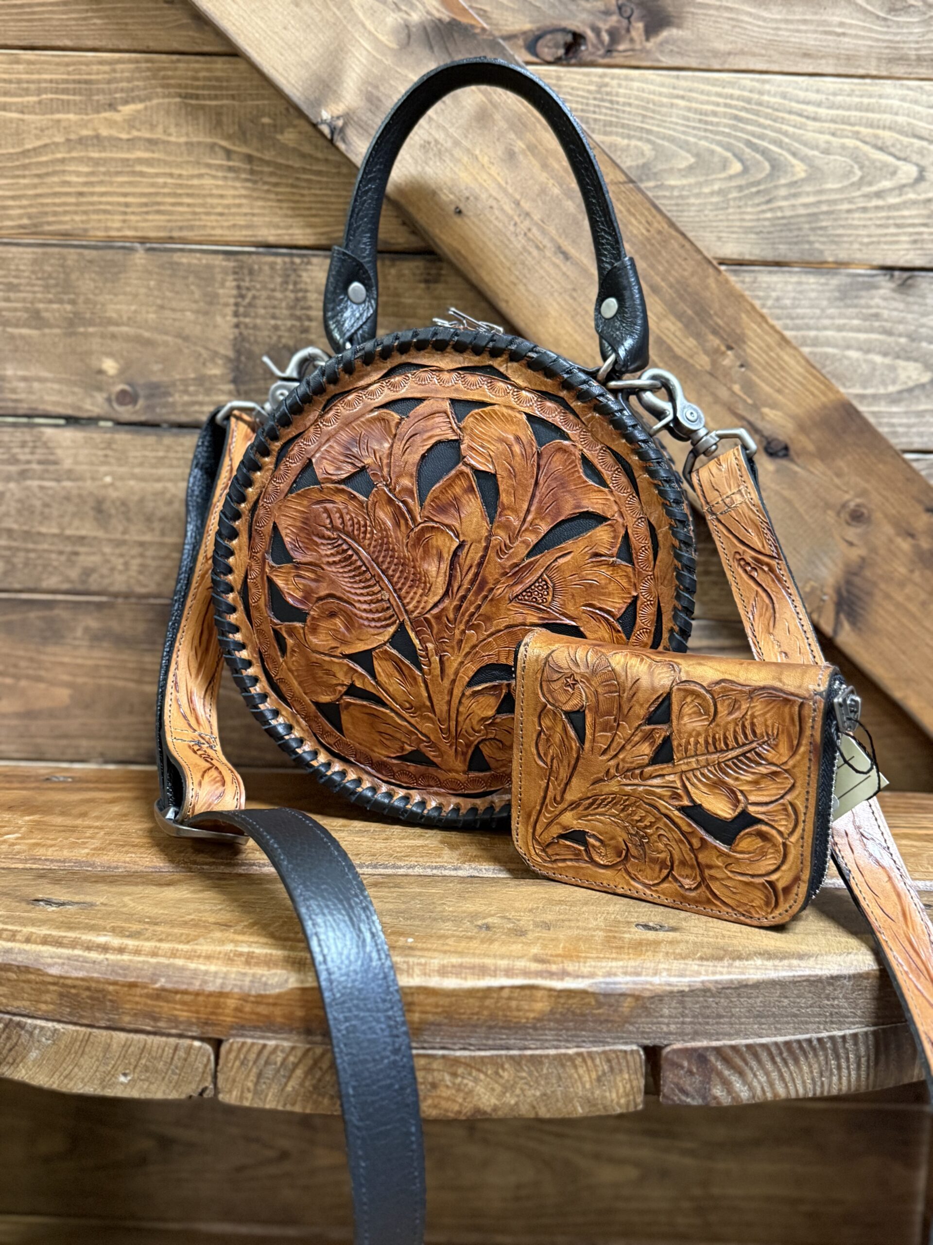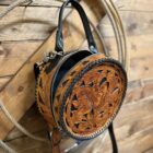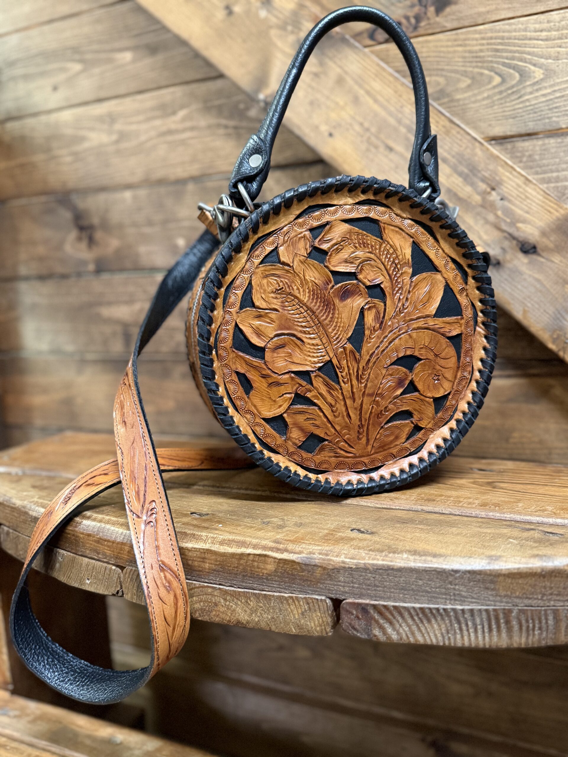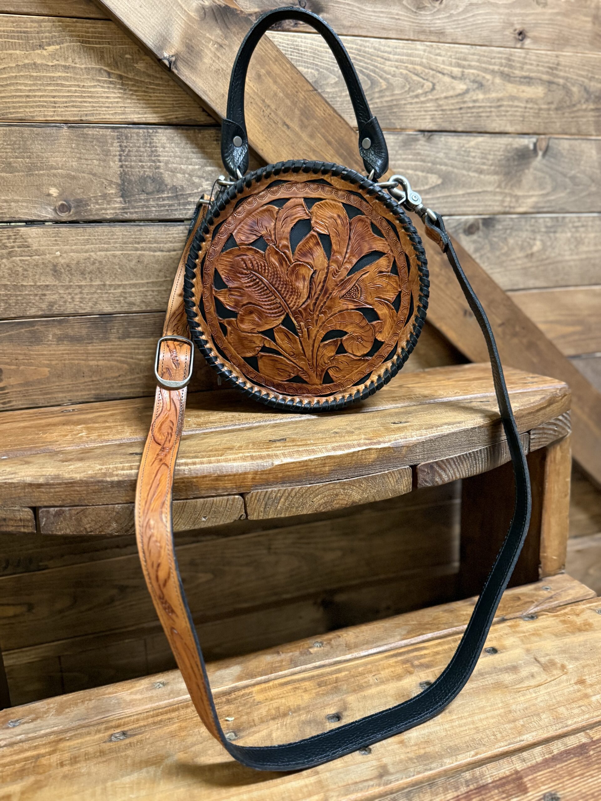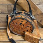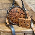 Lovely! So pretty in the combination leathers. Saddle brown featuring the black inlay is a stunning combination. Gorgeous hand tooled florals cover both the front ant the back. Matching shoulder strap is easily removable should you prefer to carry it by the single hand strap wrapped in a smooth black leather. The purse opens on a single zipper with 2 pulls going all the way to the bottom of the purse. You will love the size if you like a smaller purse.