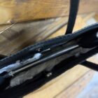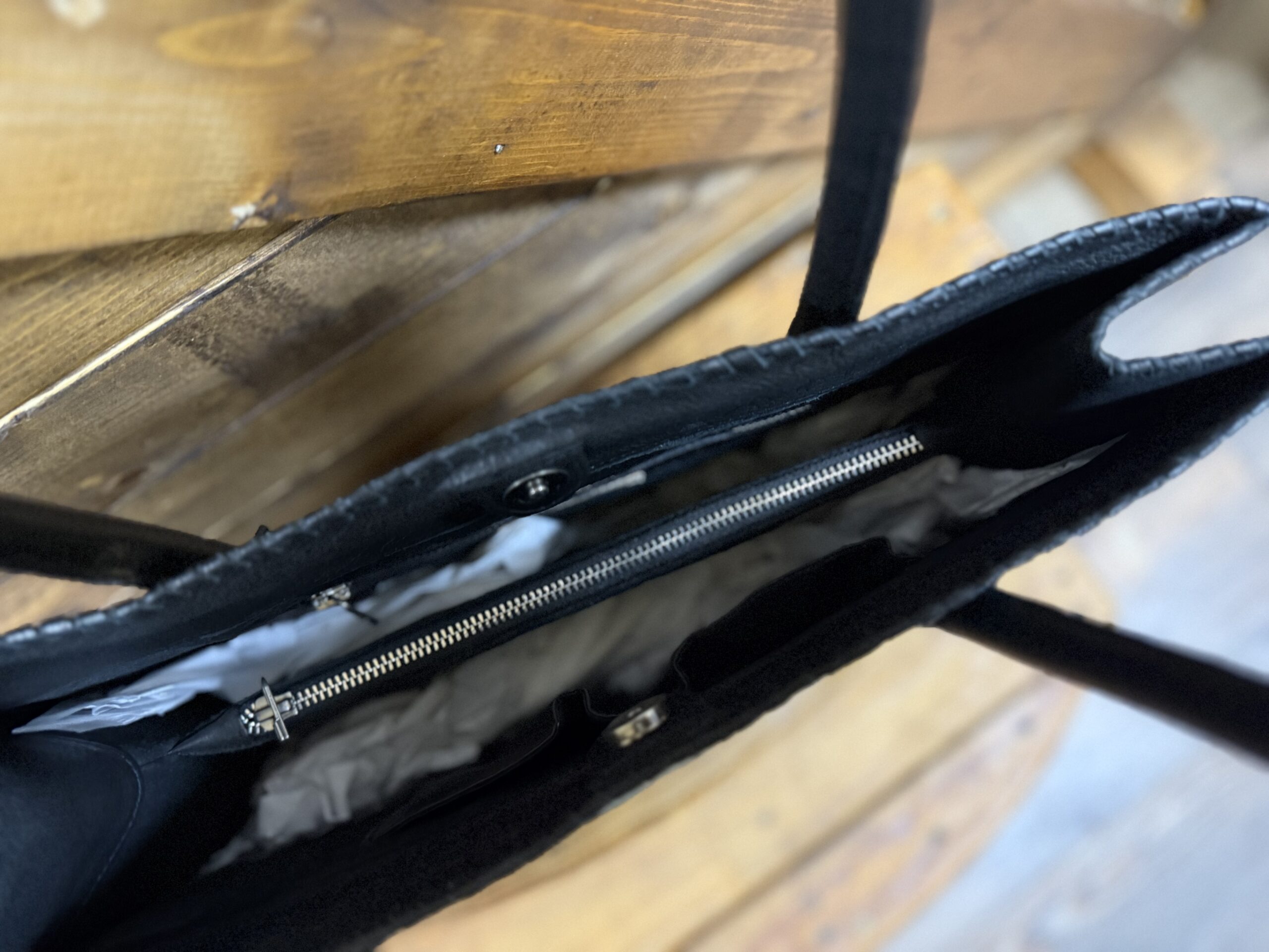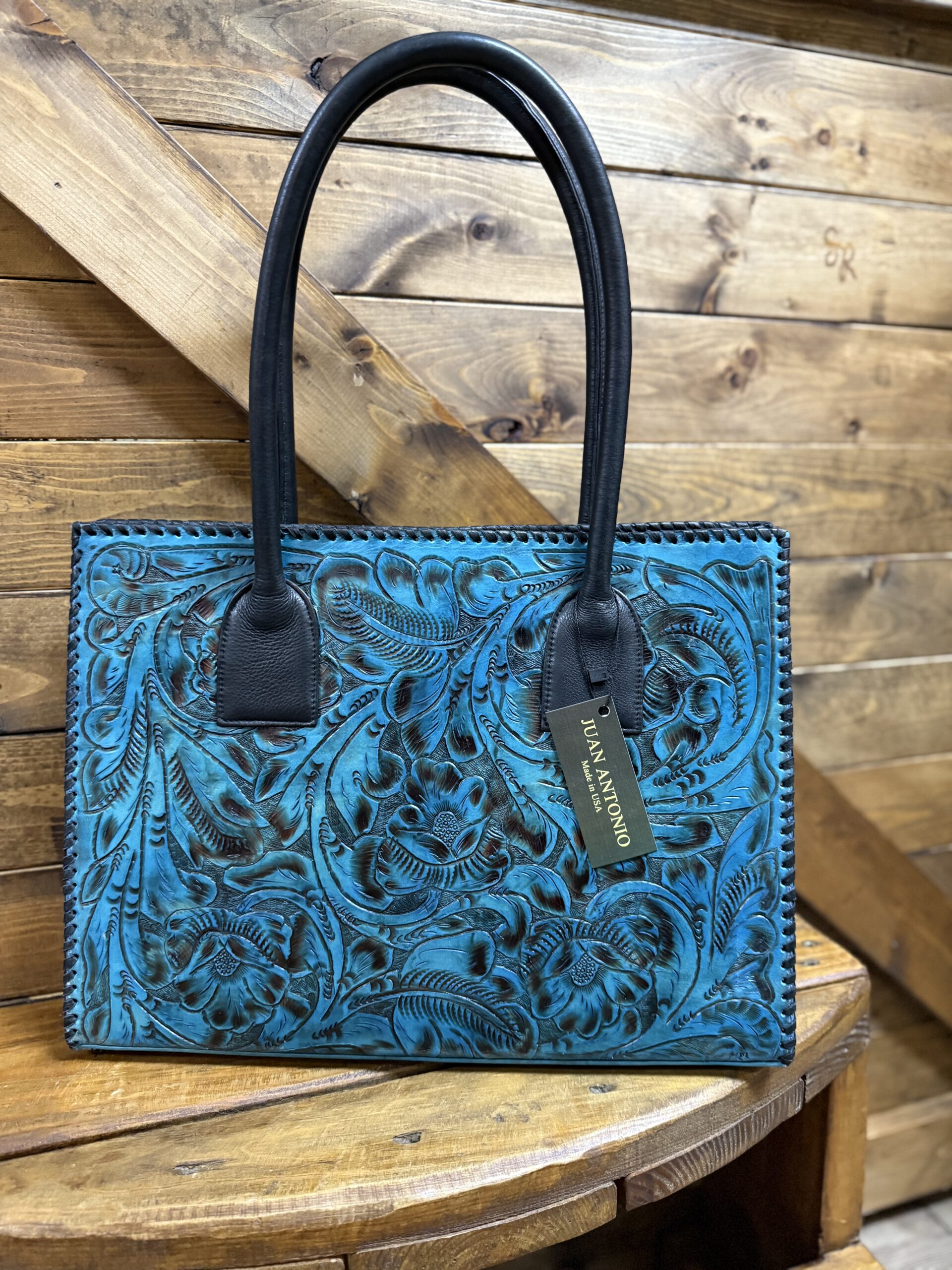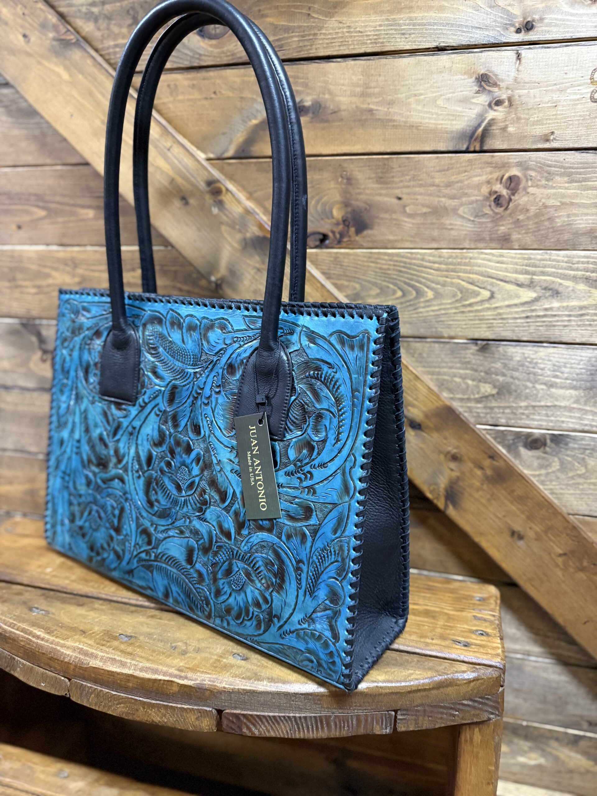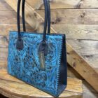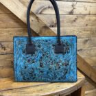 Beautifully done! Gorgeous combination of turquoise and black on a hand tooled shoulder bag! The same beautiful work is showcased on both sides of the bag leaving the ends a pretty solid black bison leather. The handles are smooth rolled in the same black leather that laces around the edges. The bag closes on a single magnetic snap. The inside is a large compartment split with a full length zipper pocket in the center. One side features a small zipper pocket and the opposite side displays 2 small slip pockets. This bag is simply beautiful! From the colors to the leathers on display, you can’t go wrong. Plenty of interior space for anything you can’t leave home without!