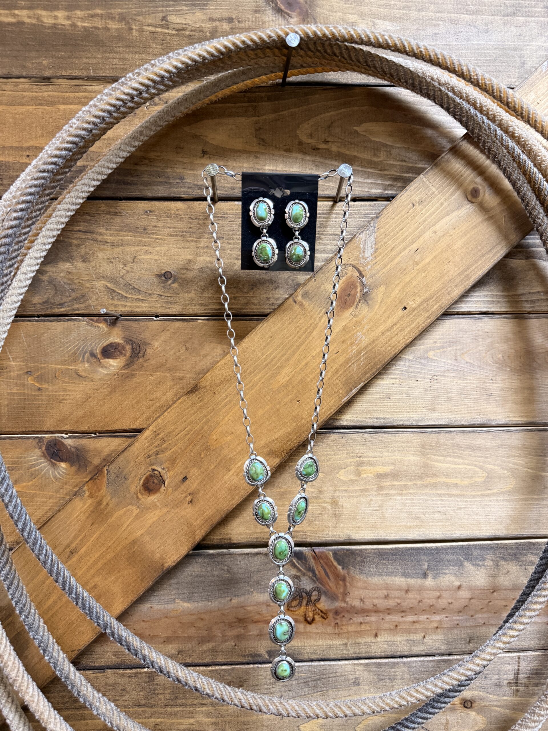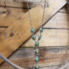 Authentic Native American made sterling silver and 8 stone Sonoran Gold turquoise lariat necklace on oval belcher chain, included with 2 stone matching earrings