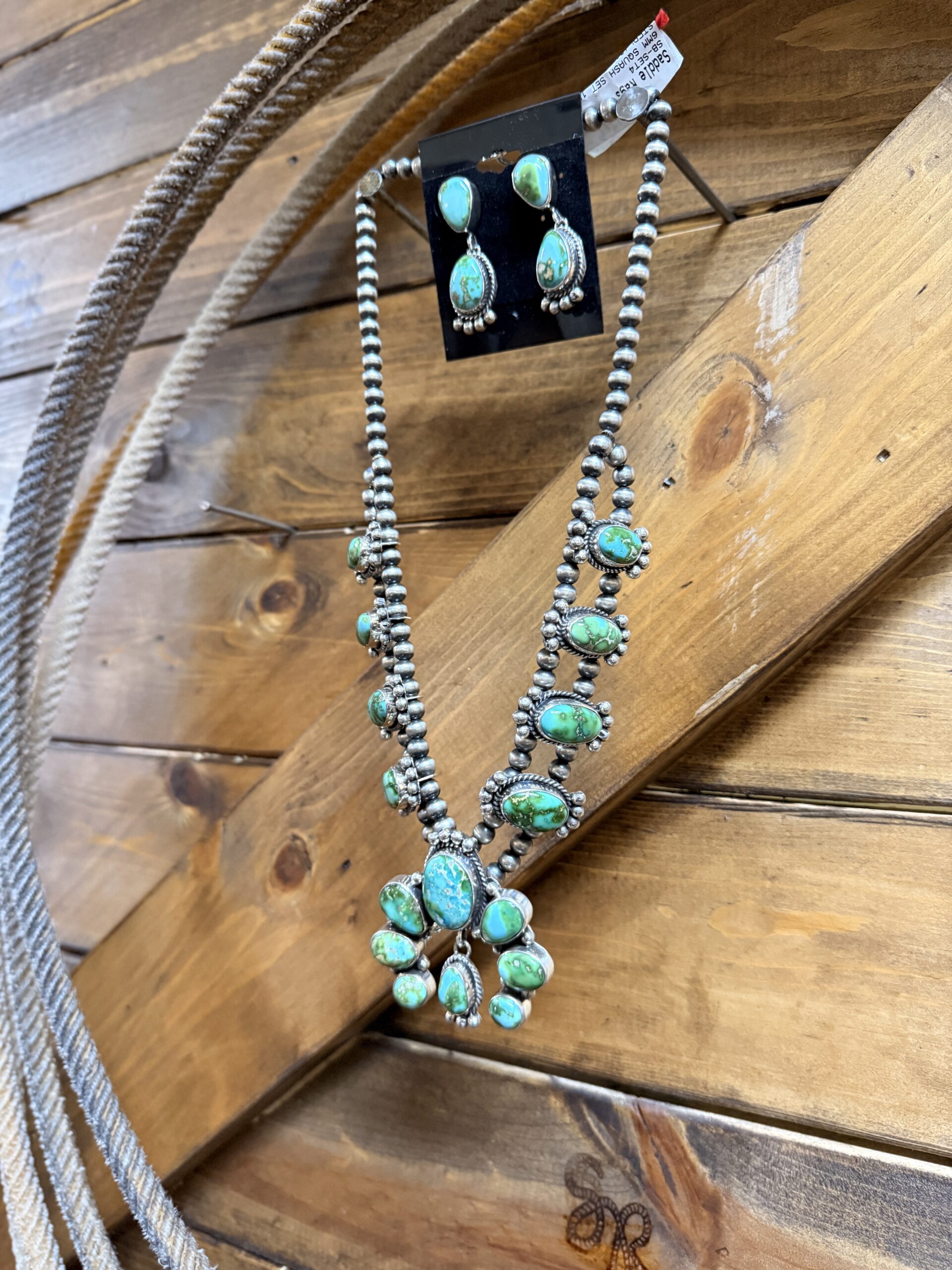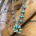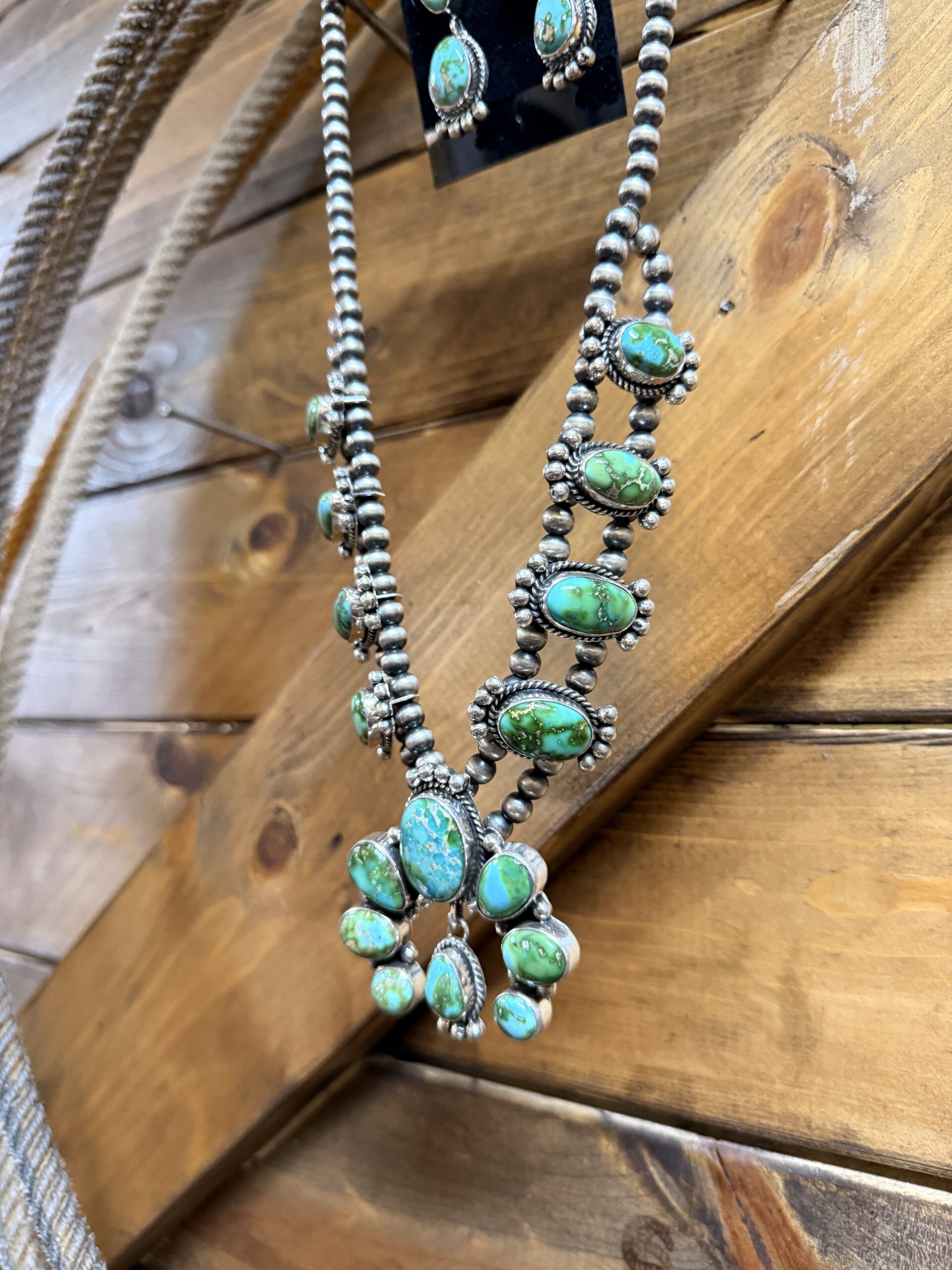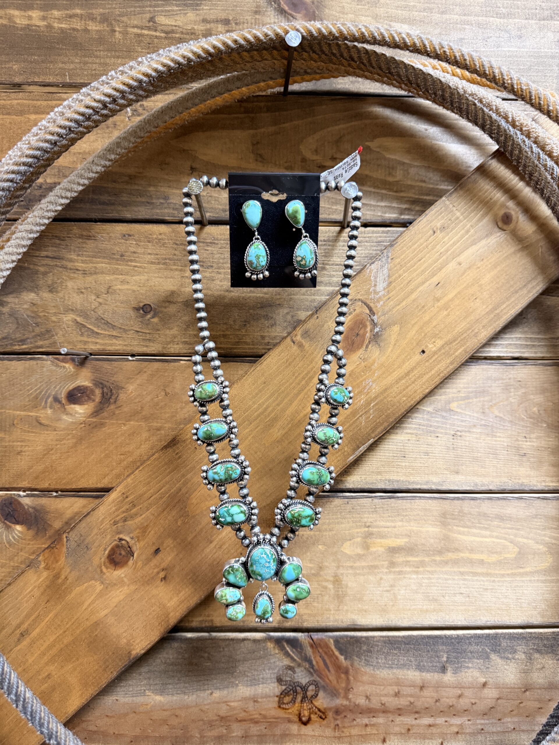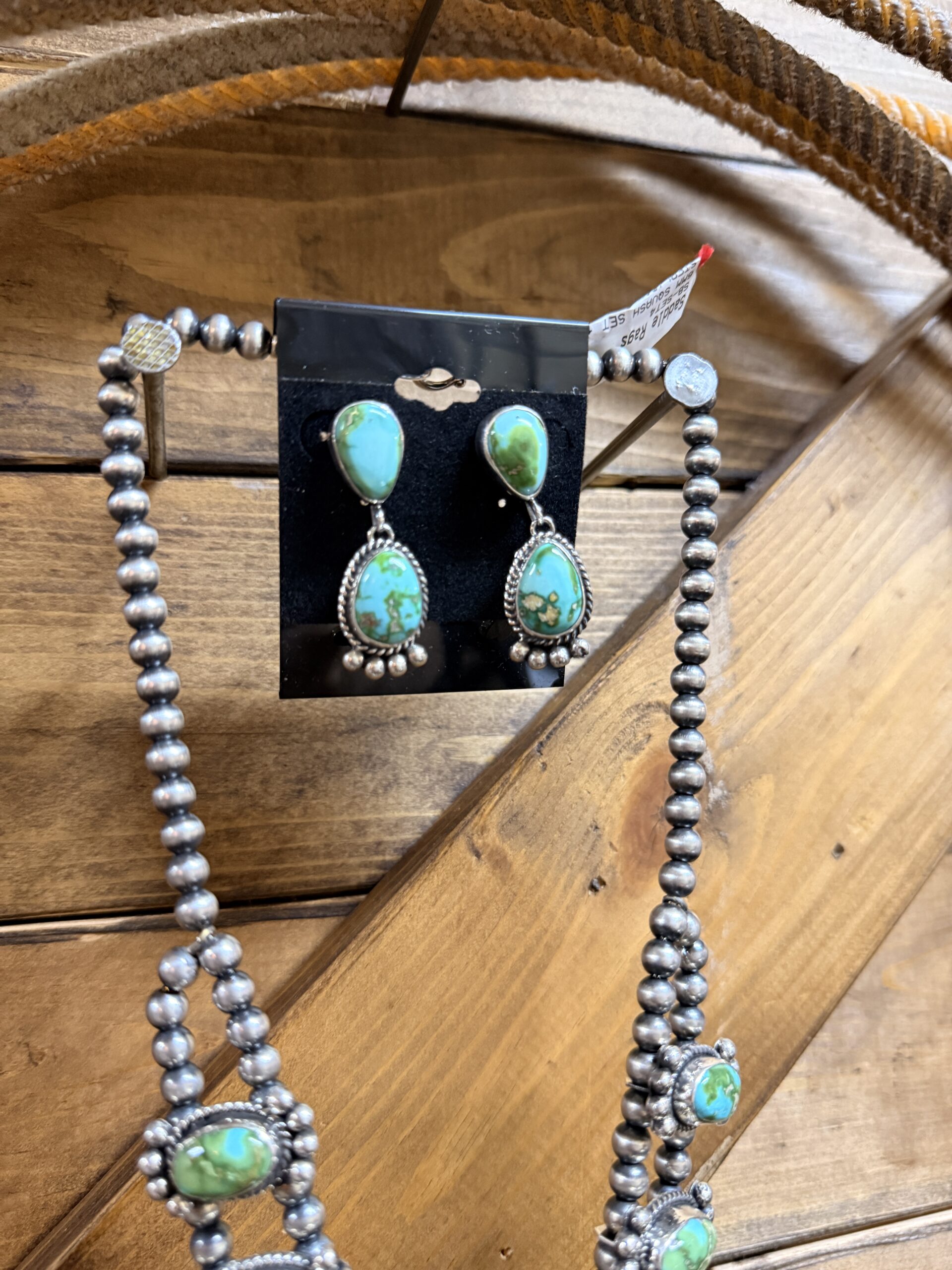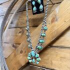 Double row Navajo Pearl 6MM strands framing 4 Sonoran Gold turquoise stones with 8 stone naja. Includes pictured 2 Sonoran Gold stone post drop earrings.