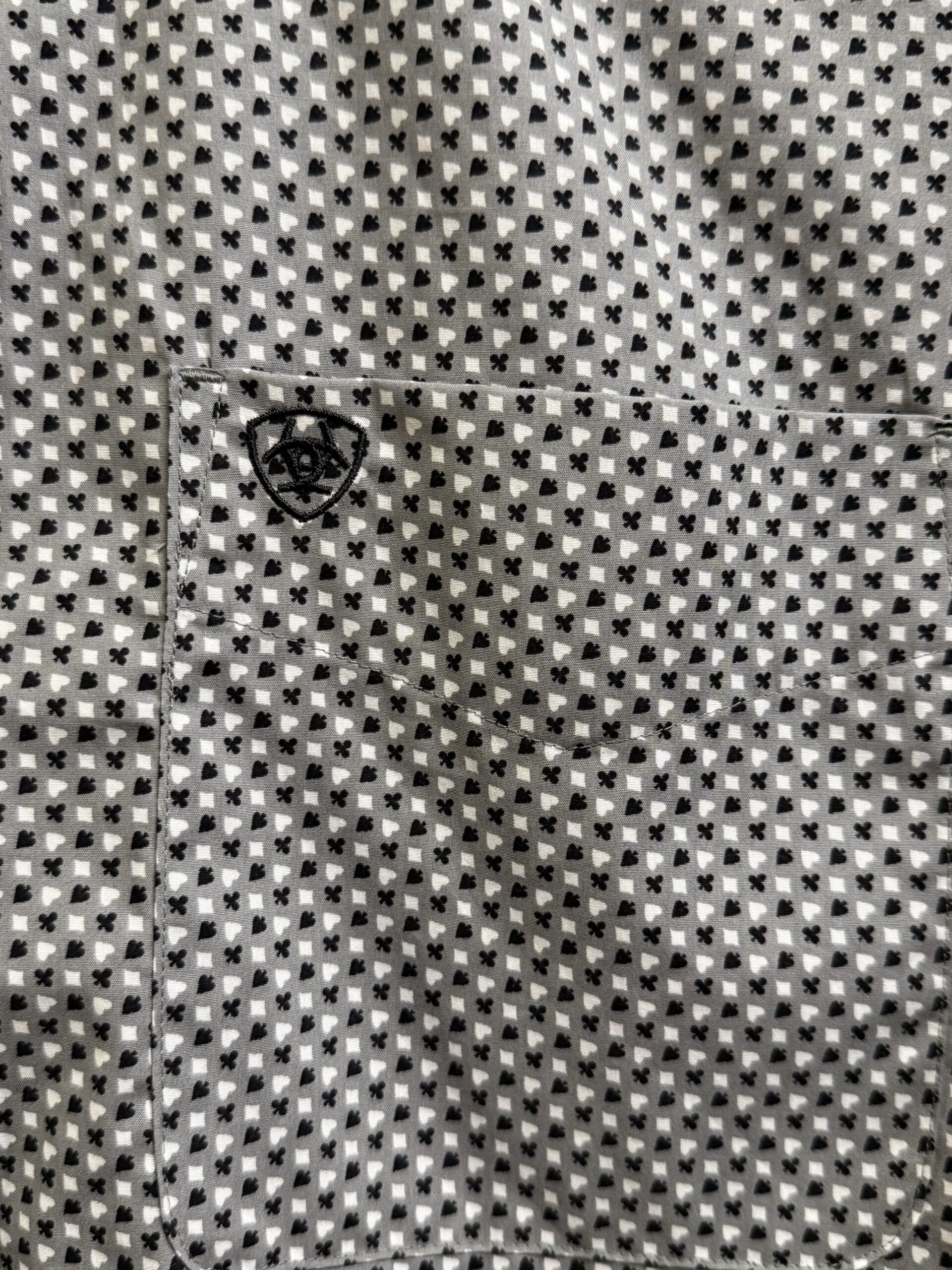 Black and white patterns and prints are always a good choice. Spice up the print but stay with black and white in this one! A combination of aces, hearts, spades, and diamonds has us in our lucky feels! Maybe even Vegas! It’s a fun print in basic toned down colors. The classic fit offers a generous cut with extended lengths and more room in the arm area to move more freely. The open front pocket on the left of the chest is  embroidered with the Ariat logo in black thread. Classic white buttons go down the front, pin the collar down, and adjust the sleeve ends. Style and color meet here!