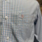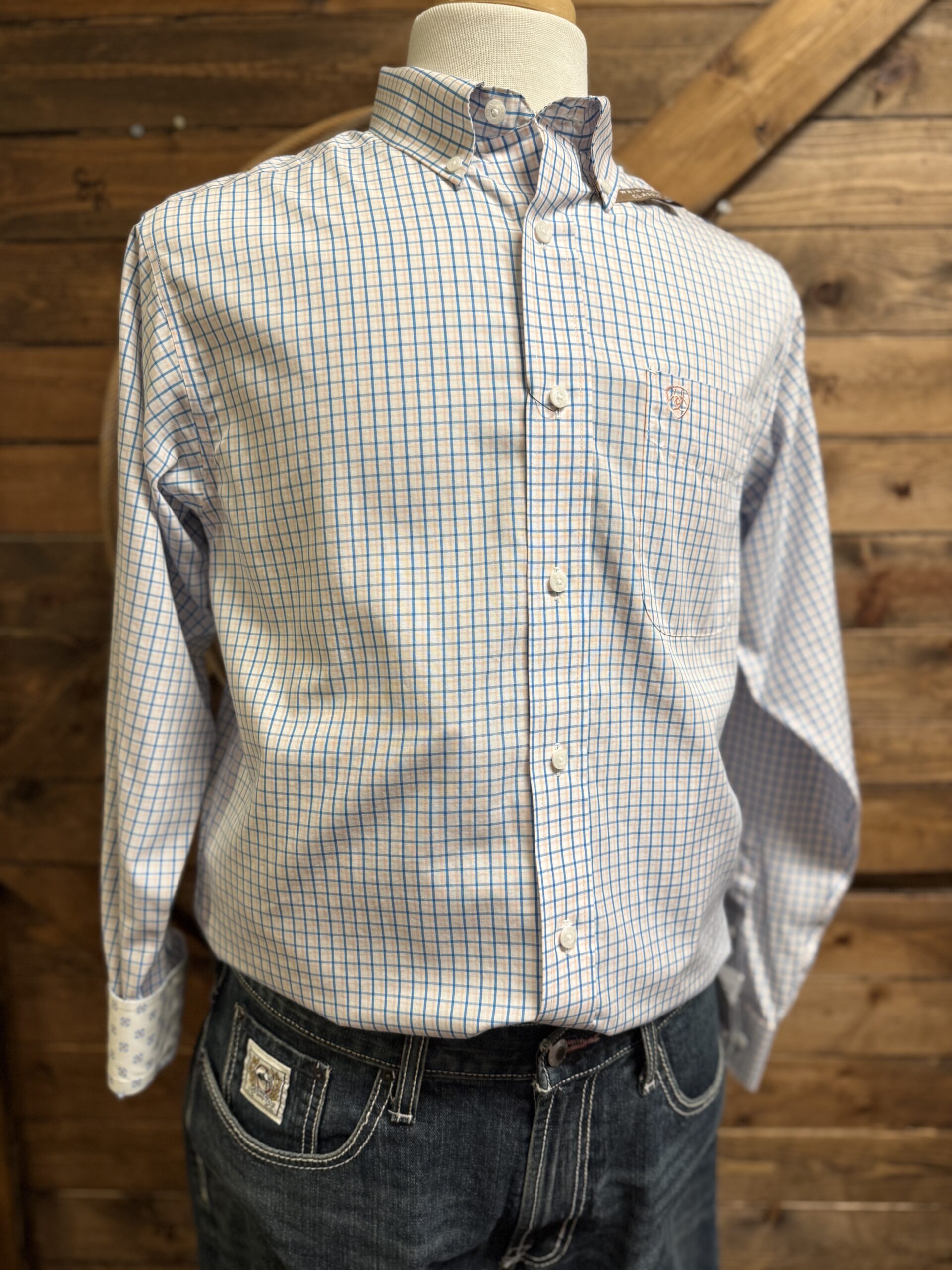 Long sleeves button downs in the most popular WRINKLE FREE material. Designed that way to make your wear and care a little less stressful. The classic fit ensures a generous cut with an extended length in the arms and body. The arm area has a greater mobility allowing you to move more freely. Nice light color pattern of a white shirt with a blue and light pink plaid design. Nothing too fancy, the plaid is always a safe bet when it comes to patterns. Classic white buttons line the front, pin down the collar, and are on the cuff in a 2 button adjustable set. This allows you to choose the most comfortable fit at the wrist. An open front pocket sets on the left side of the chest with the Ariat logo embroidered in a metallic pink thread. Easily worn to the office, the classroom, or pairs nicely under a solid sport coat.