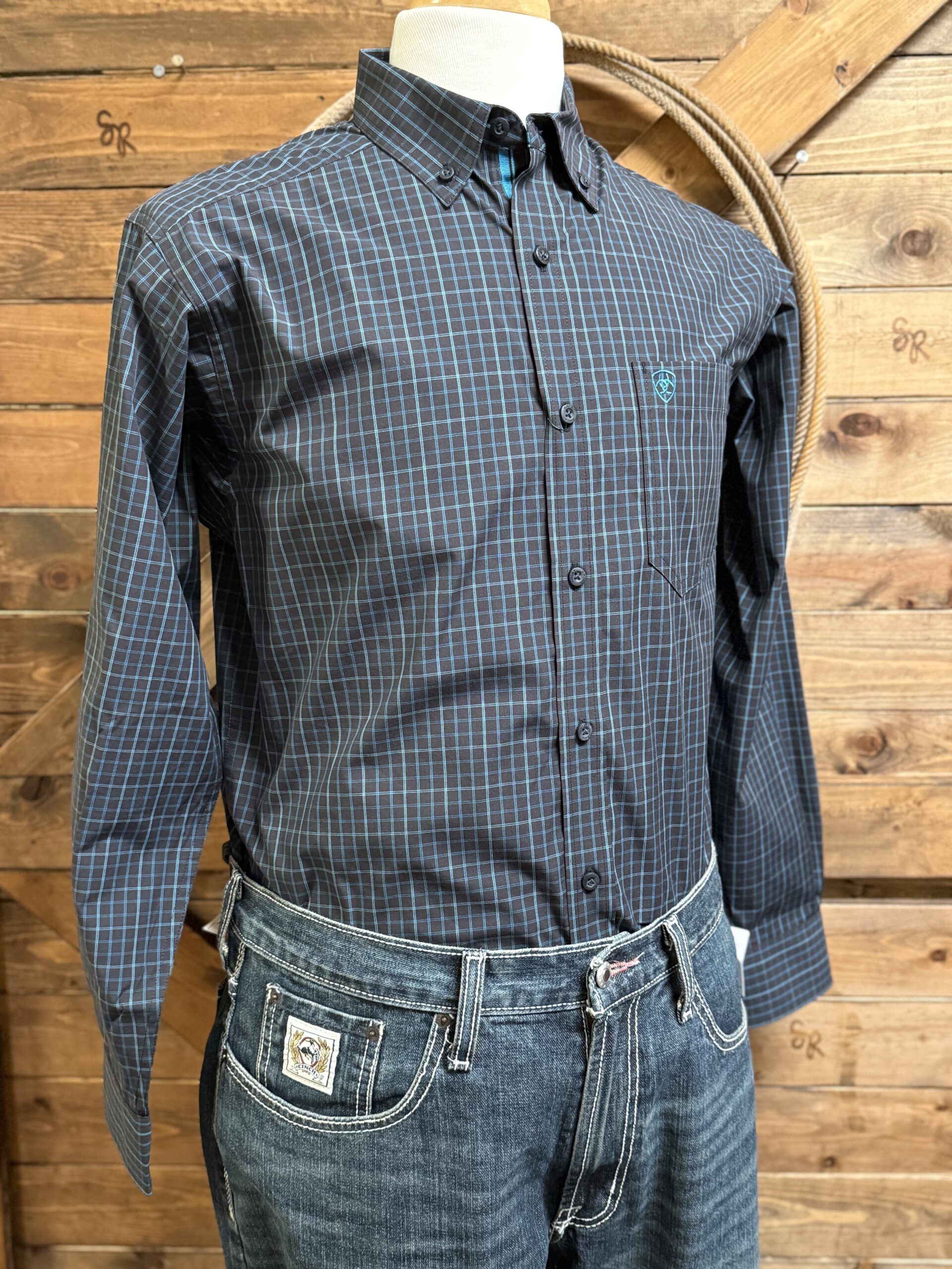 Ariat Pro Series button downs are designed with a classic fit allowing you to move more freely in the arm area. The material is designed with a sun protection fabric that also transfers moisture away from your skin. A comfortable fit all day is what it’s made for. Color match navy buttons line the front, pin down the collar, and adjust the sleeve on a 2 button set. An open front pocket is on the left side of the chest with the Ariat logo embroidered in a lighter blue metallic thread. Be comfortable, be in style, and be cool.
