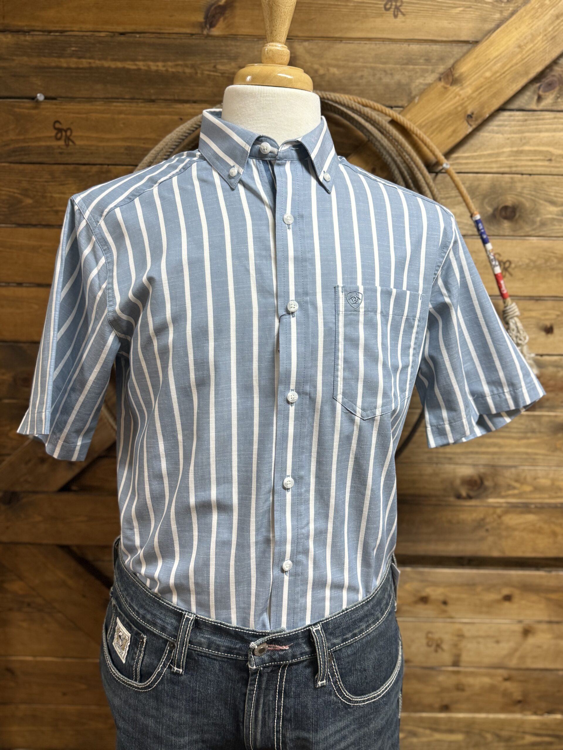A clean blue and white stripe in the Ariat Pro Series line. The classic fit offers a generous cut and extended lengths to ensure a perfect fit. Made with a material that is good in a lot of ways. It is rated 25 UPF to provide a great uv protection as well as moisture movement technology that will transfer moisture away from the skin keeping you dry, cool, and comfortable. Classic white buttons line the front and pin down the collar. An open front pocket sets on the left side of the chest sporting the Ariat logo embroidered in the upper corner. Great look for that warmer weather. You can’t got wrong with a good striped shirt!