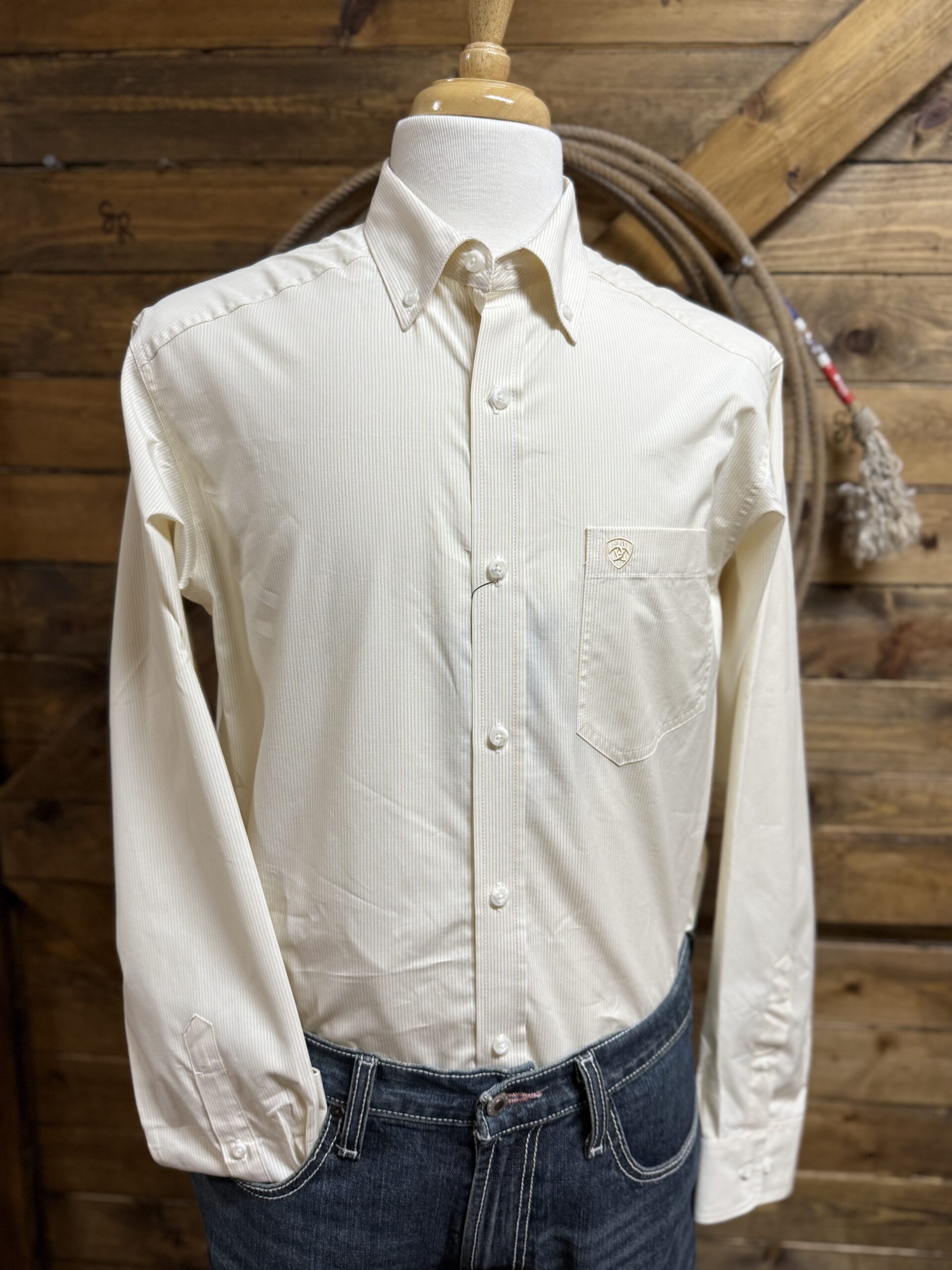 It’s hard to beat the pro series! A true classic fit long sleeve shirt with greater arm mobility. This allows you to move more freely. The material is designed with a sun protection fabric that provides a UPF rating of 25 shielding you from UV rays. It will also transfer moisture away from the skin with the featured moisture movement technology. A thin stripe in a light summer melon color. Like other traditional long sleeves, the front is lined with a classic white marbled button down the center, pinning down the collar, and again at the sleeve ends on a 2 button set. An open front pocket sets to the left side of the chest sporting the Ariat logo embroidered in the corner. This one is made for the working man who needs to look a little nicer. The perfect fit and features yet durable and sharp in style. Choose this one time and time again for whatever occasion may arise.