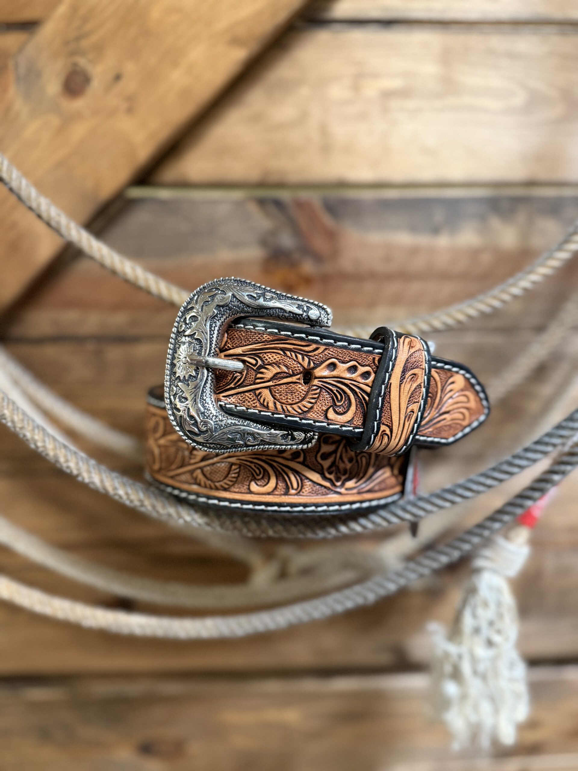 Beautiful floral tooling on a 1 3/4″ wide belt. The edges are finished in black and stitched with a white thread.