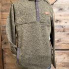 We have the ideal pullover for cooler weather! It’s a good mixture of brown and black and it’s perfectly lined with a layer of fleece for extra comfort and warmth. The buttons at the collar are brown with a matching bound hem across the neck and again at the bottom hem. The single large pocket across the bottom is accessible from each side. Cooler weather, no problem. We have your back!