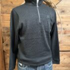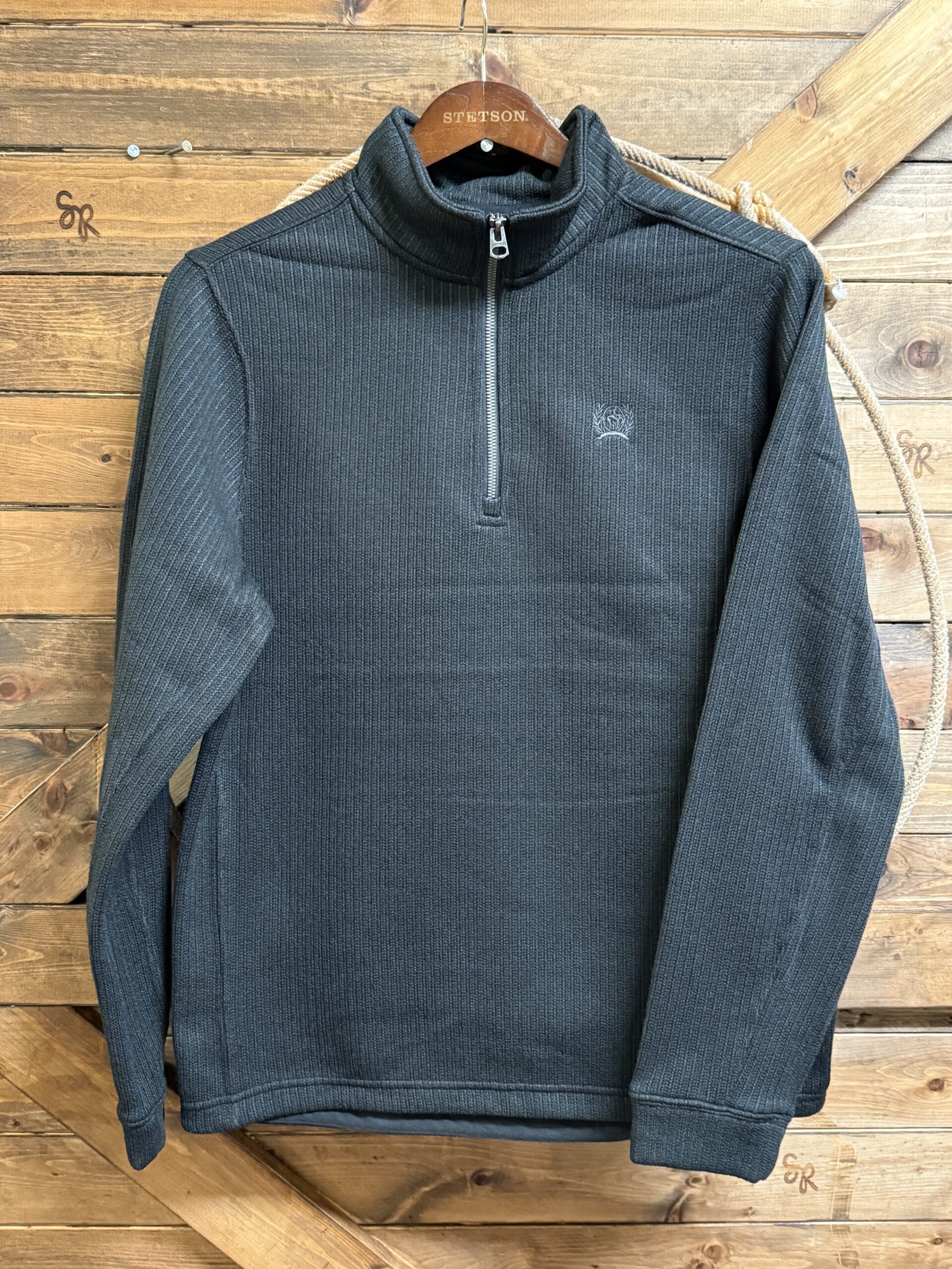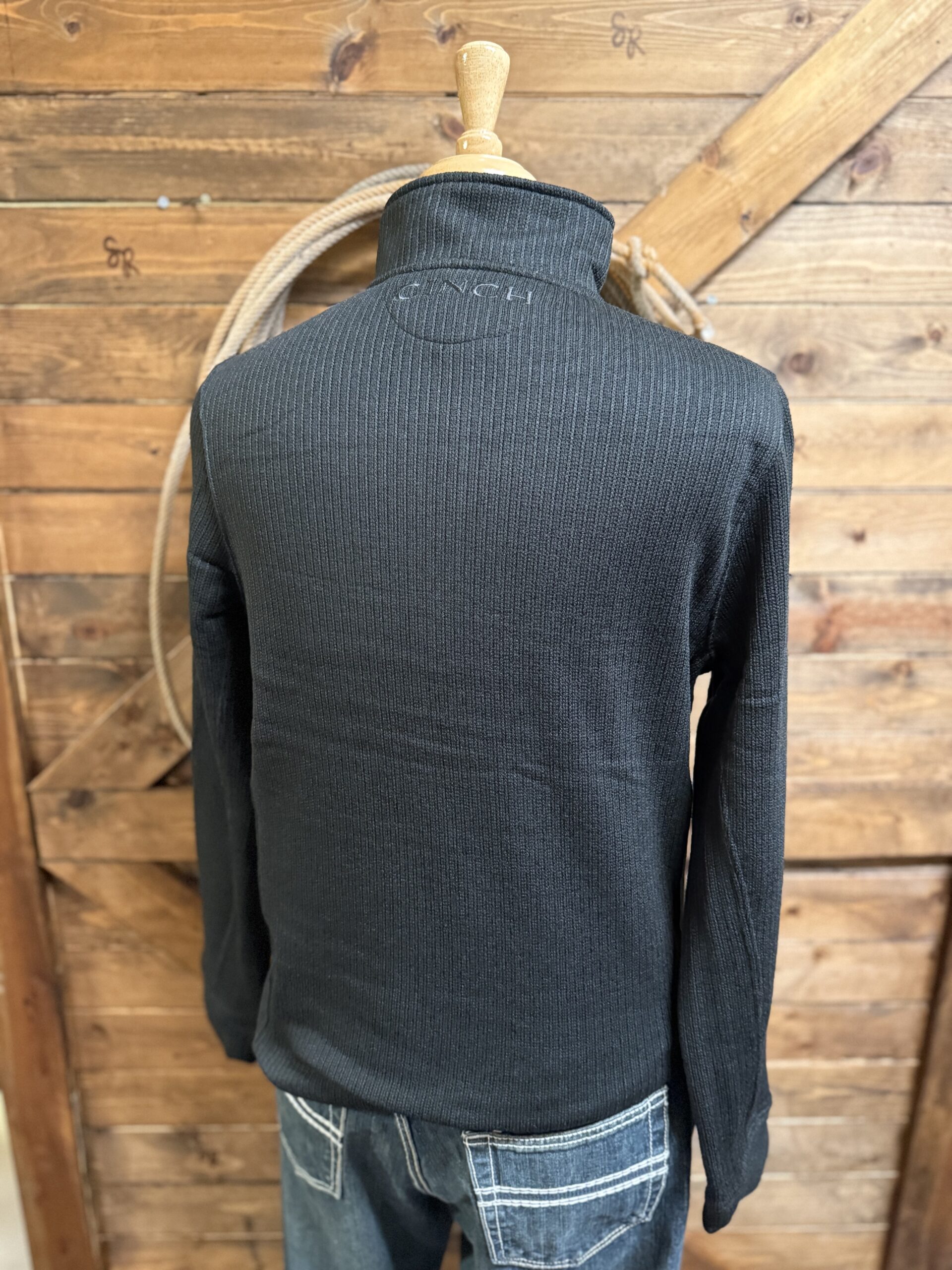 One of the most popular pullovers of the season is now in black. A super soft knitted pullover with 1/4 zip at the neck. Lined with a thin layer of black fleece, it’s meant for cooler weather. The clean black knitted look makes this pullover the kind you can easily dress up. Put a collared button up underneath and layer this over for a sharp look. The Cinch logo is displayed on the left side of the chest in a black embroidery. It is also spelled out across the back of the collar. This pullover does not have the front pockets. Its a great look for the approaching holidays!