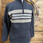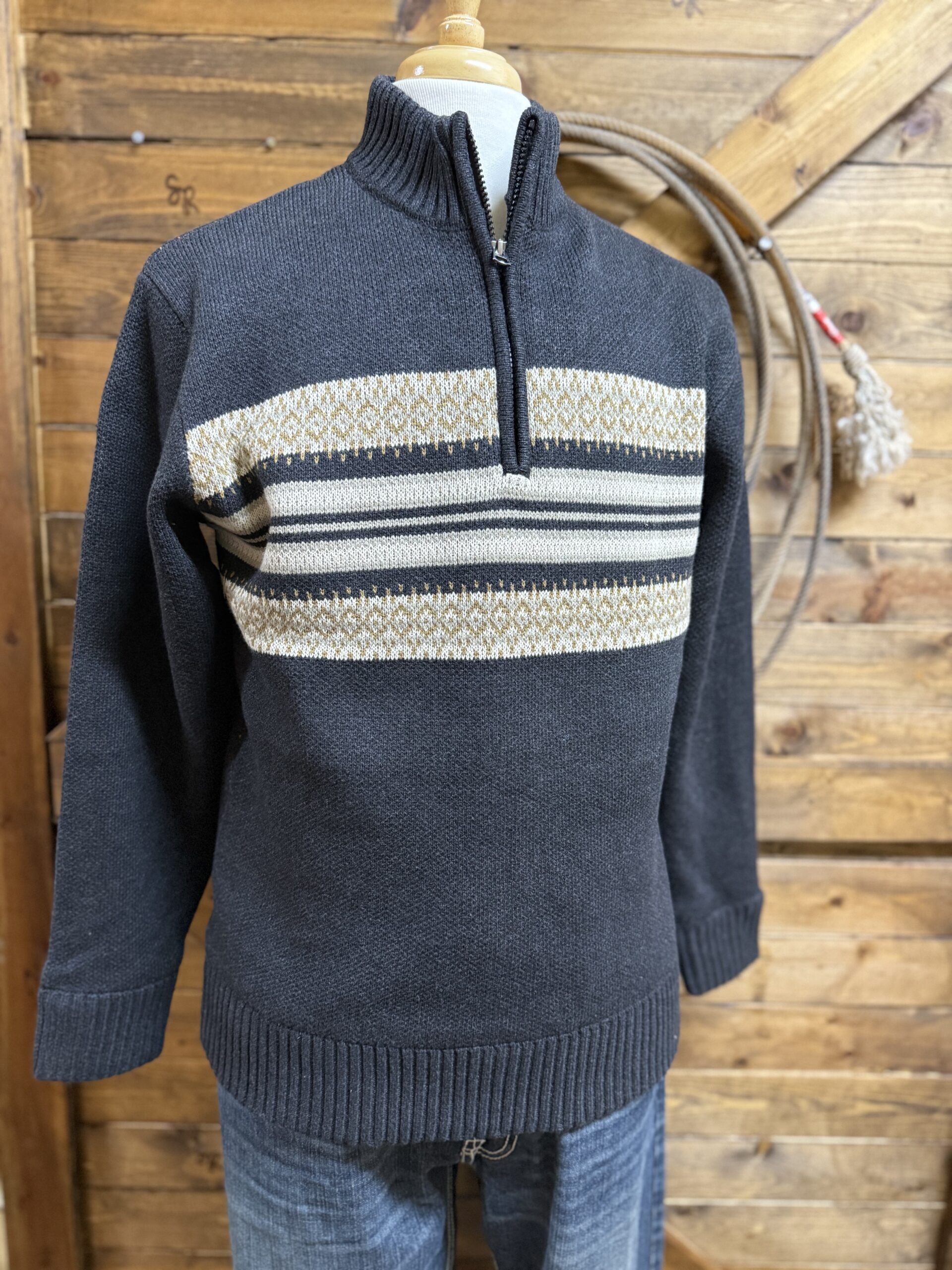 Great knit sweater for men! A heavy knit makes up the sweater in charcoal with a lighter knit print centered across the chest. A 1/4 zip comes down off of a stand up ribbed collar. This allows you to to layer with a collared button up or simply paired with a short sleeve under shirt. Great heavy knitting makes this sweater extremely comfortable and warm. The inside is lined for a warmer fit. It’s plenty heavy enough to wear in cold temps without a jacket. Perfectly made for outdoor events in which you choose not to wear a coat. Pairs very nicely with denim or slacks if you wish.