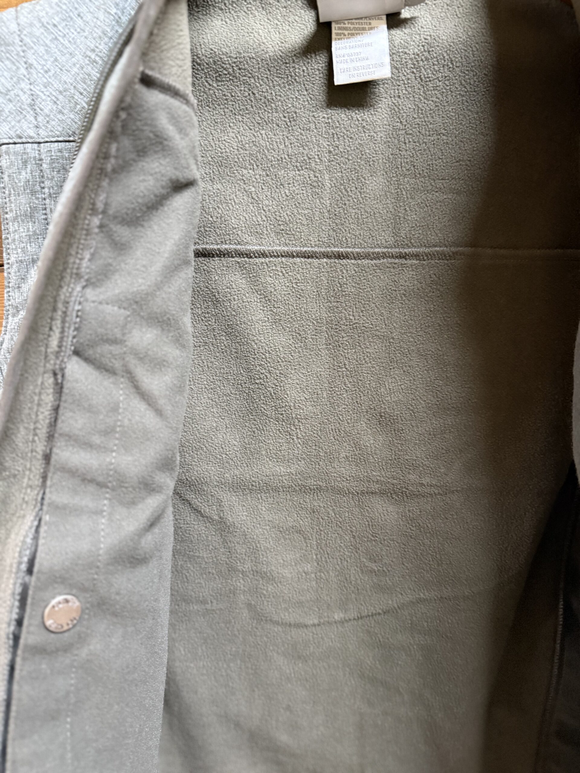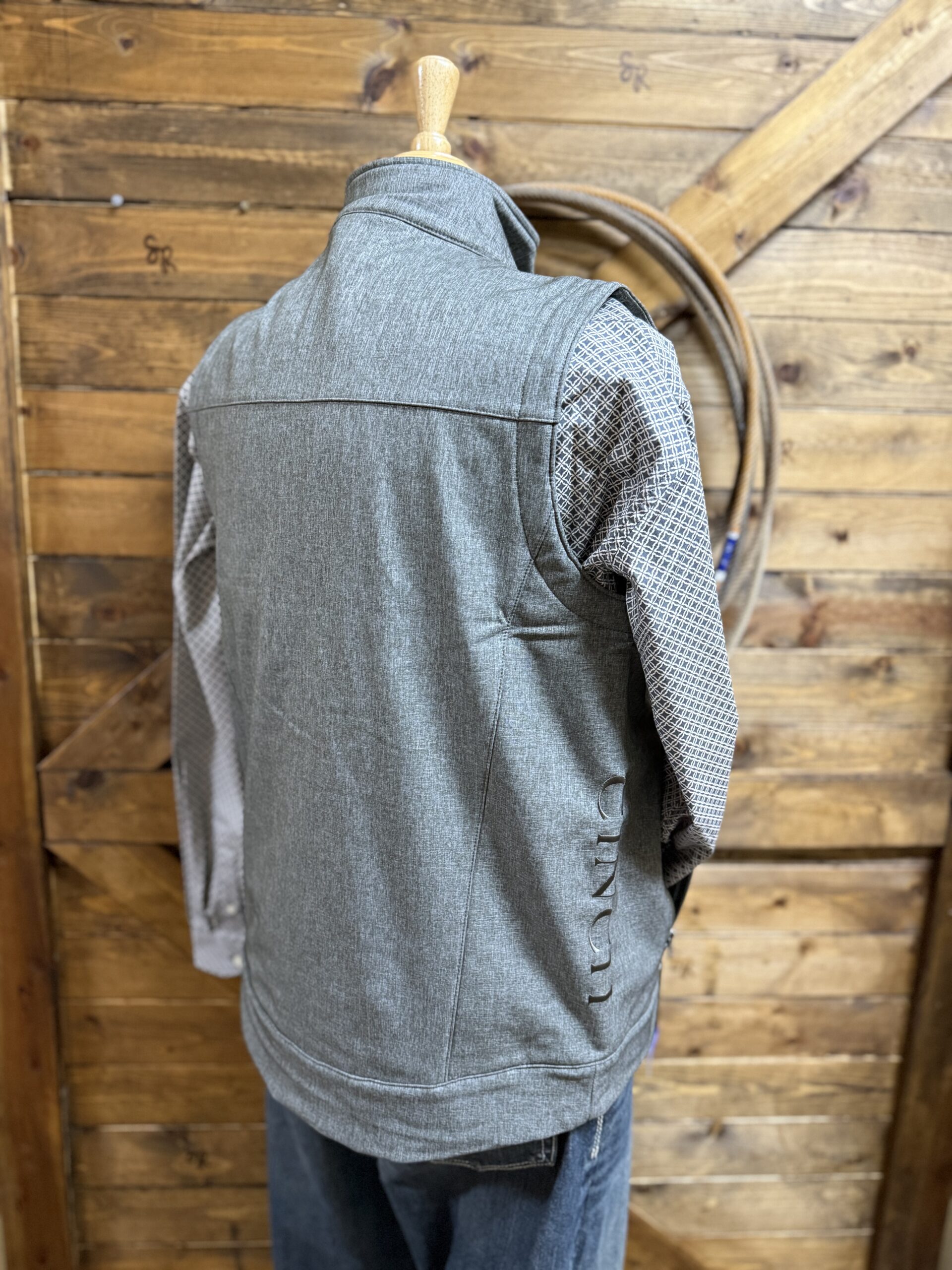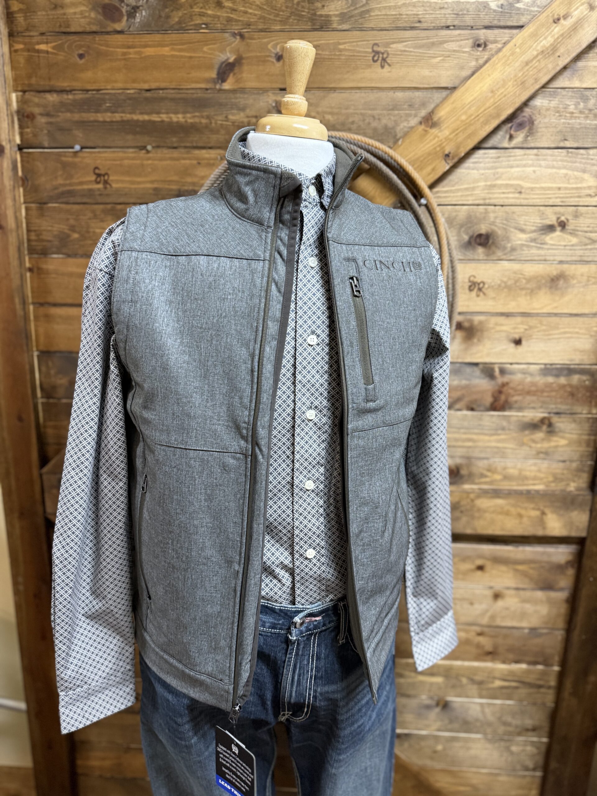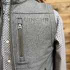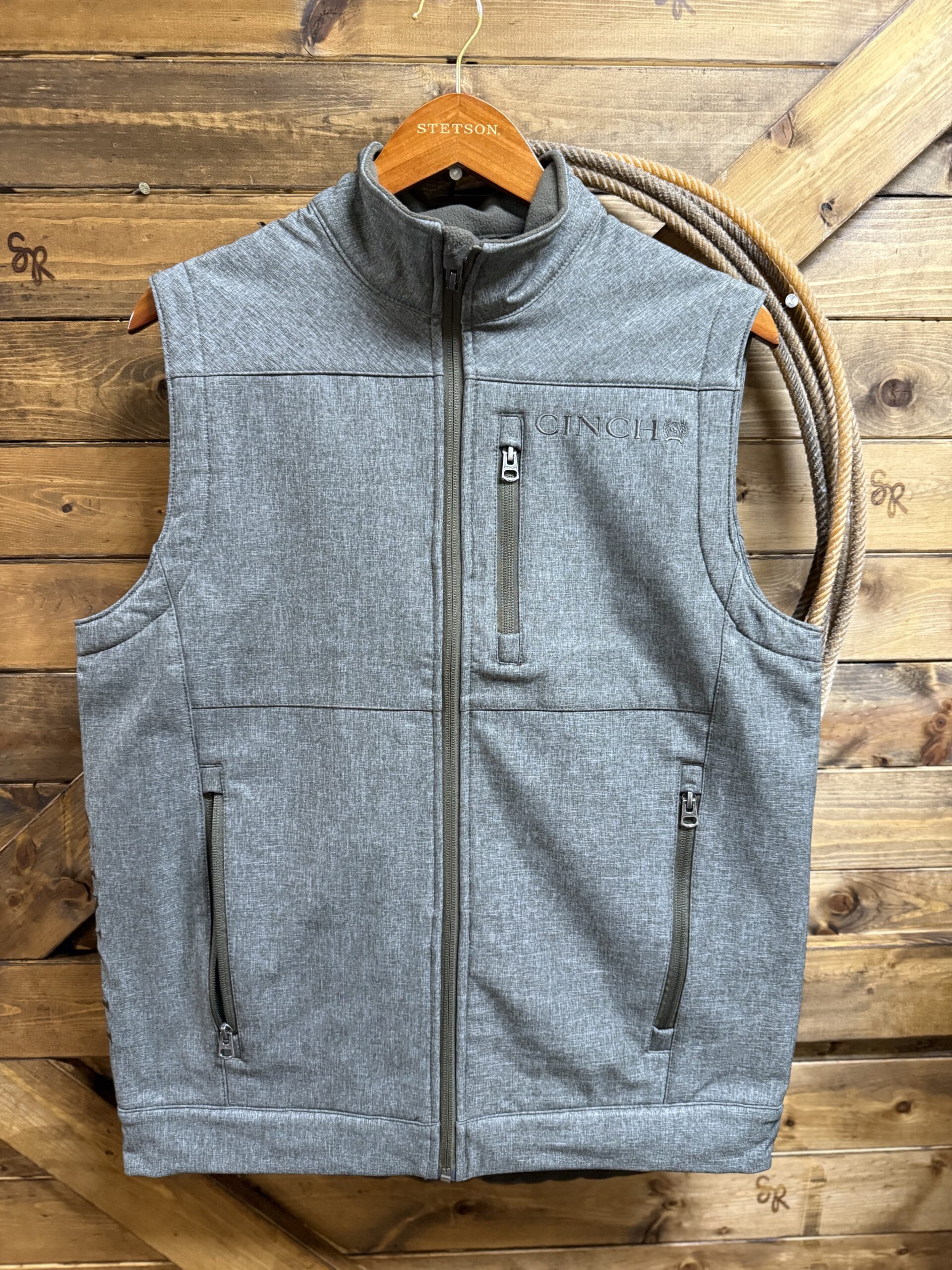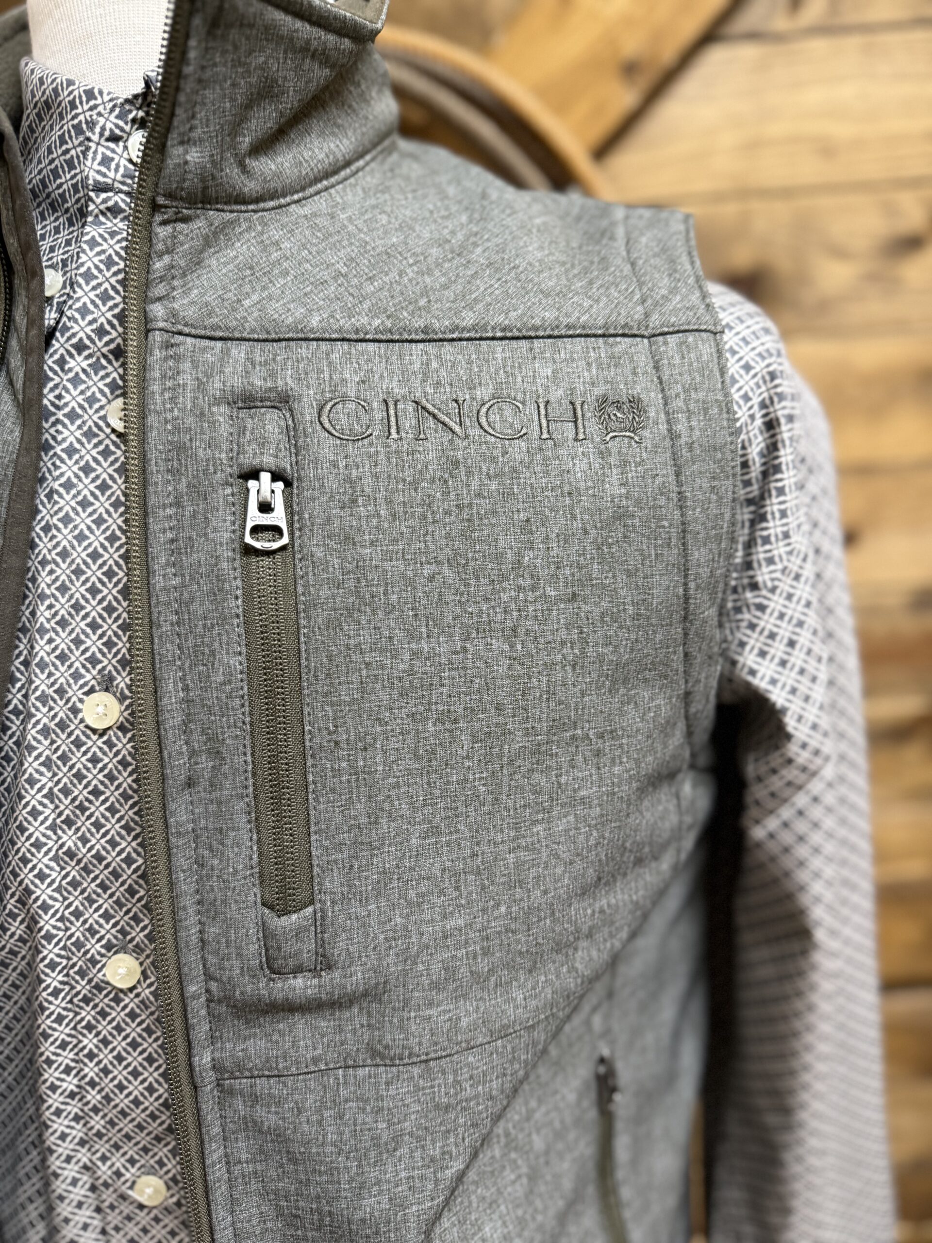 It’s your favorite bonded vest in grey! Olive toned accents line the front zipper, chest zipper, hand pockets and the collar. Fully fleece lined, in the same olive tone, for a warm wear. The vest is designed with storm defense technology. These features make it quick to dry and water/wind resistant. Easy to care for with a toss in the washing machine. The front features a full length zipper, hand pockets with zipper closure, and a vertical chest pocket with a zipper. Cinch is lightly embroidered on the left side of the chest as well as down the right side under the arm. Perfect to wear over a nice button down for a clean sharp look. Suitable for office days, errands in town, and everything in between! Even family pictures!