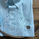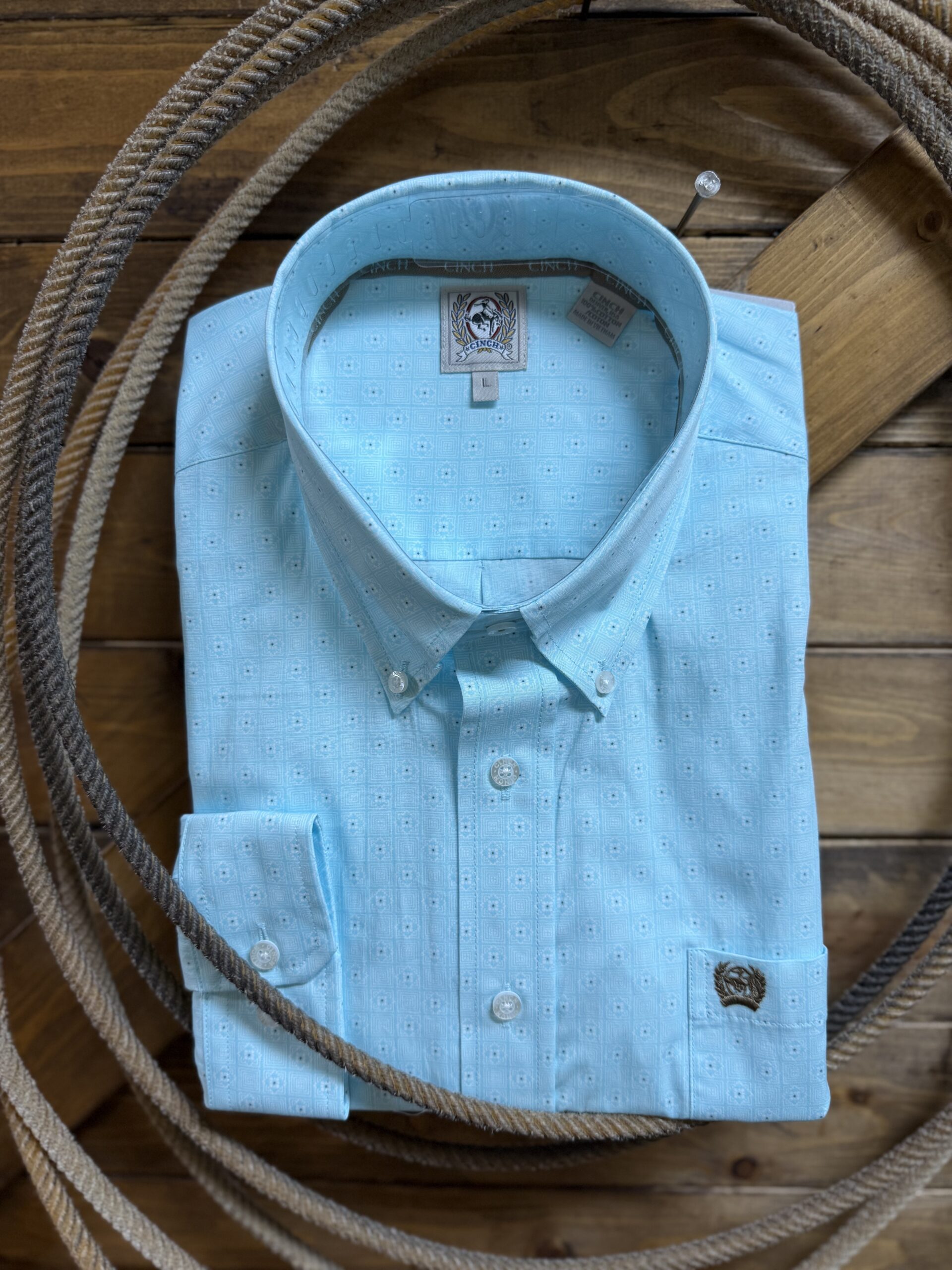 The long sleeve shirt that’s a need all year long. Classics from Cinch are a timeless look that is perfect for anything regardless of the season. In a refreshing light blue color with an alternating square pattern featuring a diamond print in white and brown. Classic white buttons line the front, pin down the collar, and securing the sleeve ends on a two button set. An open front pocket sets neatly situated on the left side of the chest with the Cinch logo embroidered in a chocolate brown thread. Perfect for an evening out, office days, or errand around town. They are made for everything from every day wear to dress occasions.