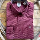 Classic fit with stretch! It’s a fit you are accustomed to the added comfort. The material is designed to move with you allowing you extra room in the places you need it the most. Pretty burgundy red features tan polka dots. The perfect look for holiday gatherings and events! Burgundy color match buttons line the front, pin down the collar, and adjust the sleeve ends on a 2 button set. The standard open front pocket sets to the left side of the chest featuring the Cinch logo embroidered in a pretty metallic brown thread. Great look that works at the office the same way it does at the office parties. Pair it with a nice sport coat if you choose!