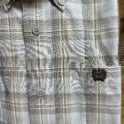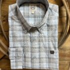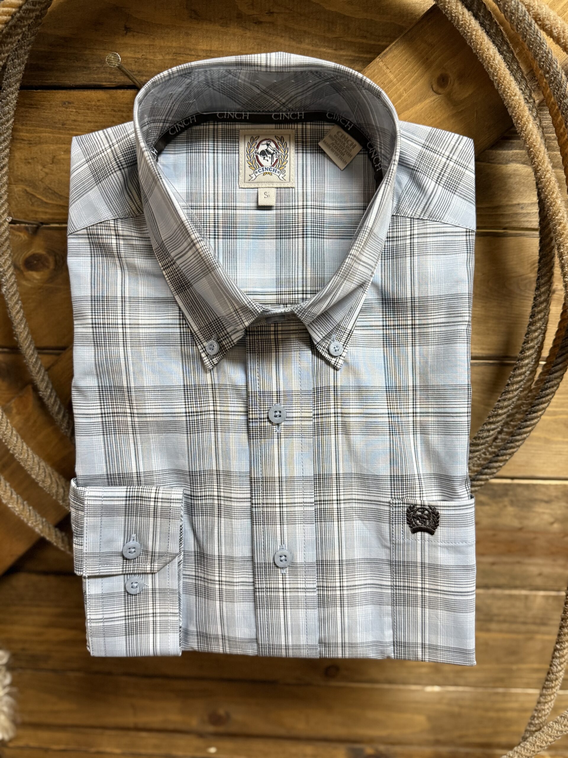 Classics in plaid. A good choice for any occasion or events! Pretty light blue plaid with tones of deep gray in the plaid. Color matched buttons line the front, pin down the collar, and adjust the sleeve on a 2 button set. The open front pocket is displayed on the left side of the chest with the Cinch logo embroidered in a deep gray thread. Classic looks for everyday events.