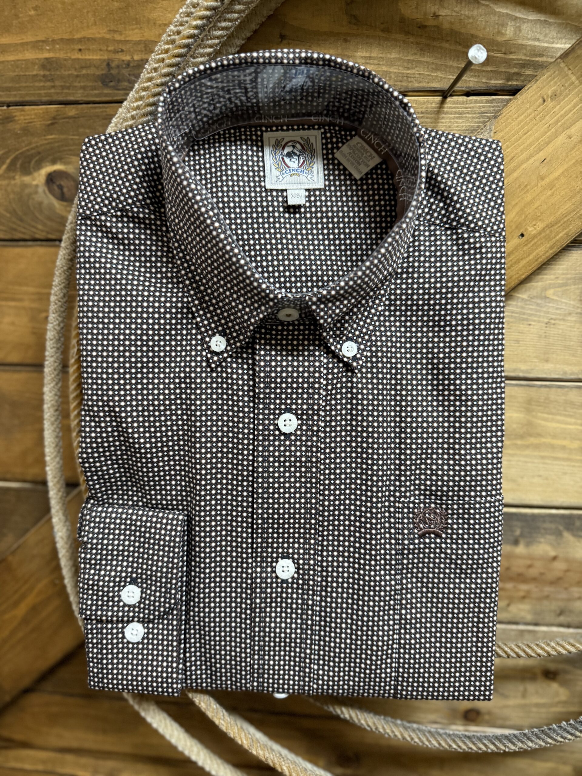 Same classic fit new classic colors and prints! Neatly patterned dot design in navy and white make up this classic fit long sleeve. White round buttons go down the front, pin down the collar, and adjust the sleeve on a 2 button set. An open front pockets sets on the left side of the chest featuring the Cinch logo embroidered in a brown thread. Wear these any day of the week for any occasion that’s scheduled. Even if its not scheduled, it still fits the occasion!