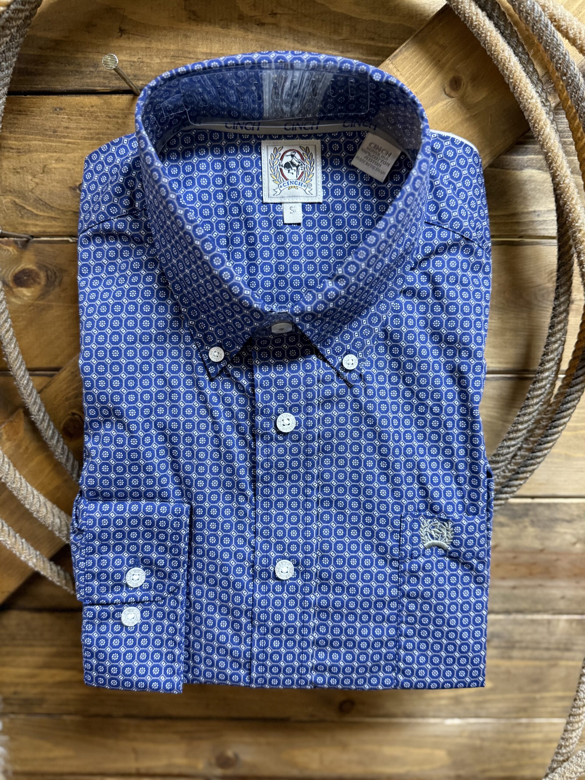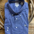 A classic long sleeve by Cinch in a classic blue print. Great subtle design in a blue and grey round print. Classic white buttons line the front, pin down the collar, and adjust the sleeve end on a 2 button set. The open front pocket sets on the left side of the chest displaying the Cinch logo in a grey embroidery. Great look and print for day to day work or save it for a special event! Pairs easily with a nice vest or sport coat of a solid color. Wear to your liking.