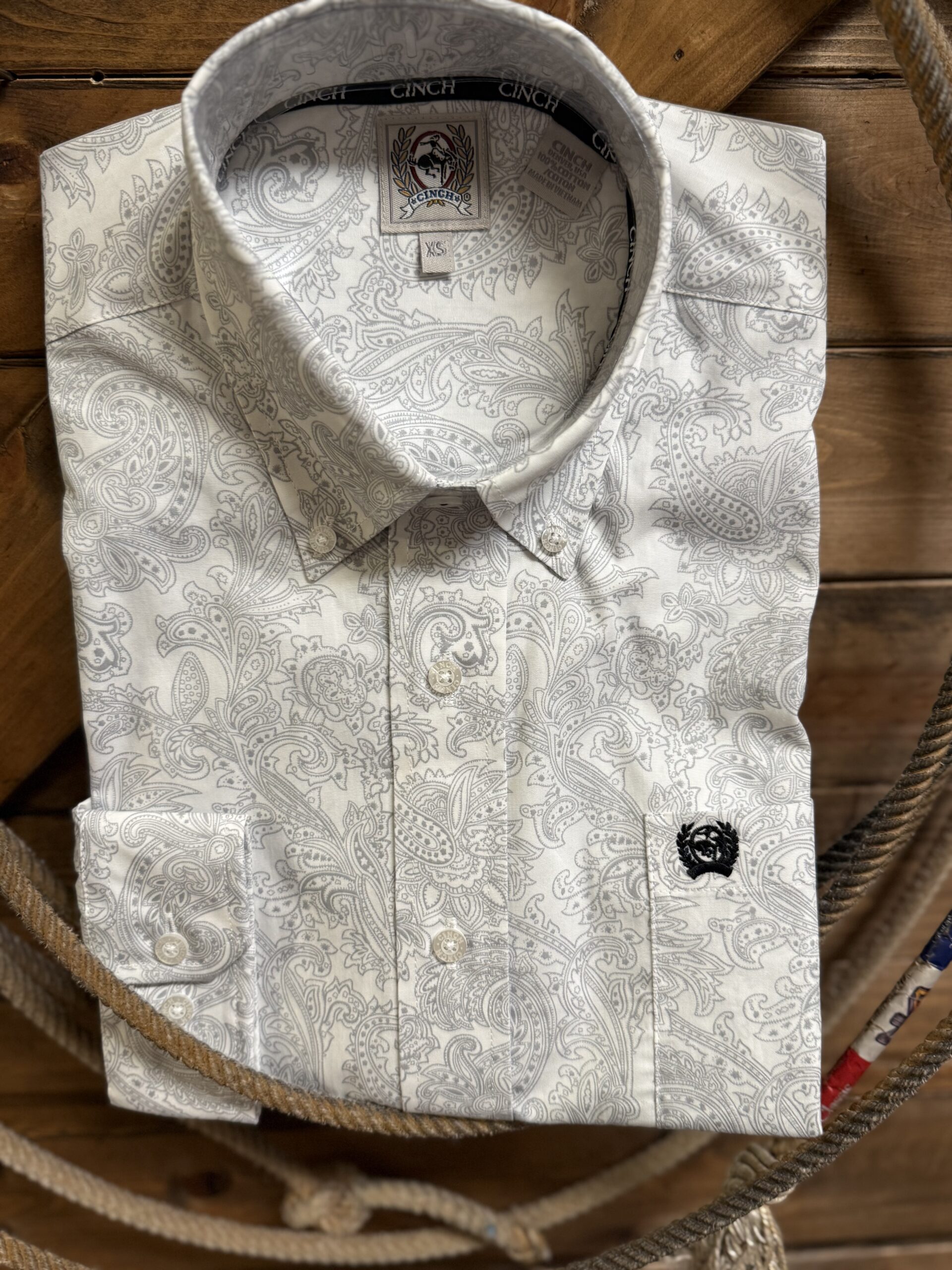 Paisley isn’t just for ladies. The look is great on men. Nice cool white and grey paisley print on this classic long sleeve. Classic white buttons line the front, pin down the collar, and adjust the cuff on a 2 button set. The open front pockets sets on the left side of the chest with the Cinch logo embroidered black. Super sharp look! This shirt pulls any outfit together! Wear it any day of the week, for any occasion, with any color of sport coat! Great universal print to have on hand!