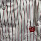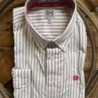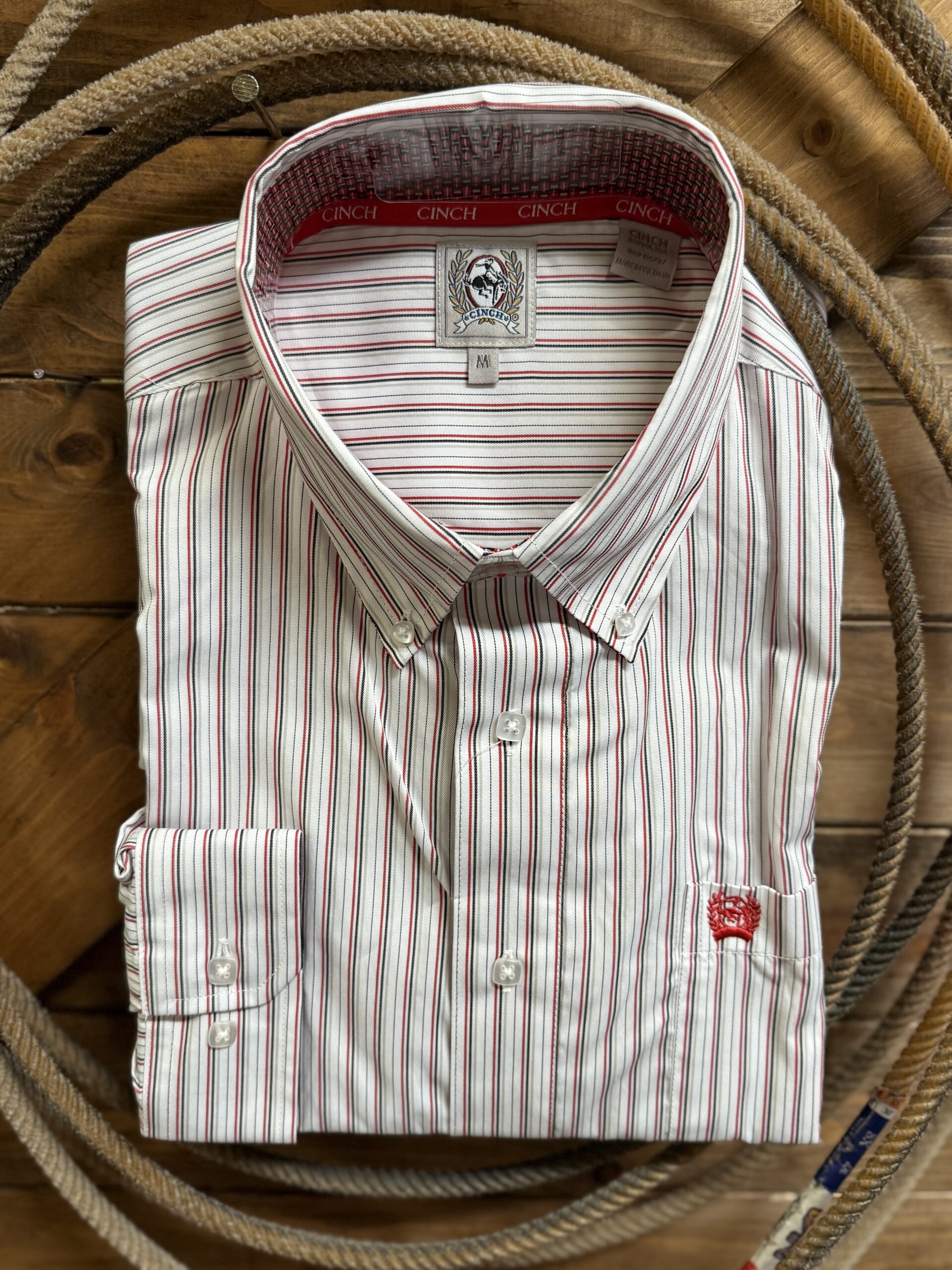 Stripes are a good thing to pair to! If you have a sport coat that’s hard to match look for a good stripe! This one will cover a lot of bases. Pretty mixture of red/blk/white in a pin stripe. Square white buttons line the front, pin down the collar, and adjust the sleeve on a 2 button set. The open front pocket sports the Cinch logo in red embroidery. Good for all days of the week! Just pick the day, its waiting for a day out!