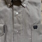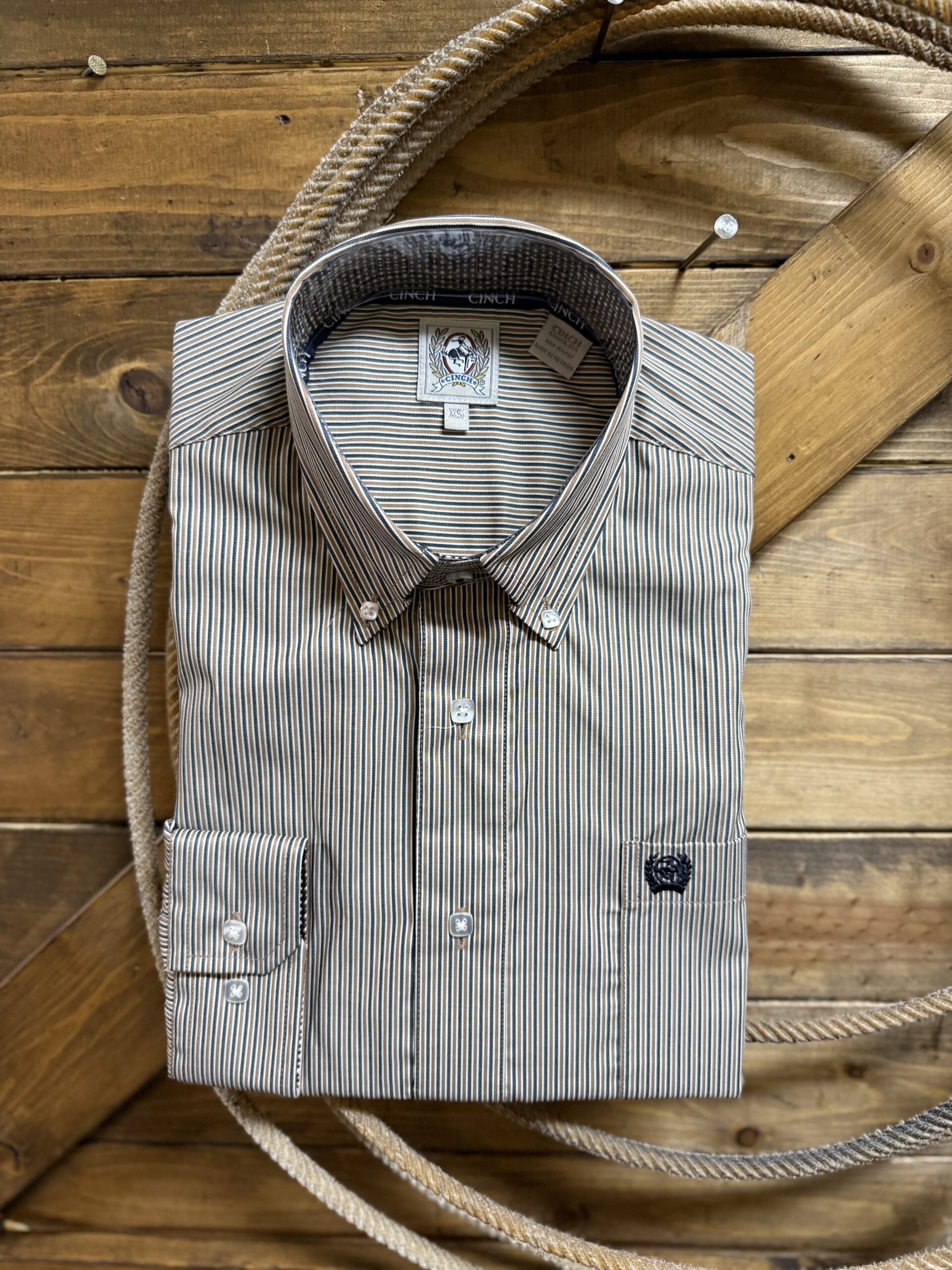 Classics made for everyday wear. Classic fit long sleeve button down in the light weigh Tencel material. Neat brown and navy striped make up the shirt pattern. Designed to be a breathable wear with the same comfort and durability you are used to in a classic. Clear square buttons line the front, pin down the collar, and adjust the sleeve ends on a two button set. The same open front pocket features the Cinch logo in a blue embroidery. A look made for everyday affairs or special occasions the same.